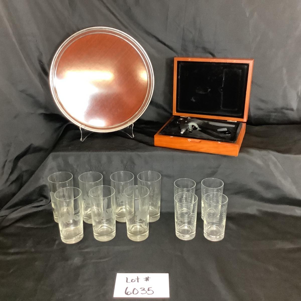 Lot 6035. Lot of Mid Century Pegasus Glass Set, Serving Tray, Wine Opener