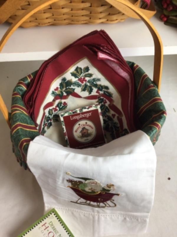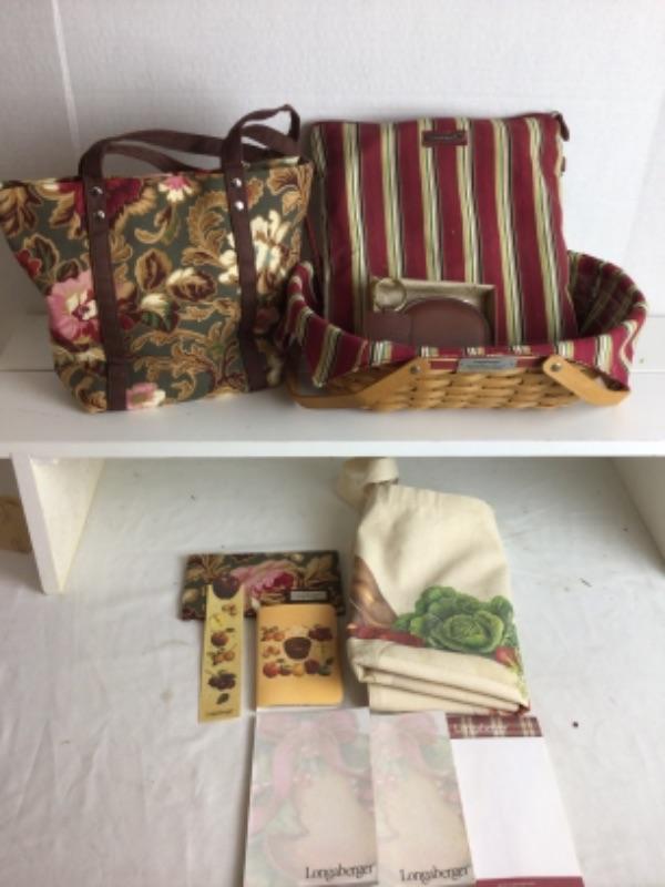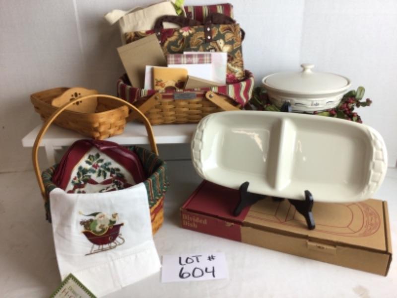 Longaberger Nature’s Garland basket with matching tote bag, Longaberger Homestead shoulder bag with check book cover, coin purse and key chain. Longaberger holiday basket, Cracker basket, Divided Dish, Covered casserole dish and more
