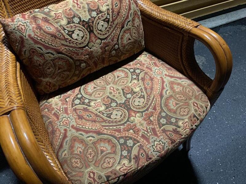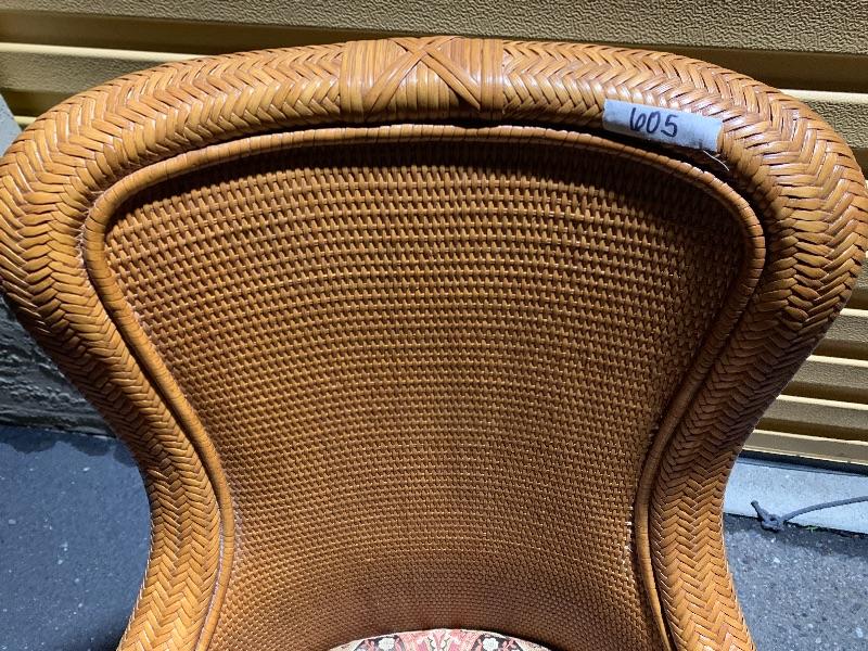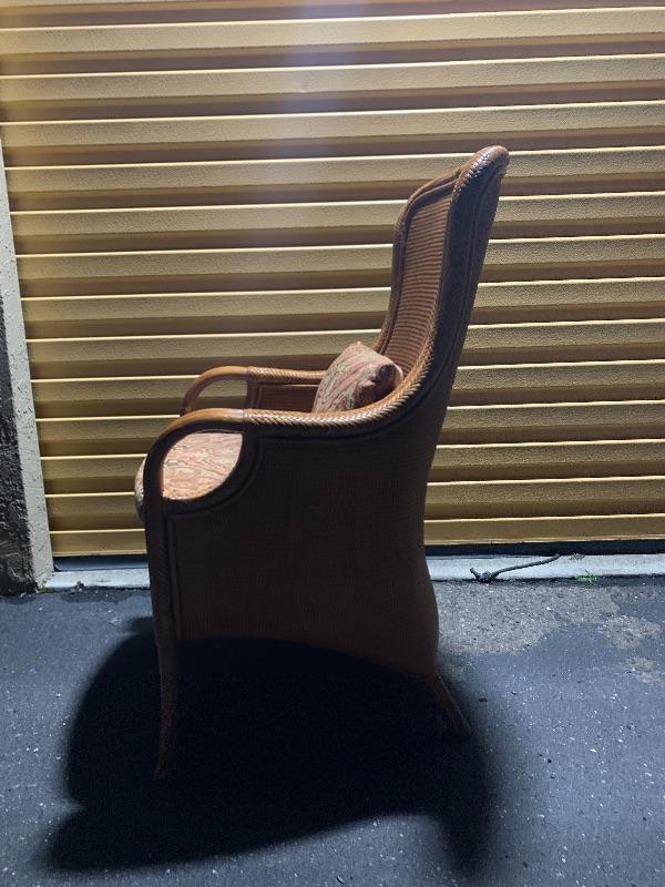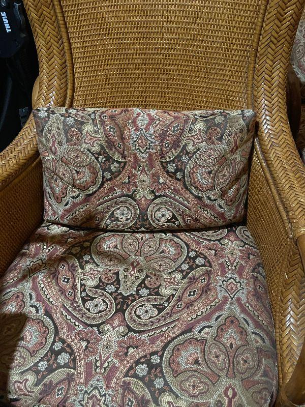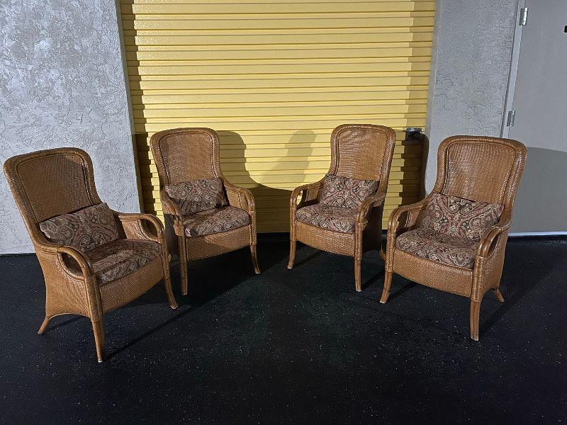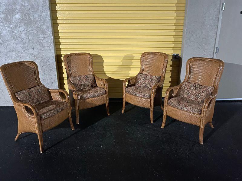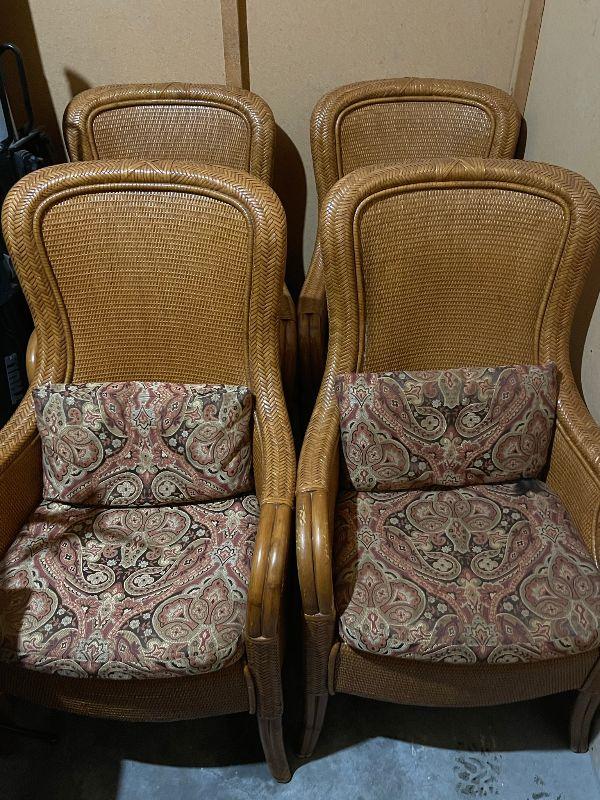 4 Tommy Bahama wicker chairs with cushions. Very comfortable one with slight unnoticeable tear. 41” high backs x 20” high seat x 24.5”