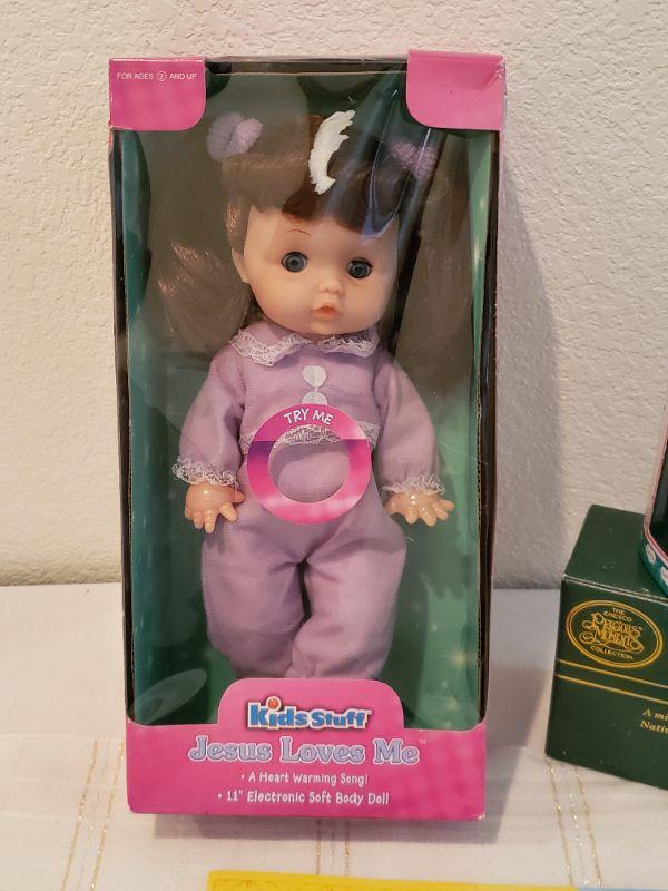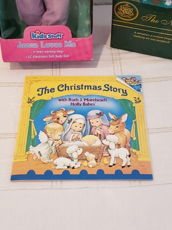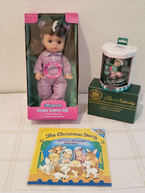 Lot 606: NEW Jesus Loves Me Doll, Precious Moments Nativity and The Christmas Story BookGift Lot