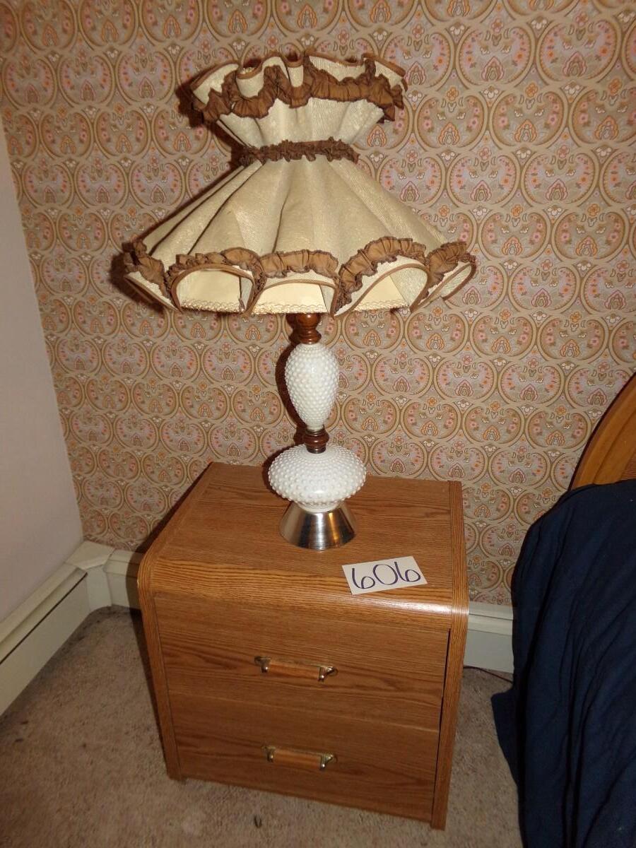 2 DRAWER NIGHTSTAND WITH COLONIAL AMERICAN STYLE LAMP AND SHADE. MILK GLASS BASE.