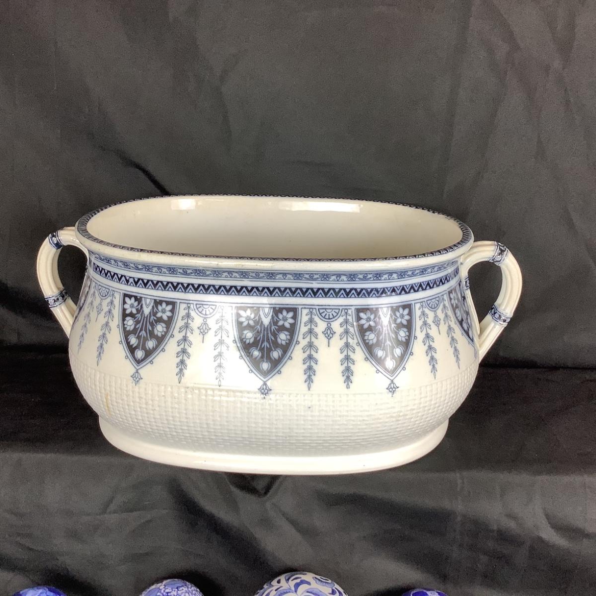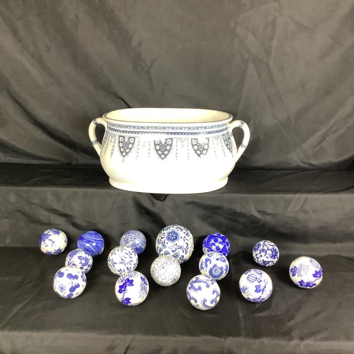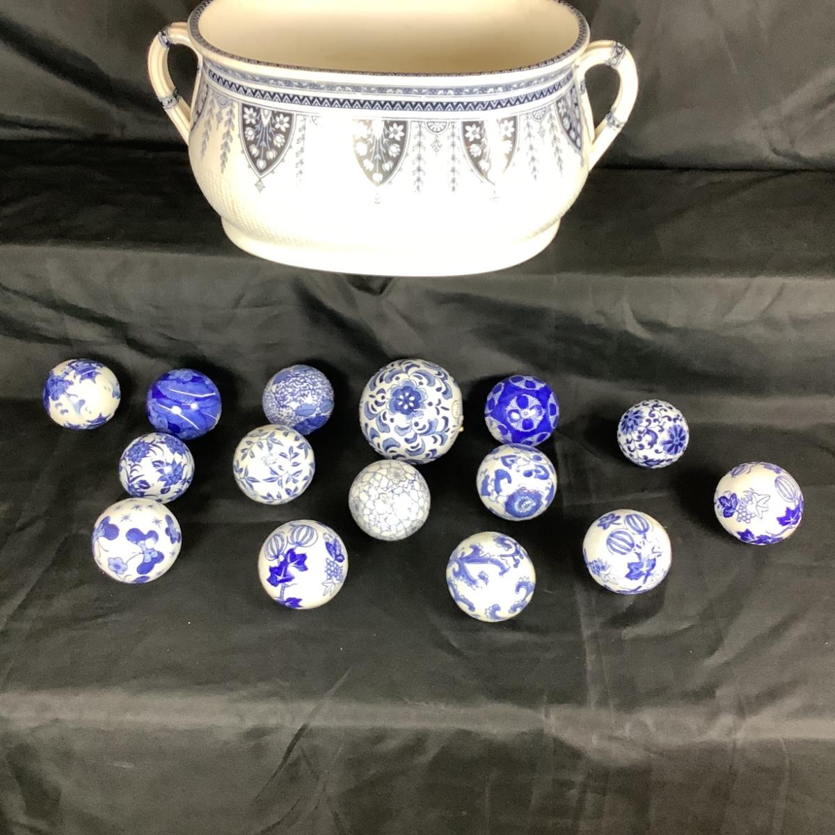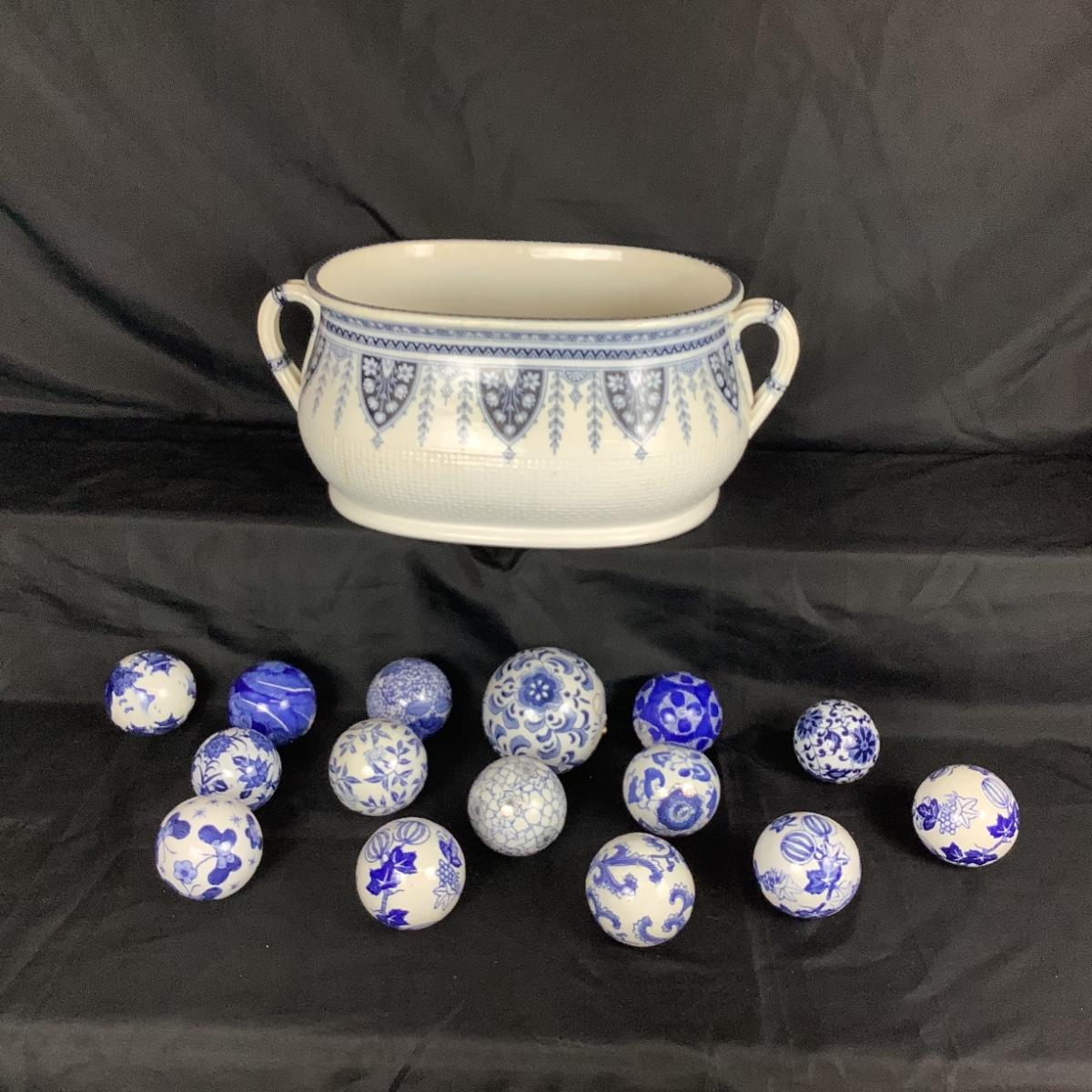 Lot 6060. Vintage Large Blue / White Ironstone Foot Bath & Decorative Blue / White Porcelain Balls