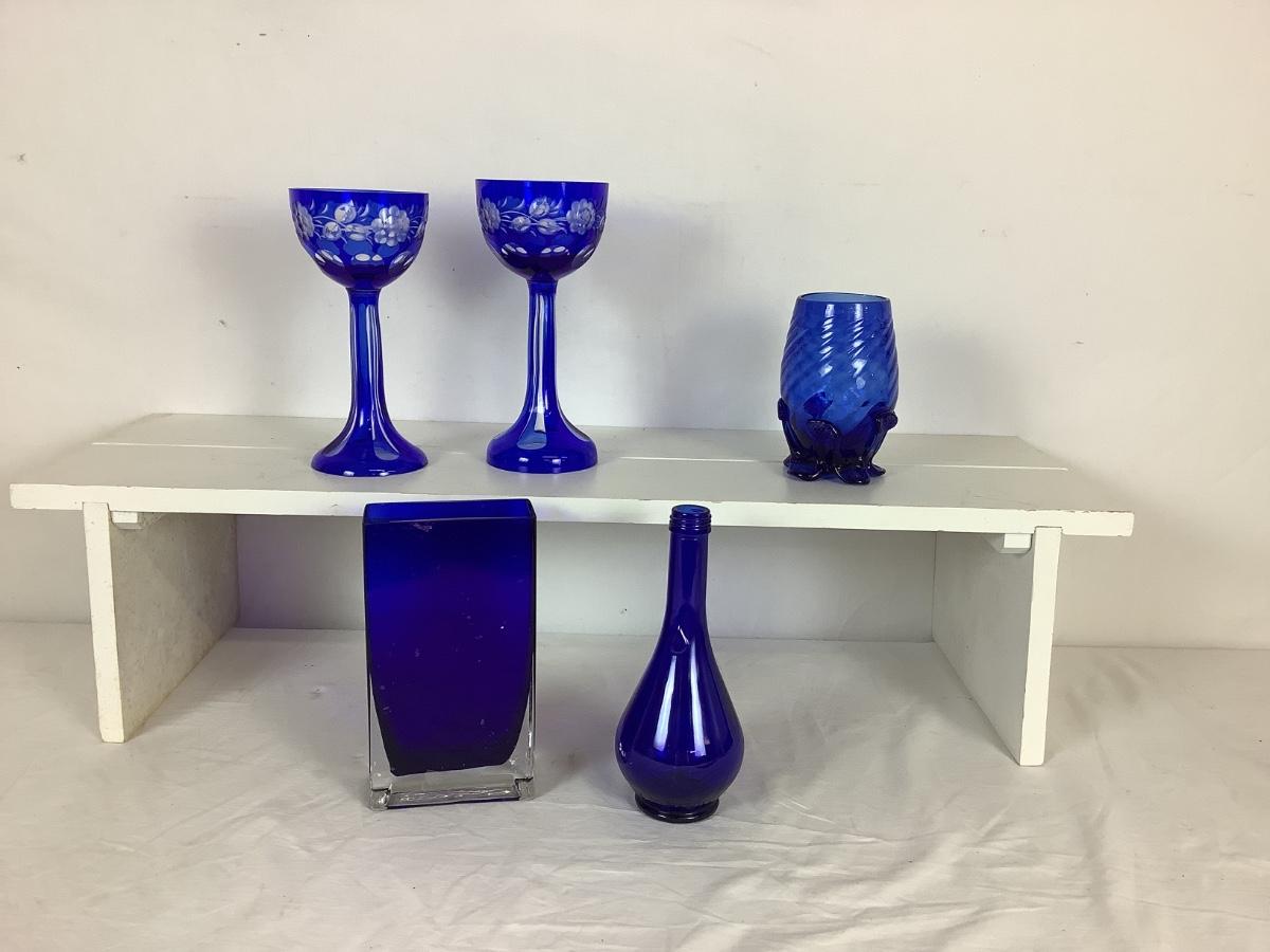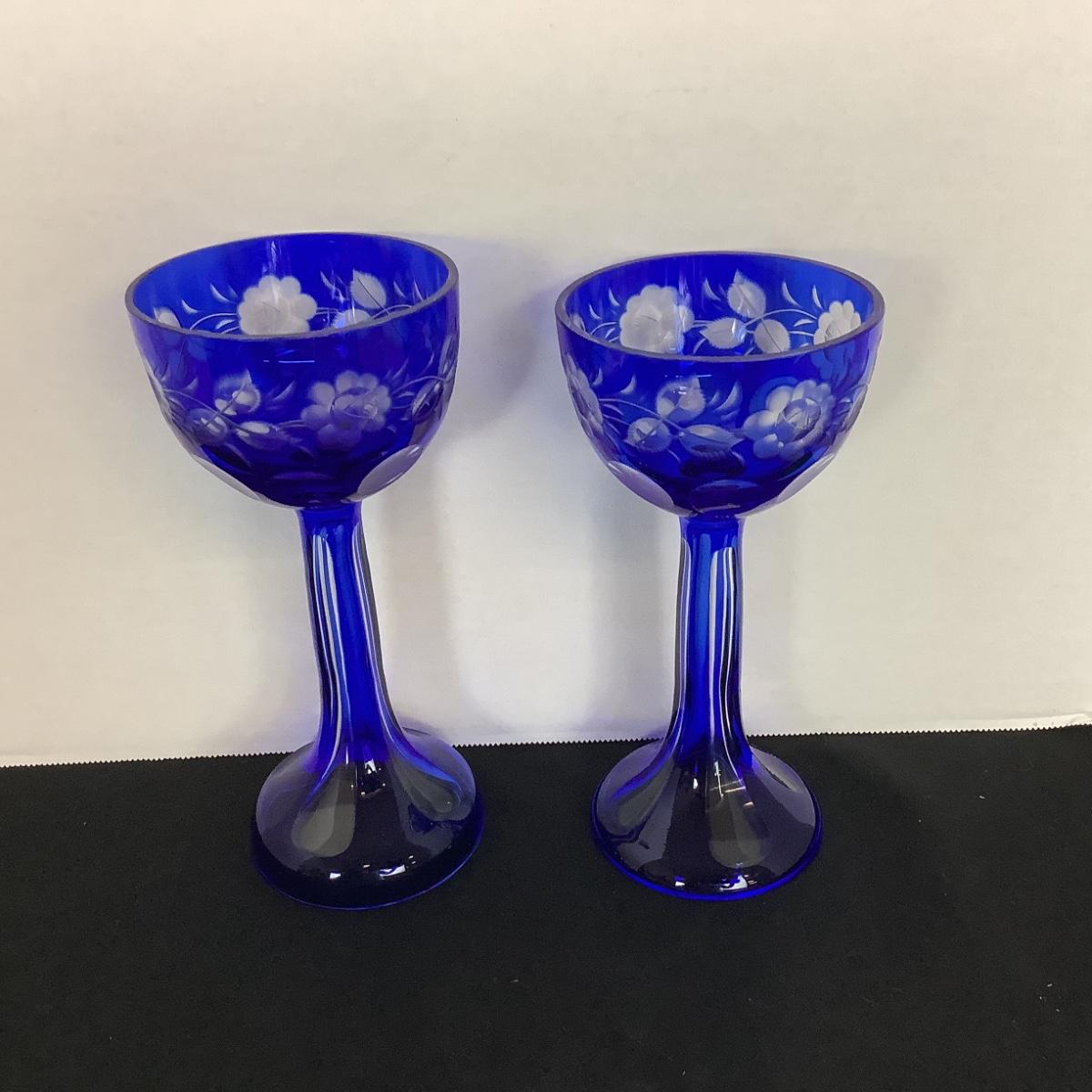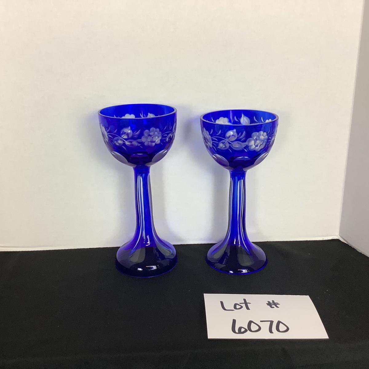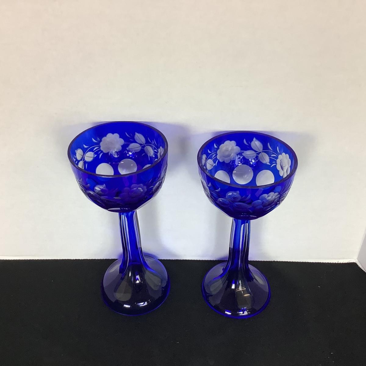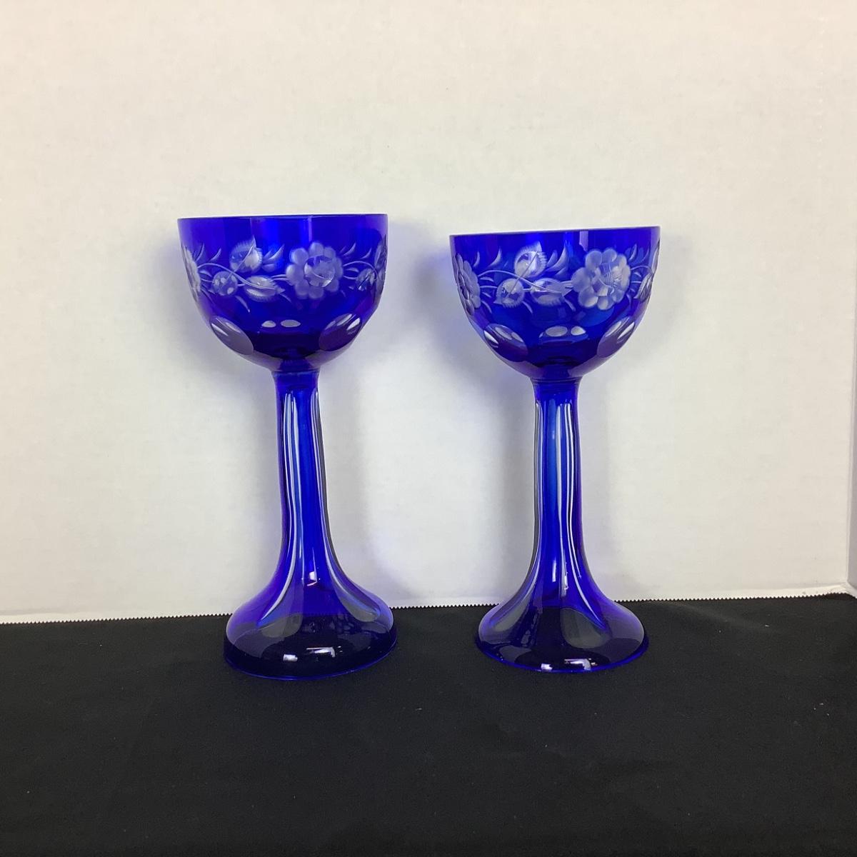 Lot 6070 Pair of Vintage Bohemian Czech Crystal Cobalt Blue Stemware with Vases