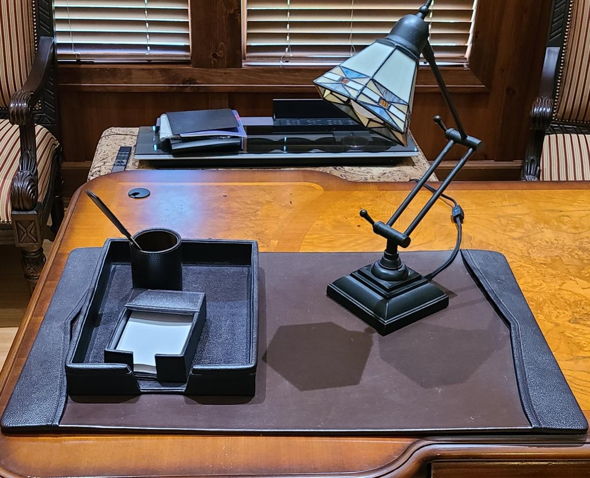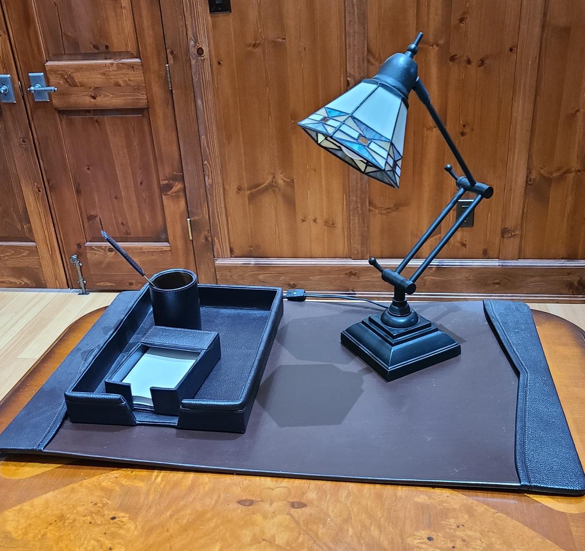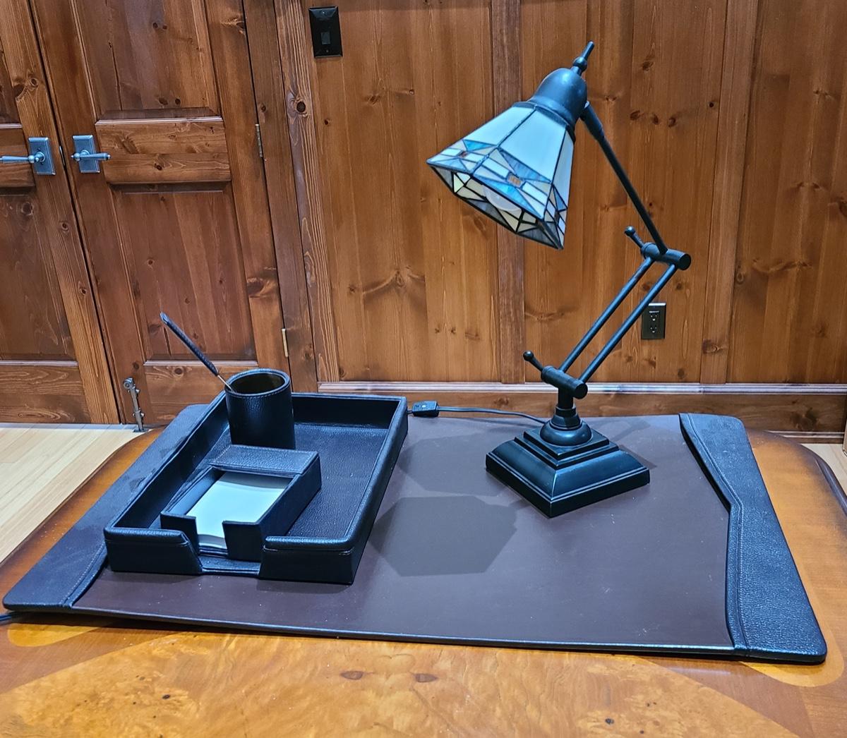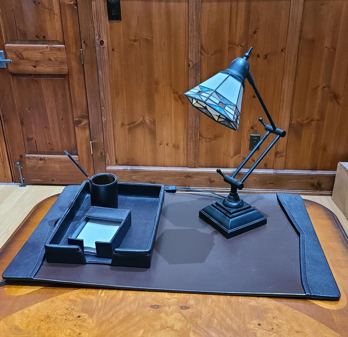 Lot 112: Leather Bey-Berk Desk Set and Stained Glass Styled Accent Lamp