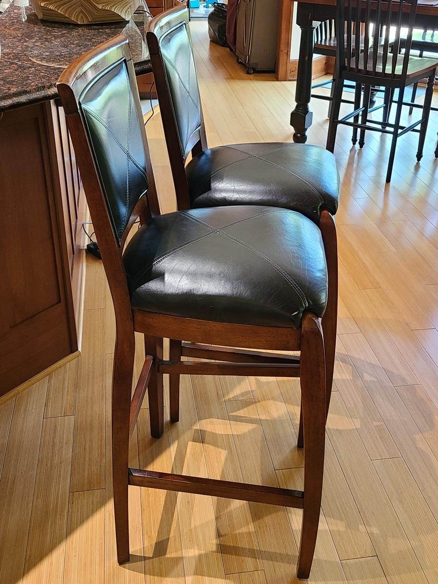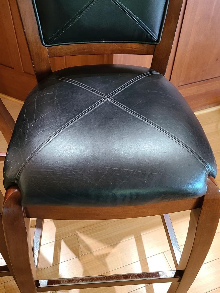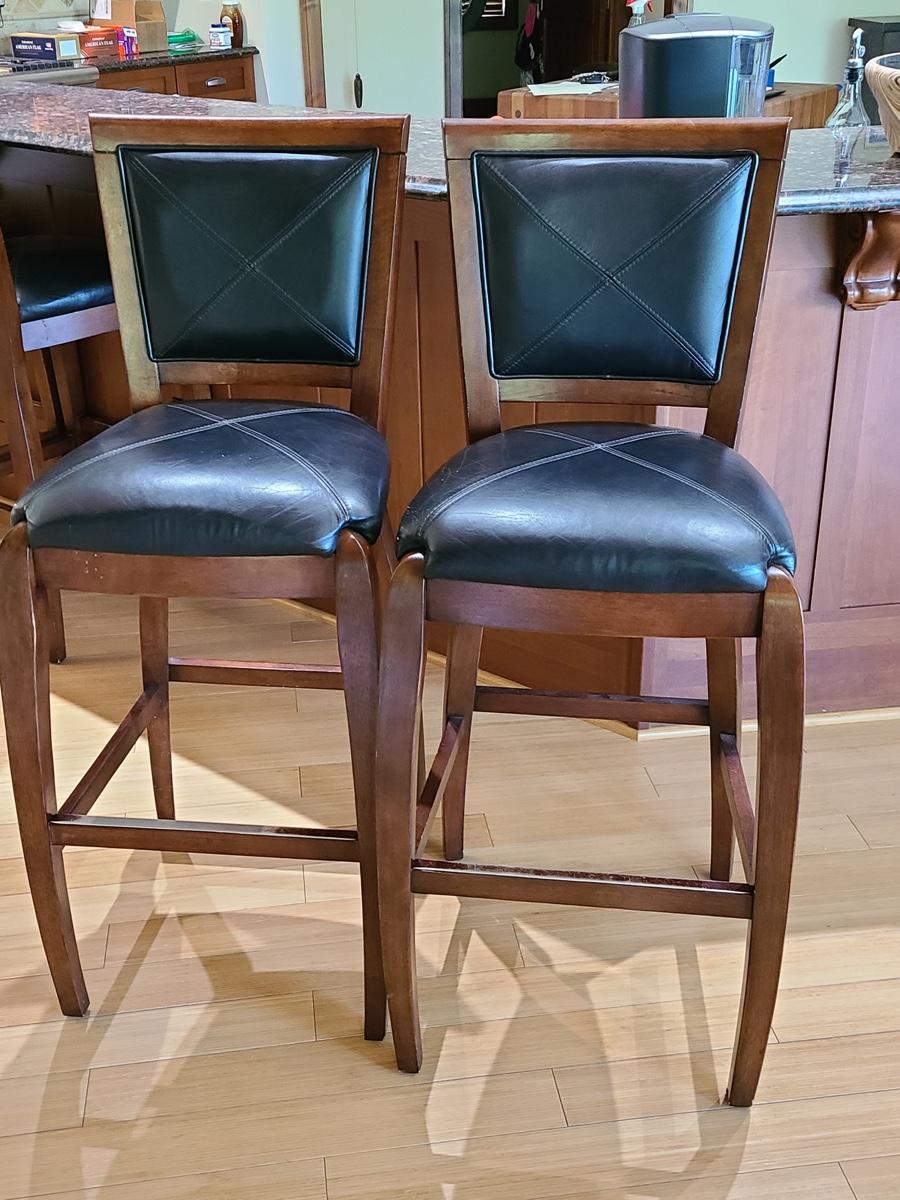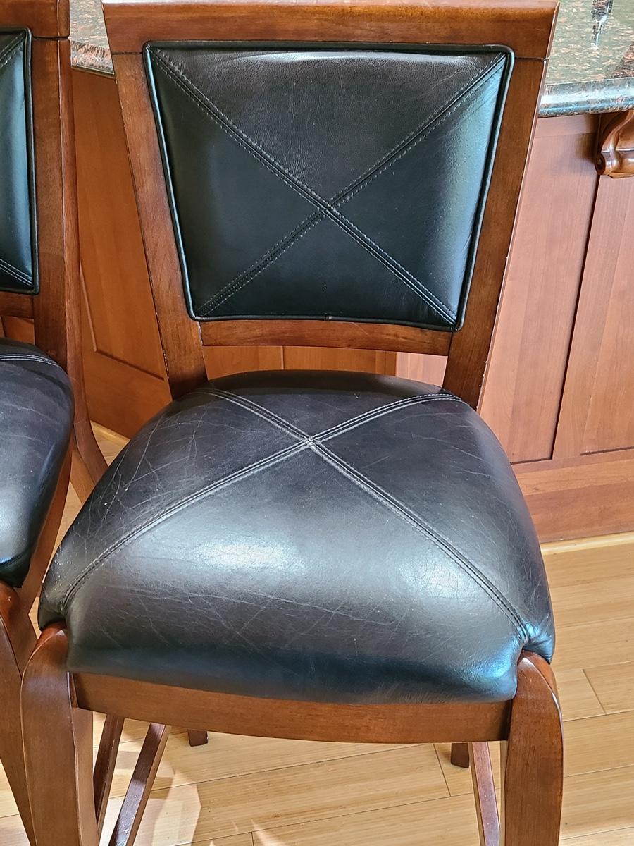 This is a very nice pre-loved set, it does show wear to the wood legs, and minor wear to the leather. Leather when used or aged has lines and surface "cracks" that give it worn in character. These are not new, but have a ton of life left, are very comfortable and ready for their next home at the kitchen counter or bar! Please see all pictures as they are the best representation of the items. The pictures show condition, measurements if taken, and what is included in the lot. Due to the large amount that we photograph and the time frame, we are not always able to take measurements. All items unless noted, are pre-owned and have been used. If you purchased furniture, you must bring help. We do not allow one person to carry large furniture out on their own. Bring help, tools and a truck for the safety of our clients homes, and your personal safety. Company policy. Thank you.