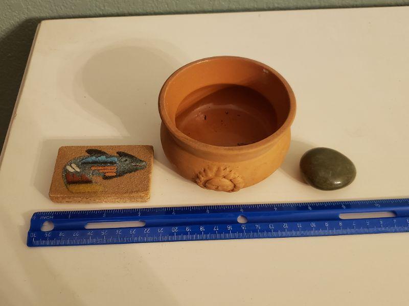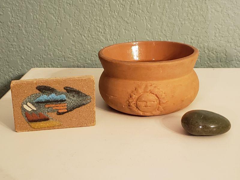 Lot 608: Sand painting Magnet, Ceramic Vessel & a Worry Stone