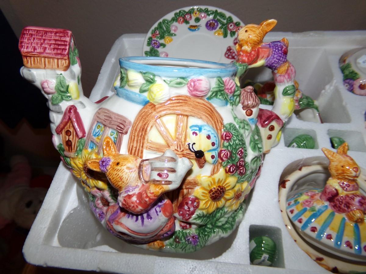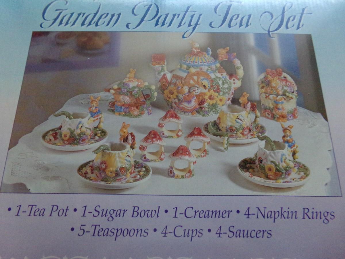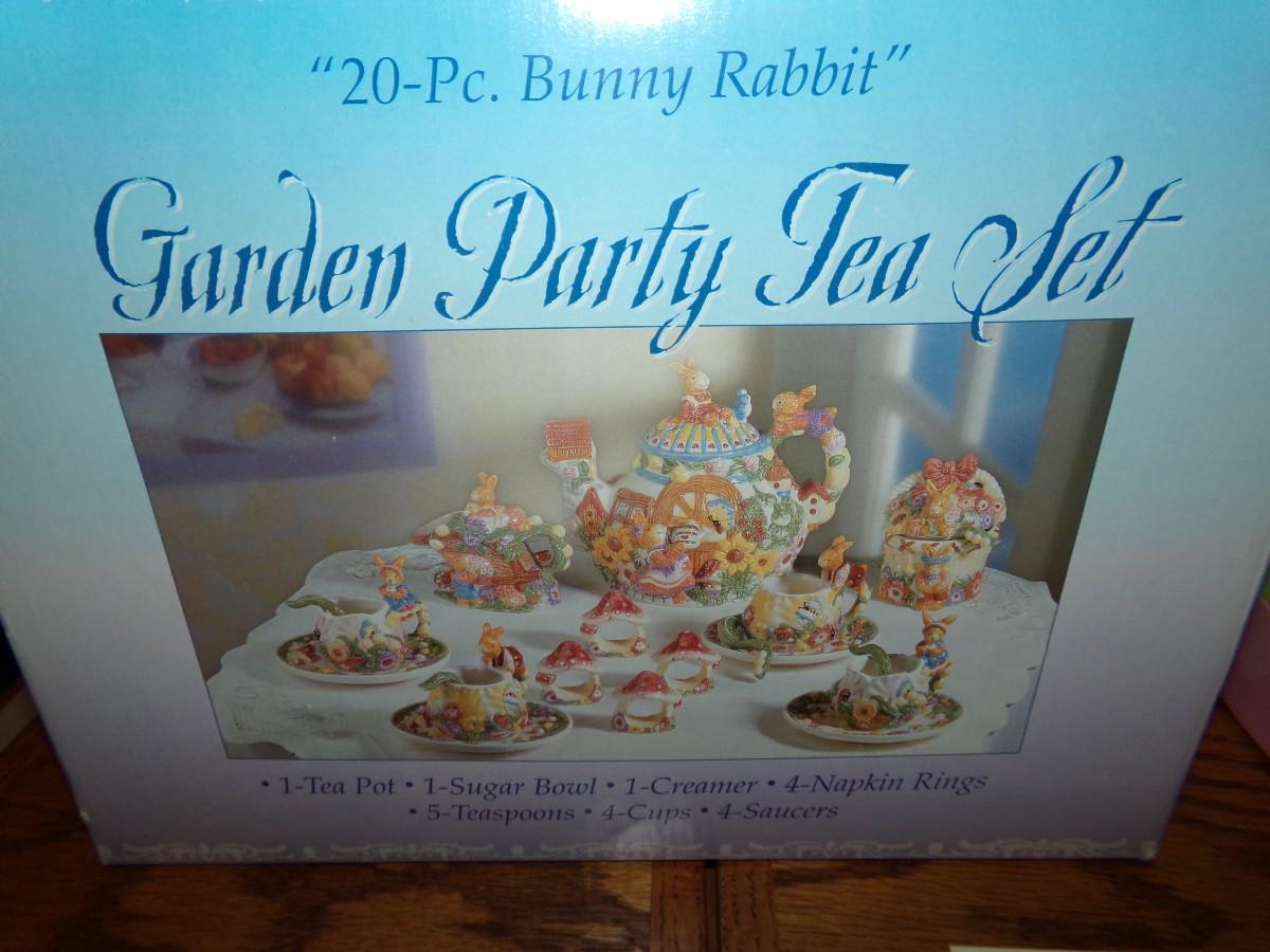 20 PC BUNNY RABBIT GARDEN PARTY TEA SET AND PORCELAIN TEA SET. BOTH IN ORIGINAL BOXES. BOTH LOOK TO BE NEW.