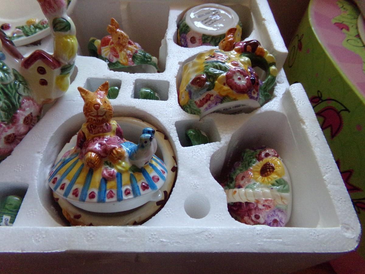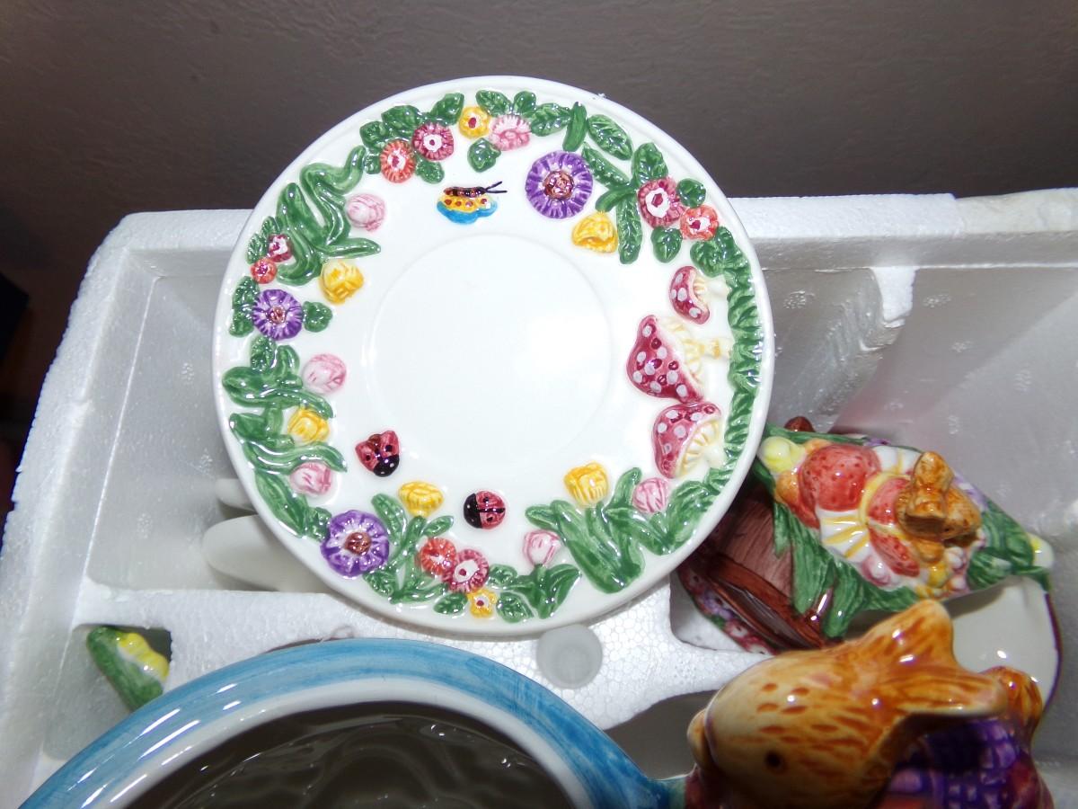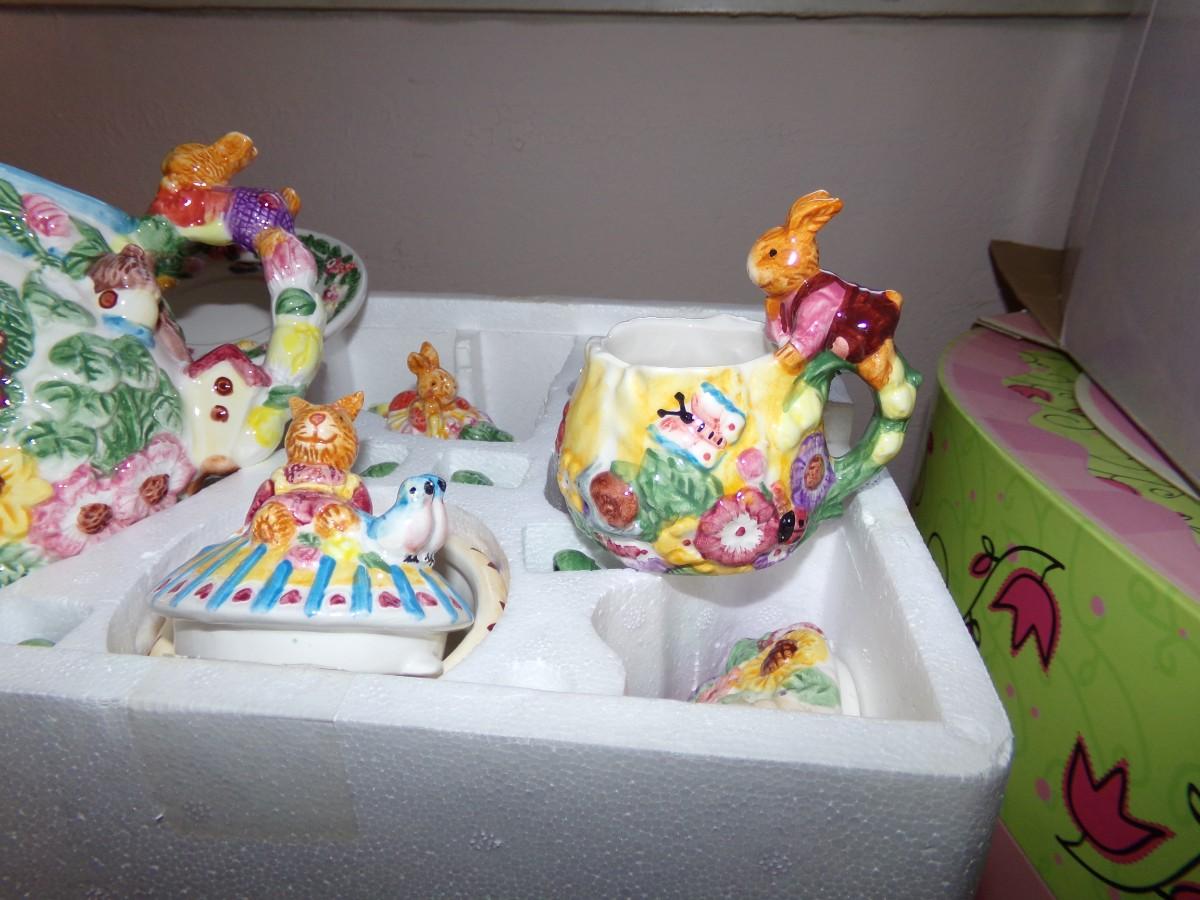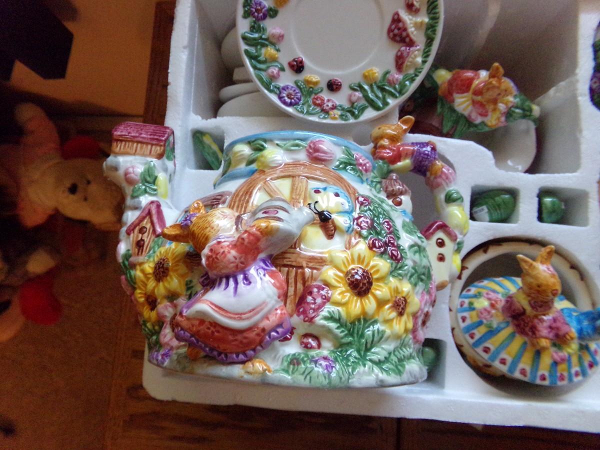 20 PC BUNNY RABBIT GARDEN PARTY TEA SET AND PORCELAIN TEA SET. BOTH IN ORIGINAL BOXES. BOTH LOOK TO BE NEW.