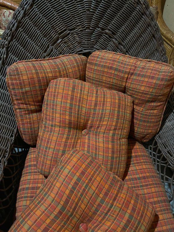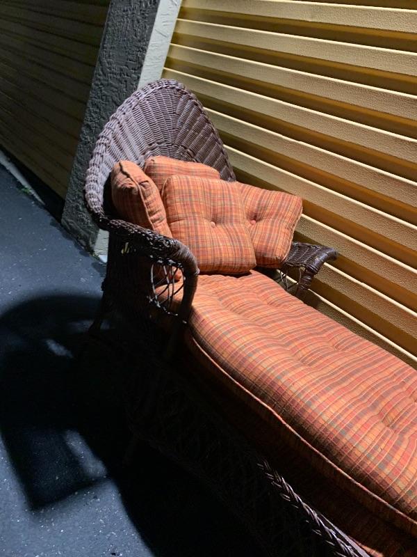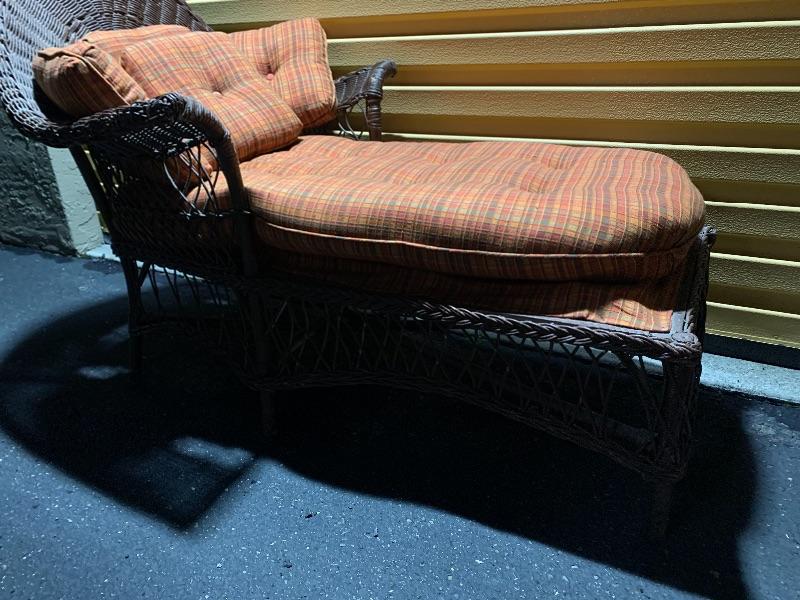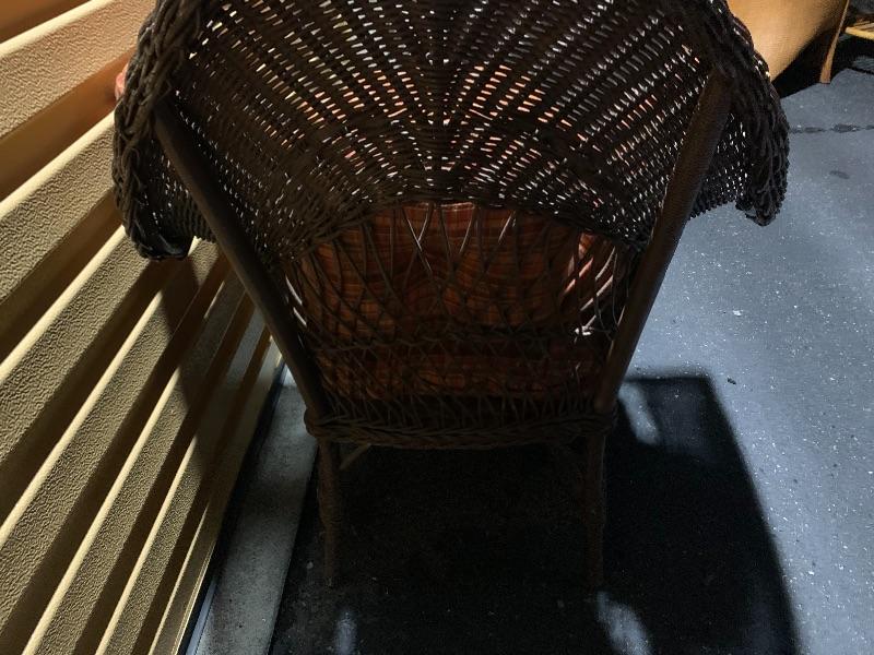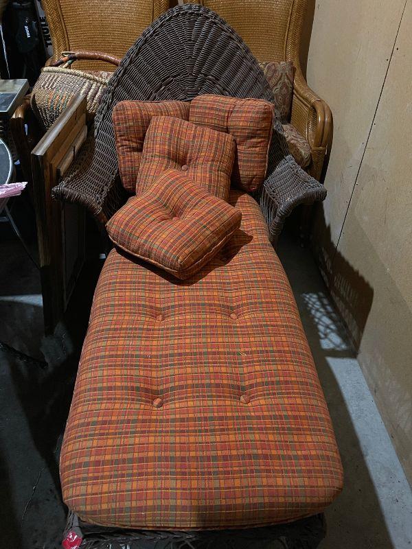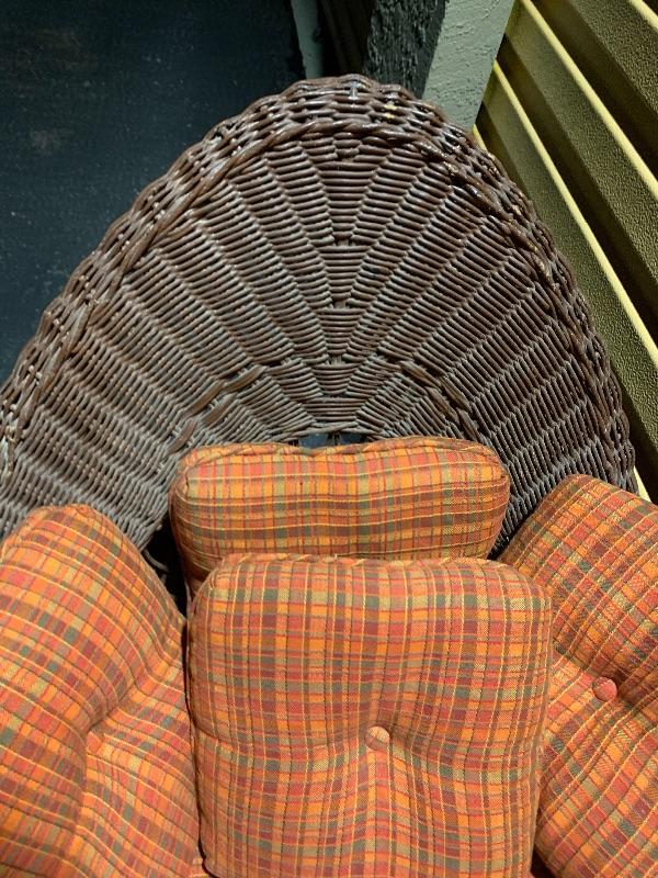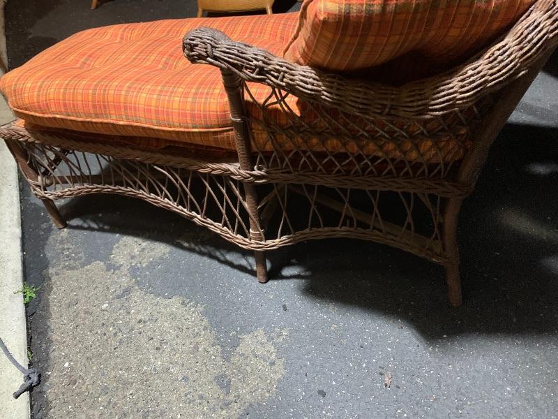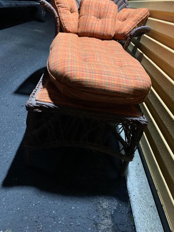 Wicker lounge chair with cushions front height 19” back height 38” x 56” x 21”