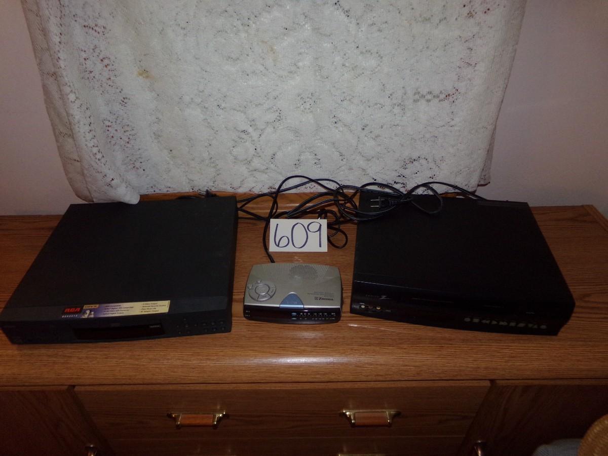 RCA DVD PLAYER, ZENITH 4 HEAD VCR AND A EMERSON CLOCK RADIO WITH BATTERY BACK UP.