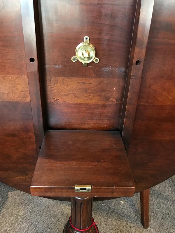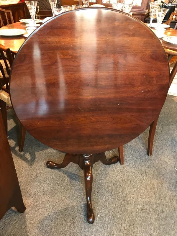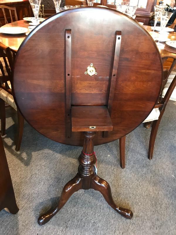 Beautiful sold mahogany tilt top table by Harden Furniture. Brass tilt latch. Turned fluted pedestal with Queen Anne tripod legs. 27 1/2" D x 29" H
