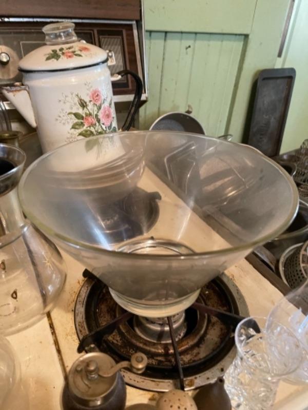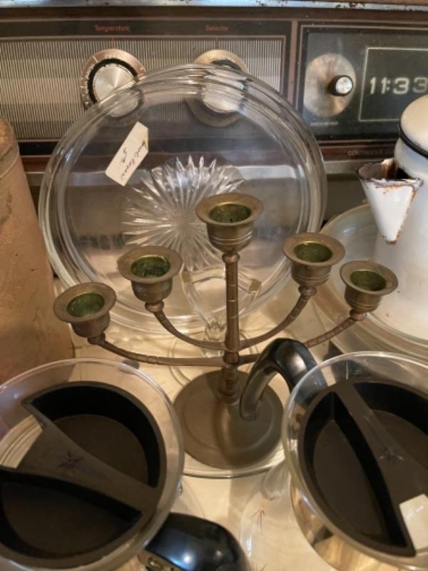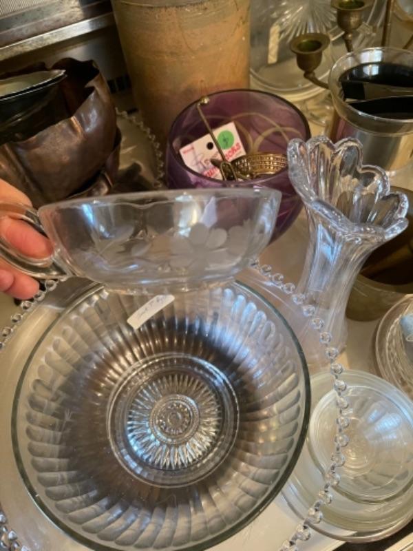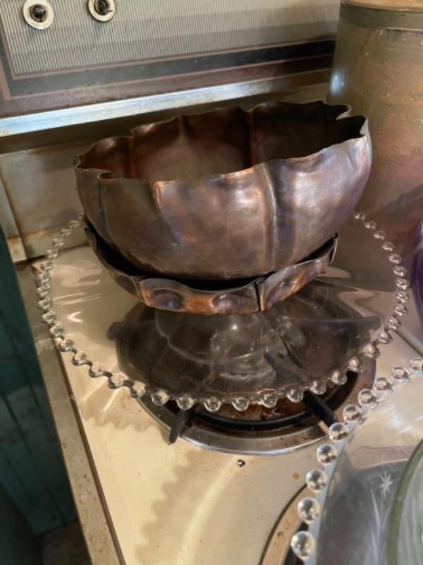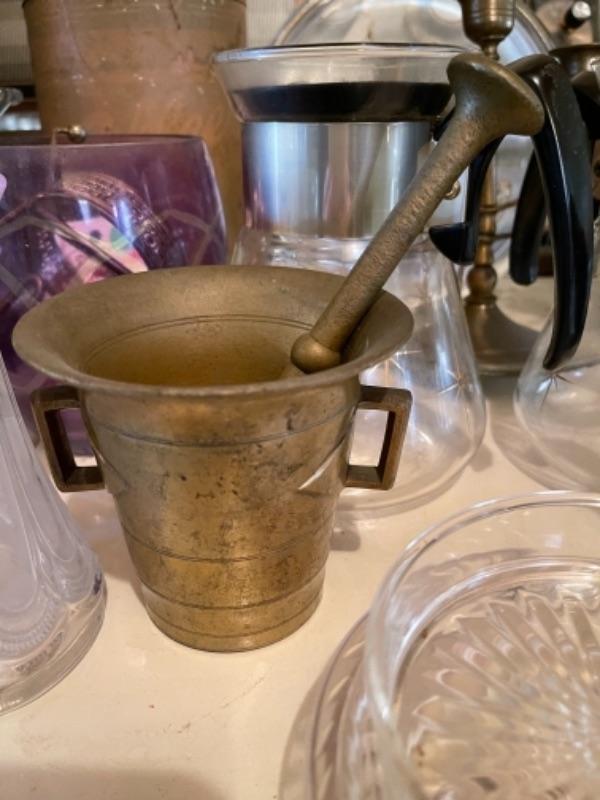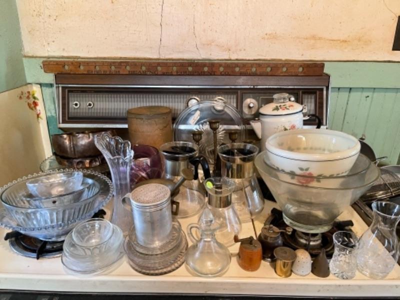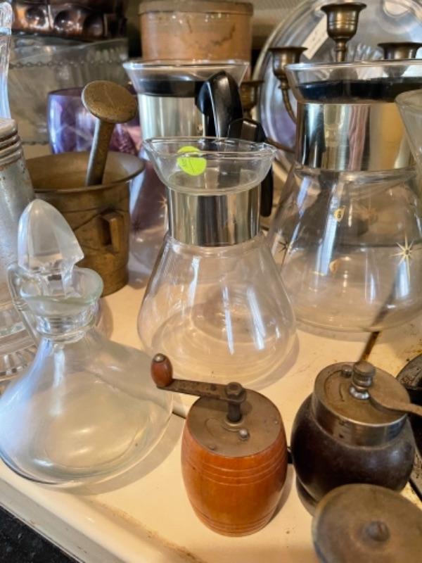Lot 60K. Large assortment of glass kitchenware“”coasters, cruets, vases, salt/pepper, Pyrex coffee servers, candelabra, hammered copper, cake stand, Pyrex bakeware, salad bowls, canister, etc.--$60