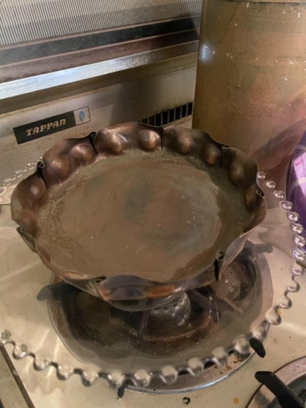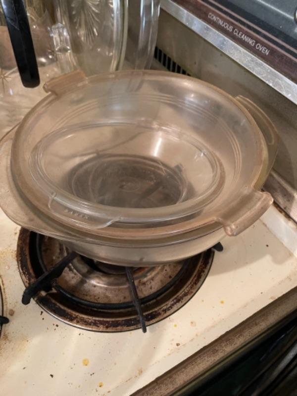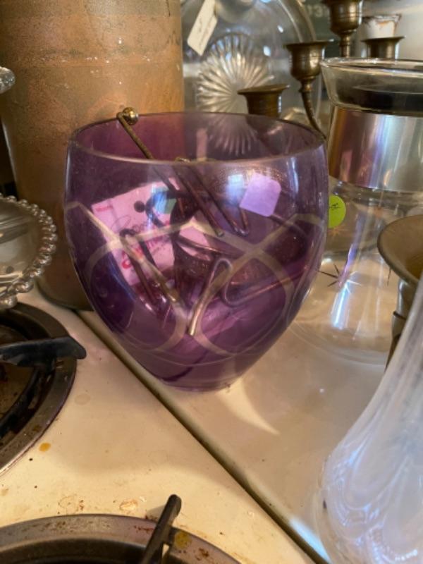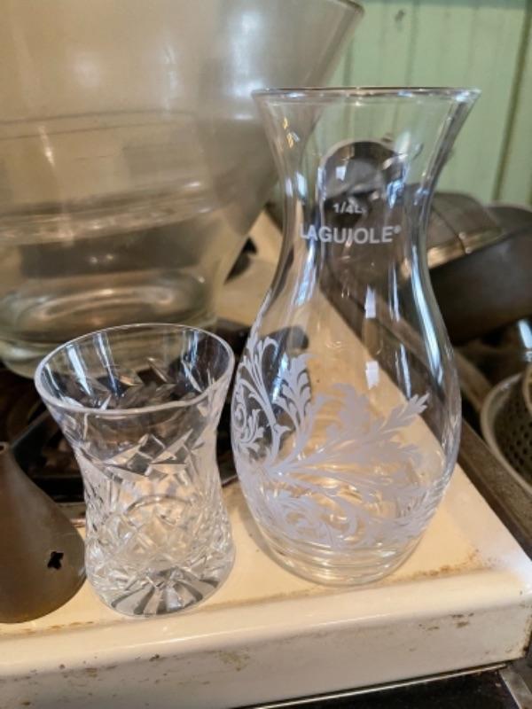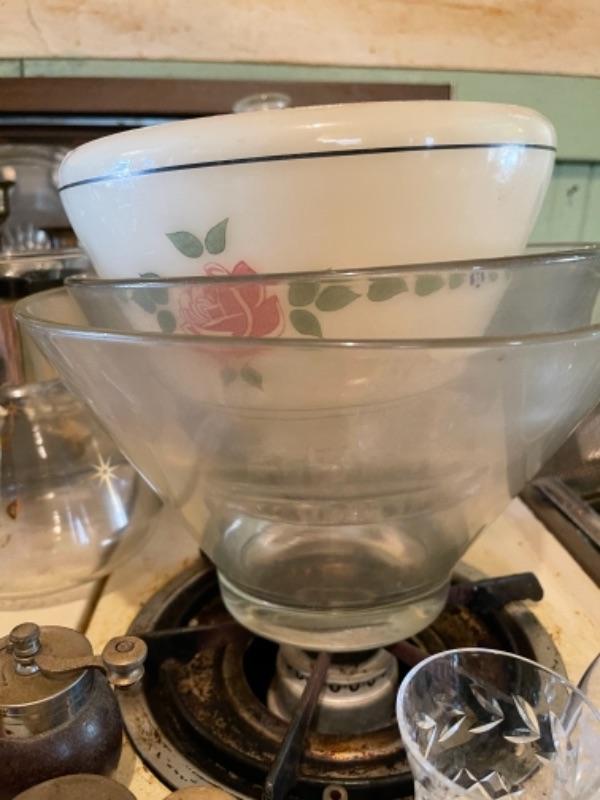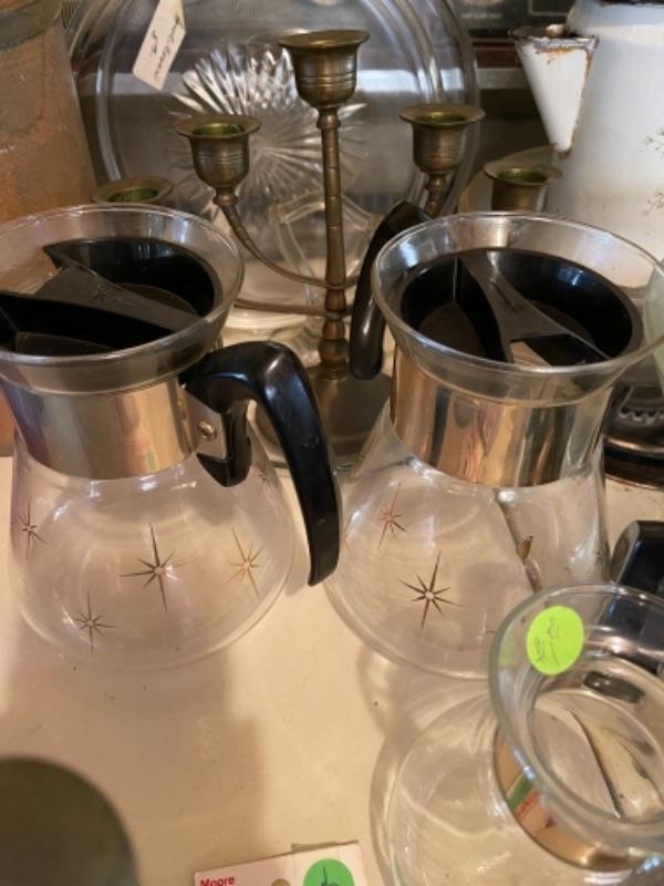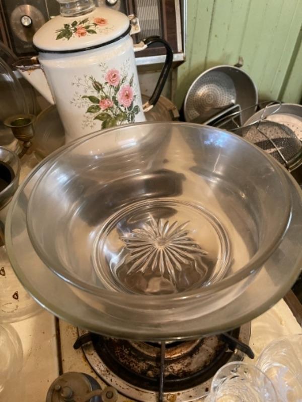 Lot 60K. Large assortment of glass kitchenware“”coasters, cruets, vases, salt/pepper, Pyrex coffee servers, candelabra, hammered copper, cake stand, Pyrex bakeware, salad bowls, canister, etc.--$60