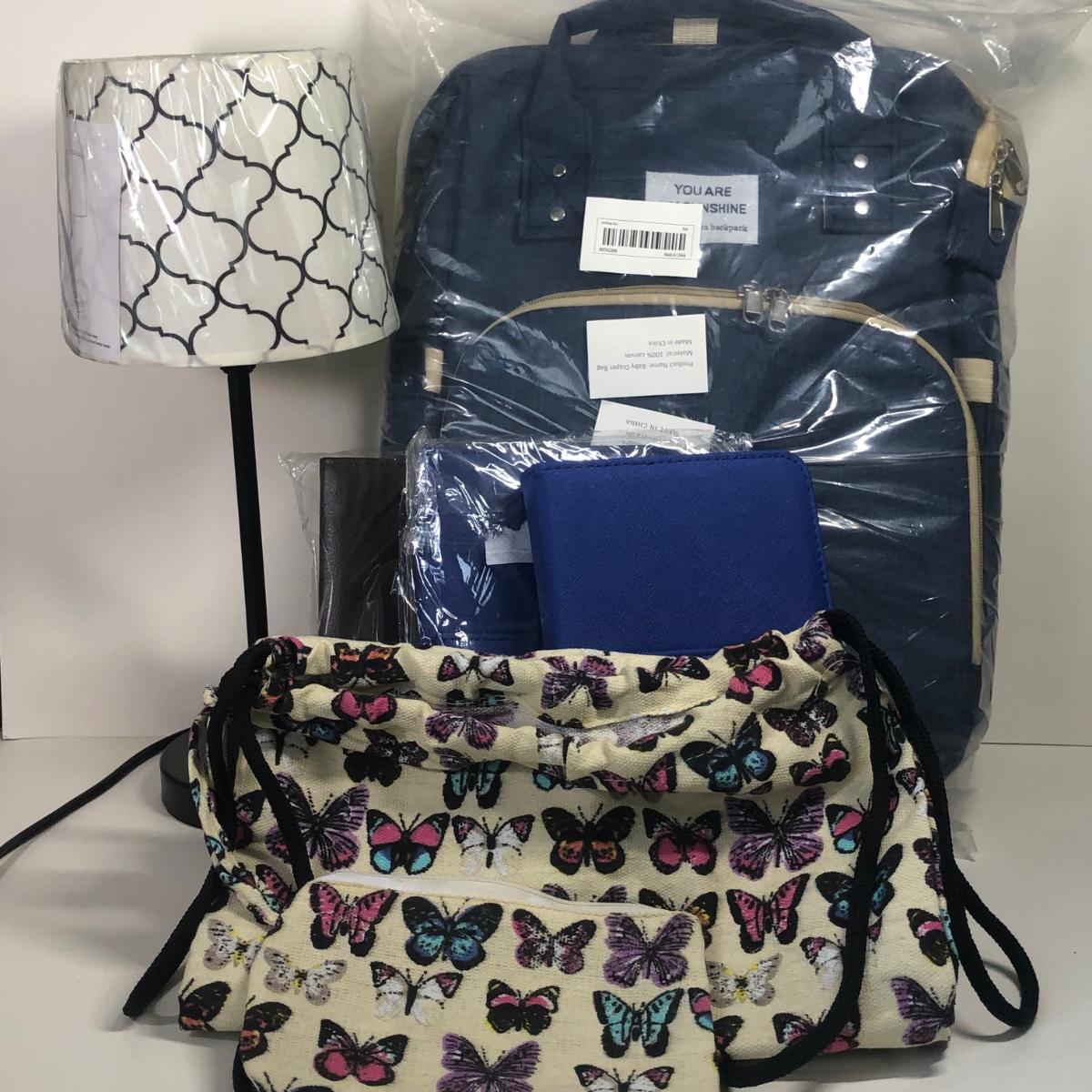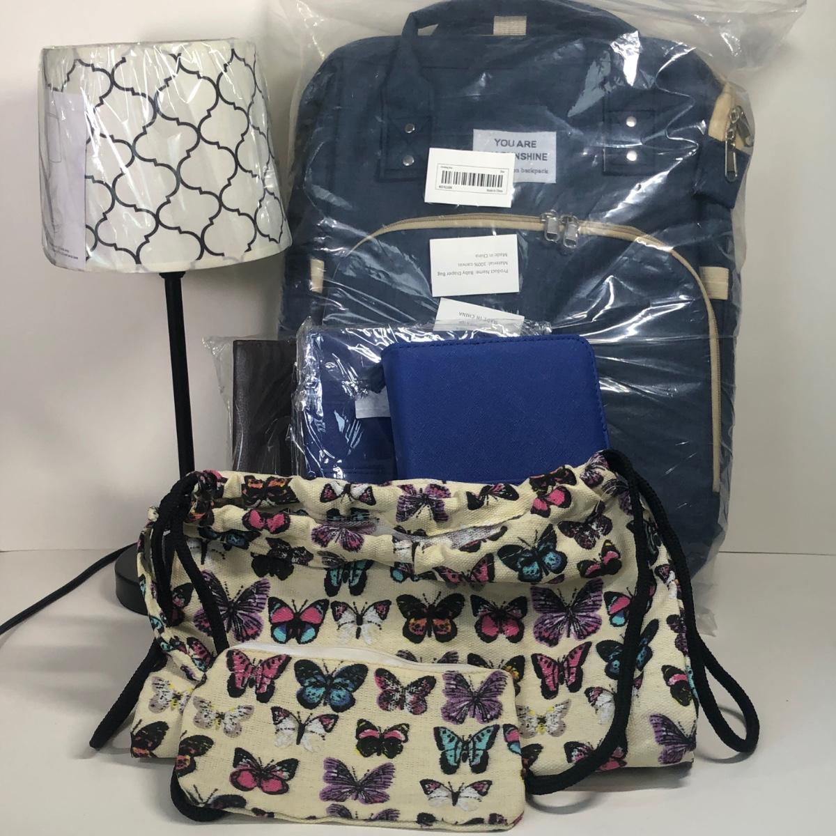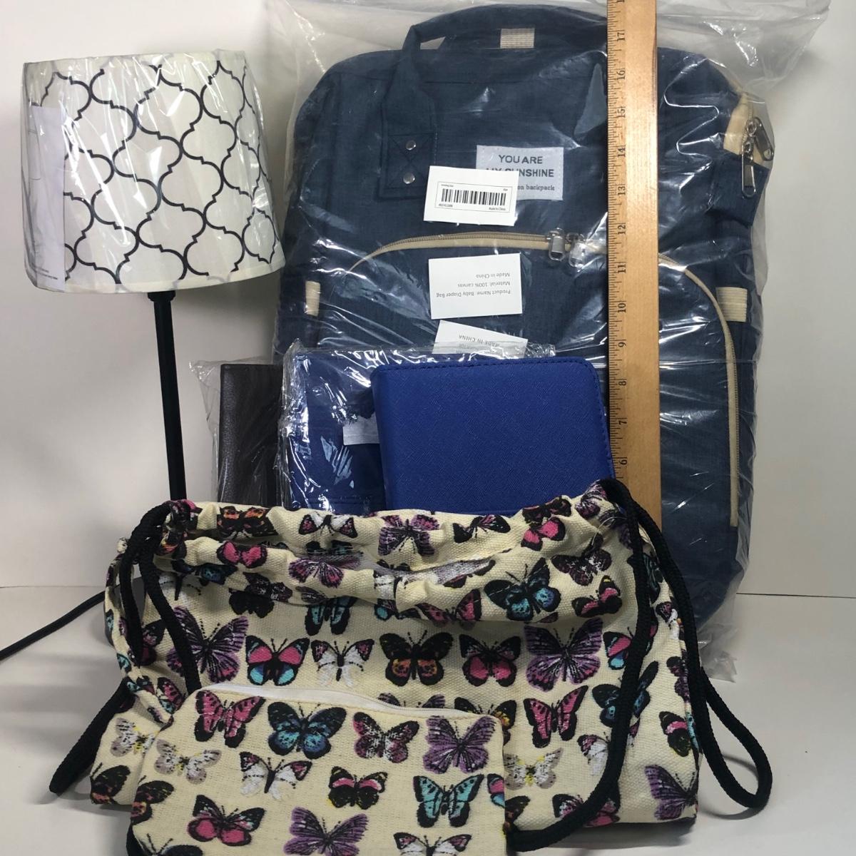 LOT 60M: Young Fashion Backpack, Butterfly Drawstring Bag, Tablet Cases & Lamp