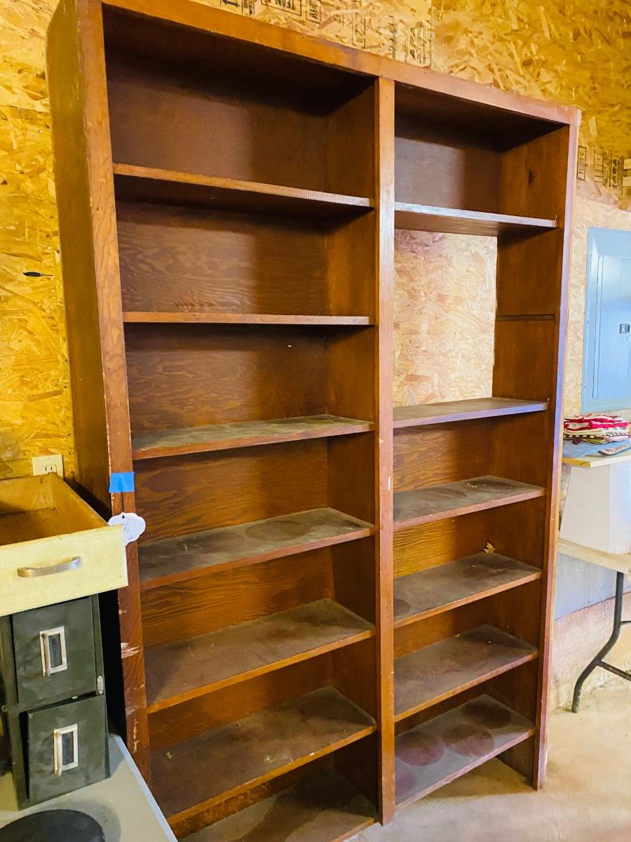 - Tall wood shelf has a metal