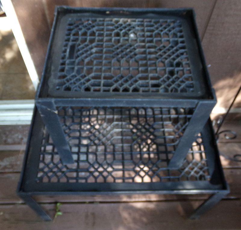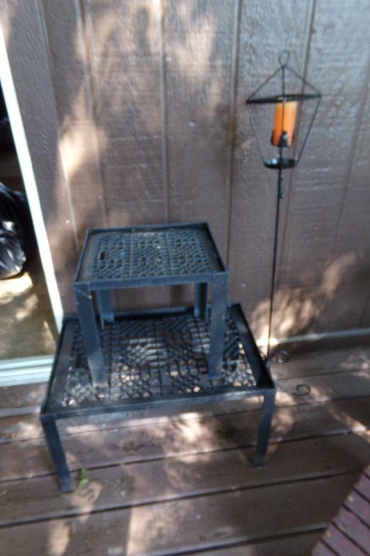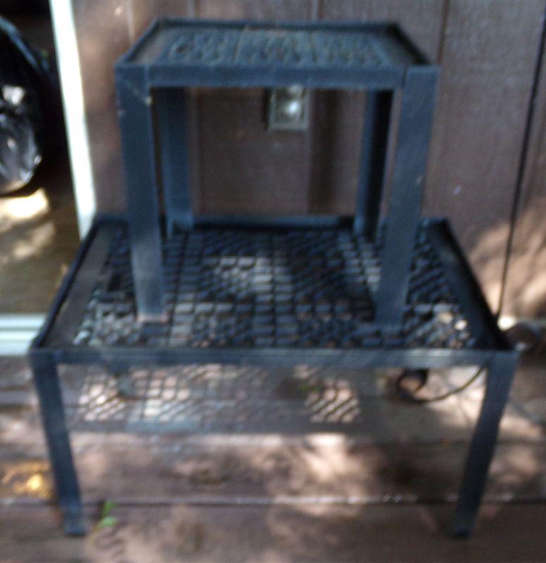 2 HEAVY IRON PATIO SIDE TABLES. IT LOOKS LIKE THEY USE TO HAVE A PIECE OF GLASS ON TOP BUT WORK AS-IS 25"X17"X14" AND 14"X12"X14"