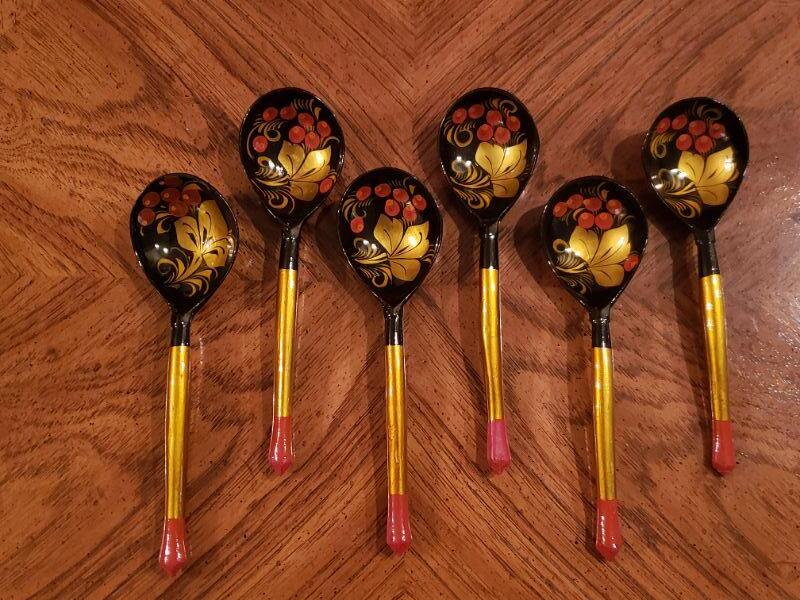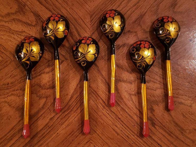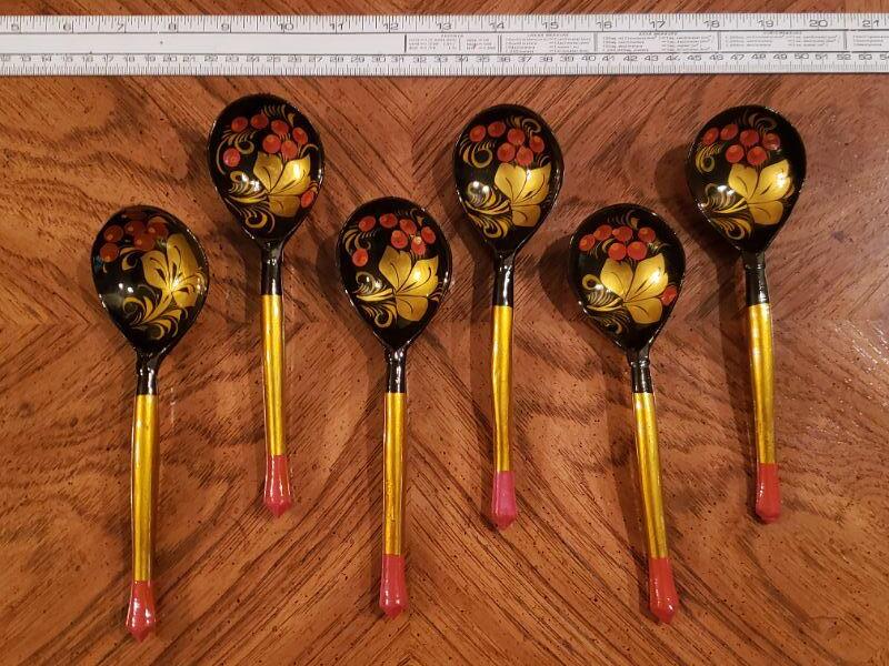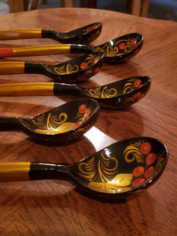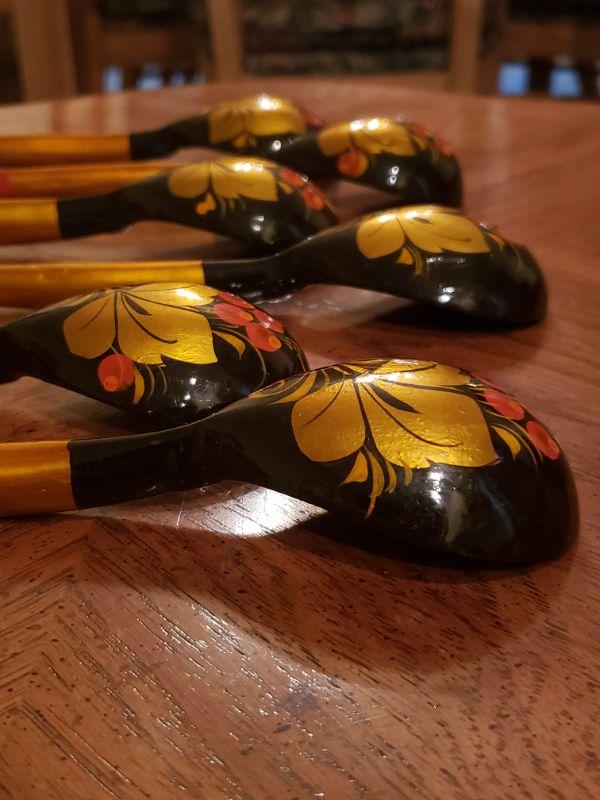 Lot 61: Lacquered Russian Khokhloma ladles/Spoons/Scoops (6)