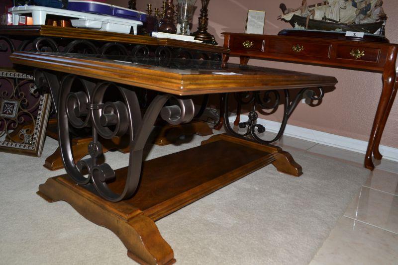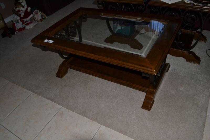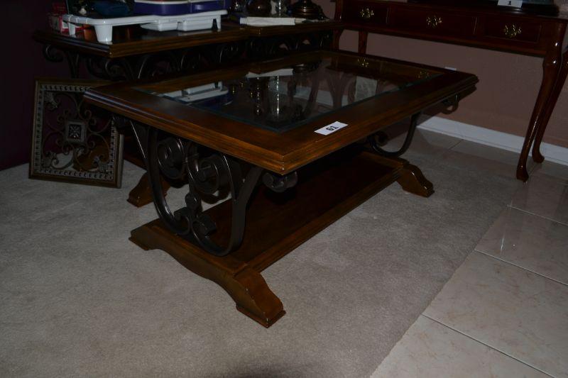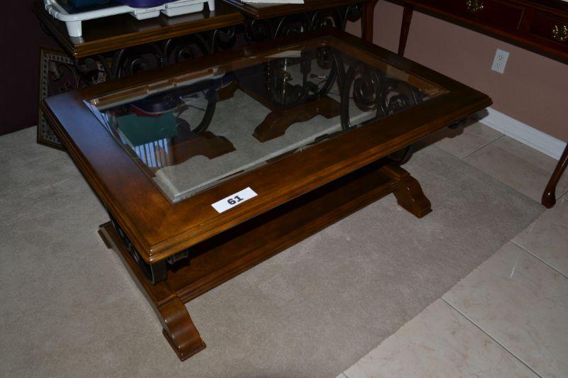 LOT 61 GLASS, WOOD AND METAL COFFEE TABLE