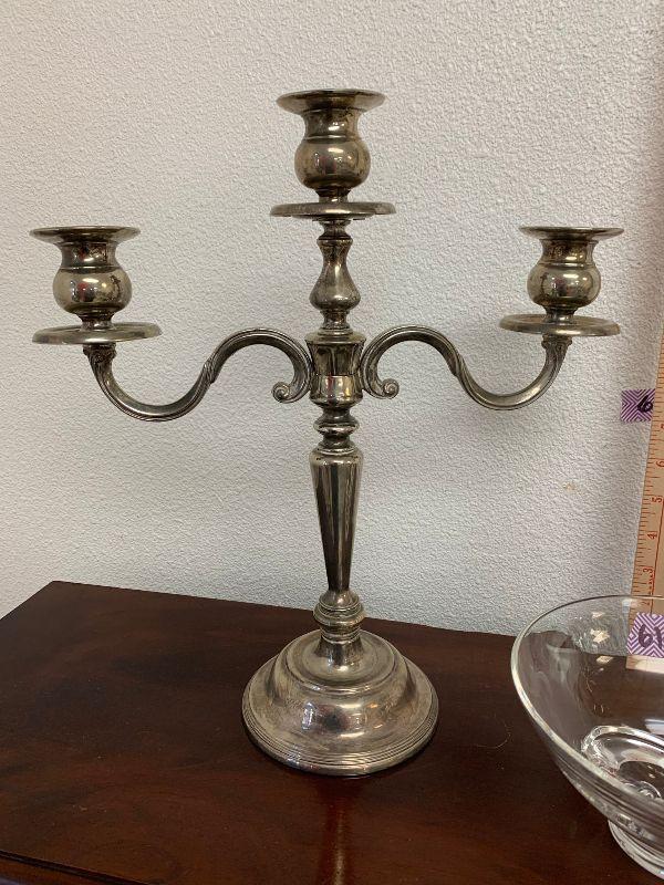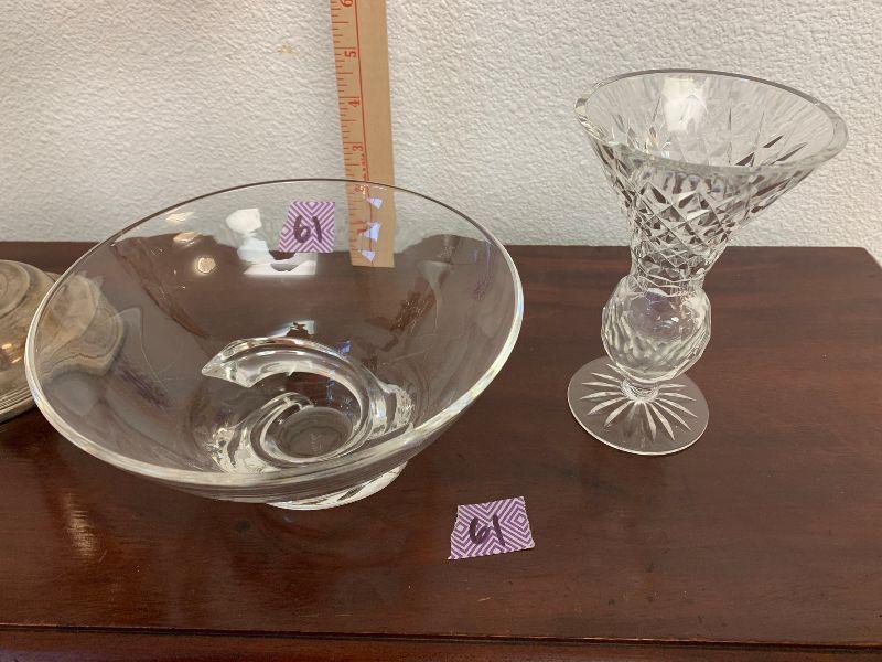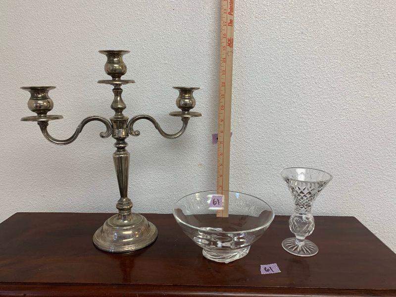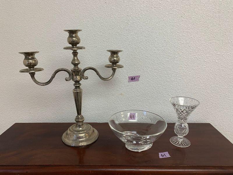 Steuben Bowl 7" diam. 3.5" tall, Candelabra 14.5" tall and 12" wide, Vase 6" tall 3.5" diam.