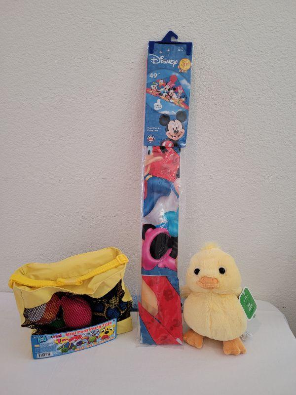 Lot 61: New Mickey Mouse Kite, Pool Toys and Hallmark Soft Duck Plushie
