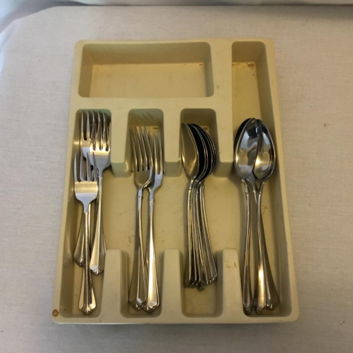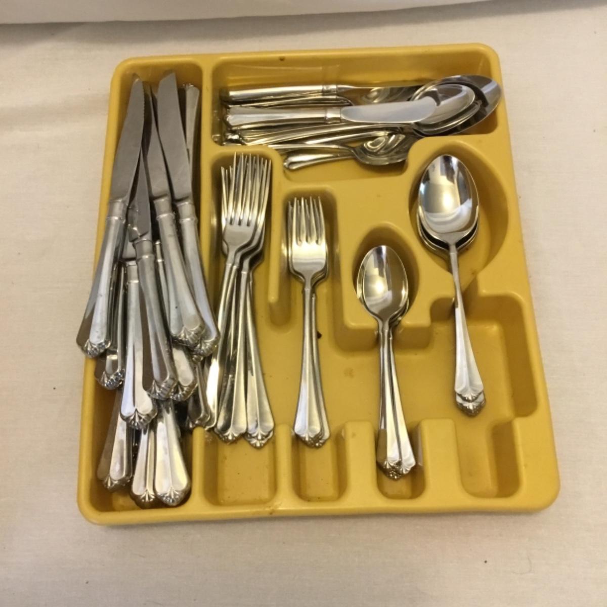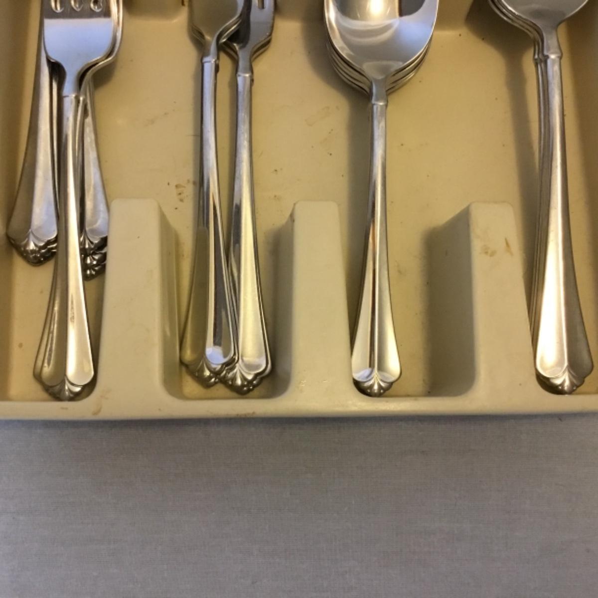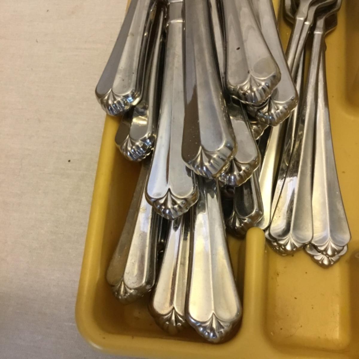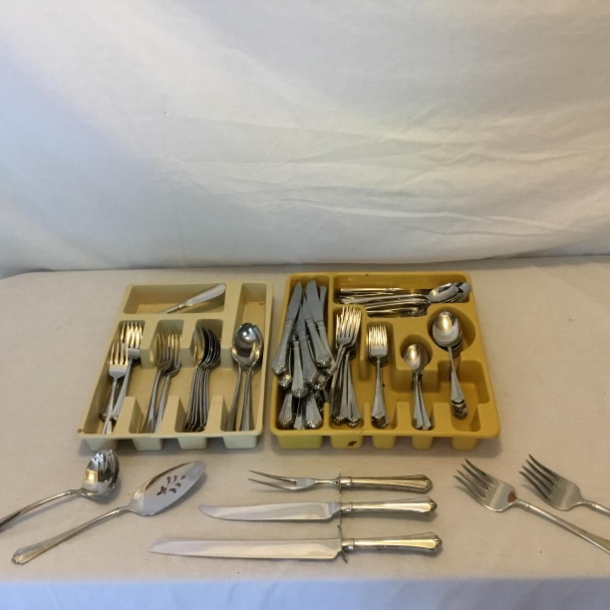 Lot includes a pair of silverware sets in their own organizers. Lot includes traditional everyday use utensils along with a few serving utensils. All the silverware has consistent similar design and all Oneida silverware. See photos for close-up details. Local pickup only.