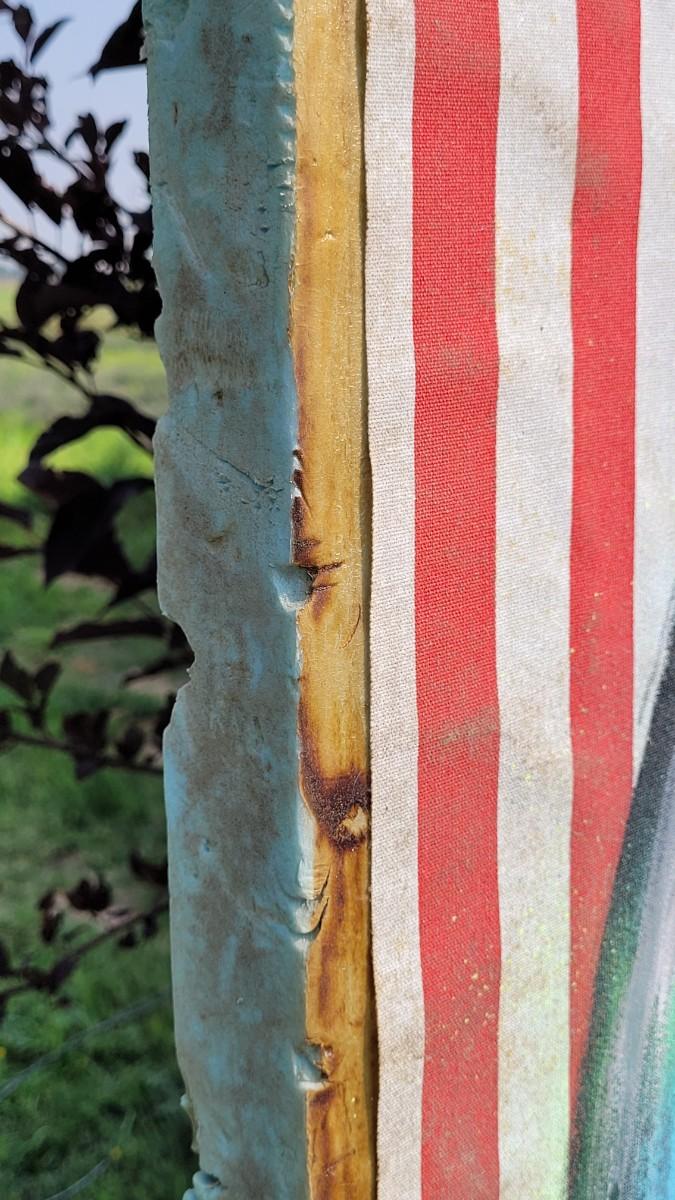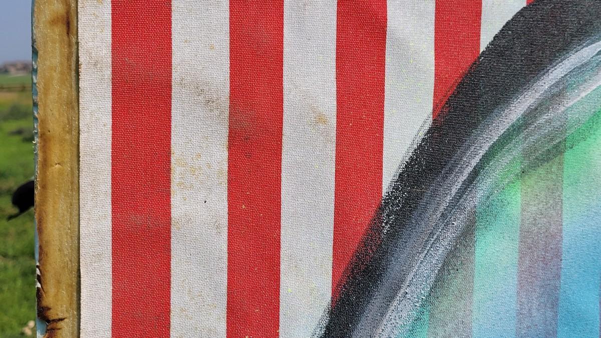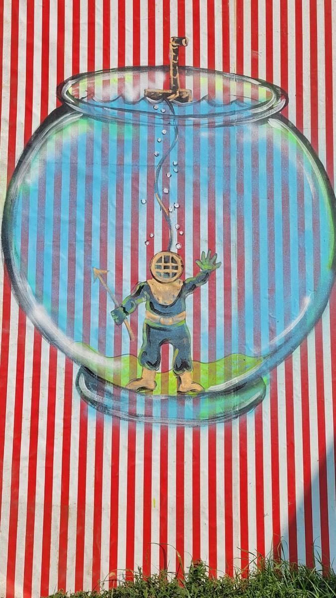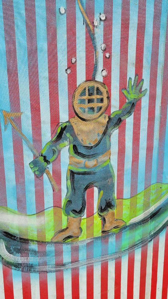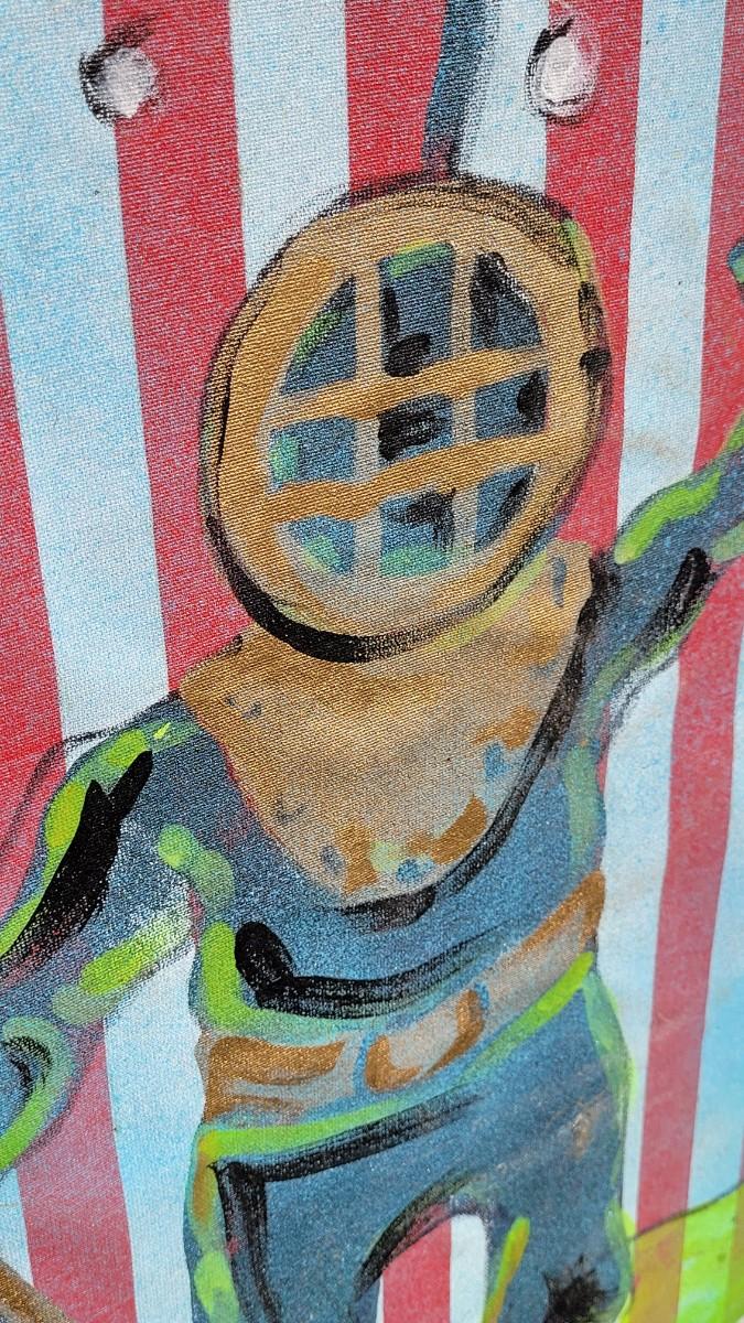 Lot 61: Large 80" x 48" Original Surreal Art SCUBA MAN FUN FISHBOWL on Striped Canvas