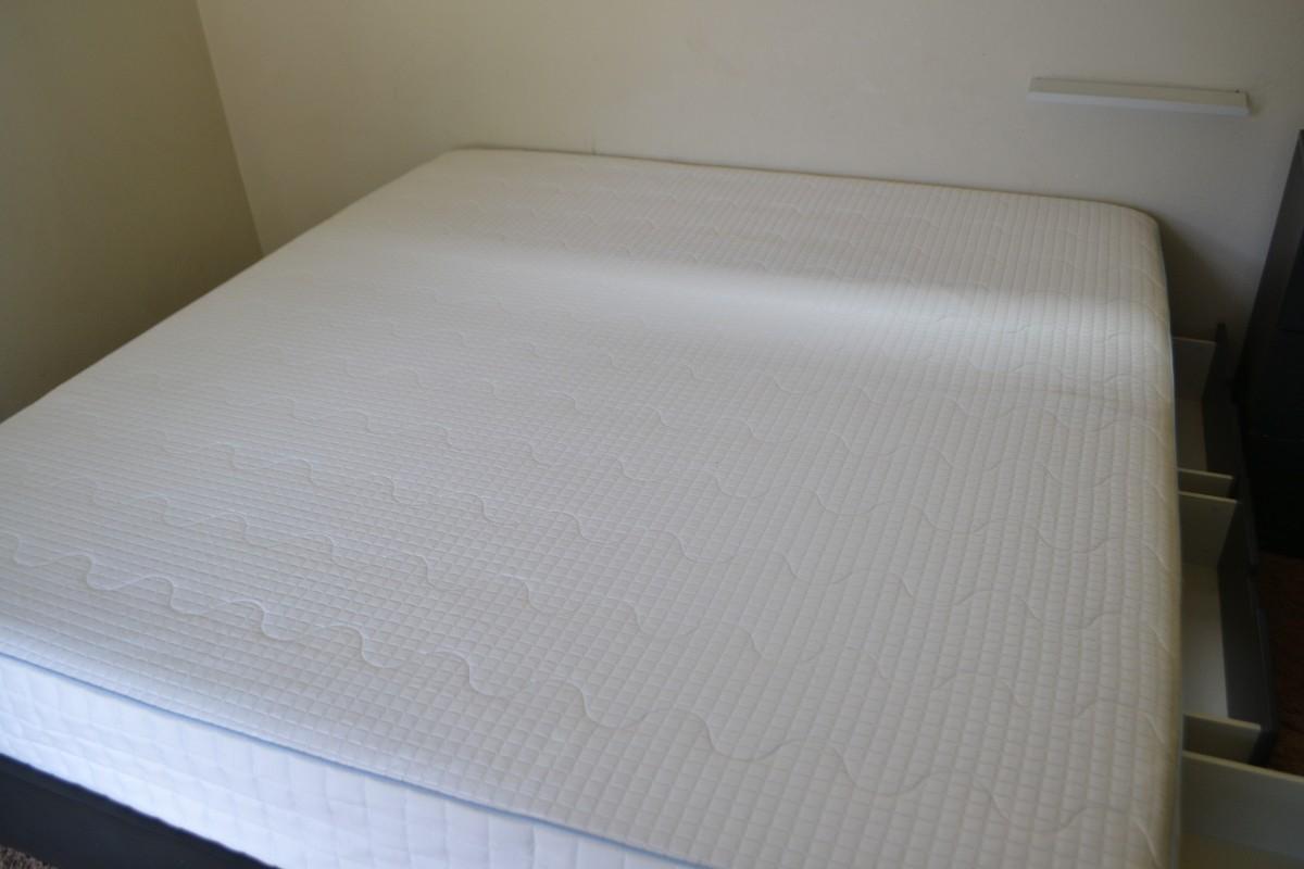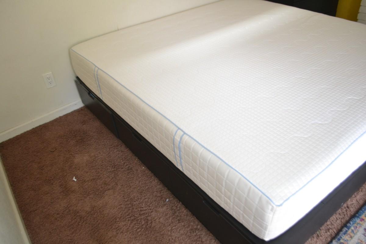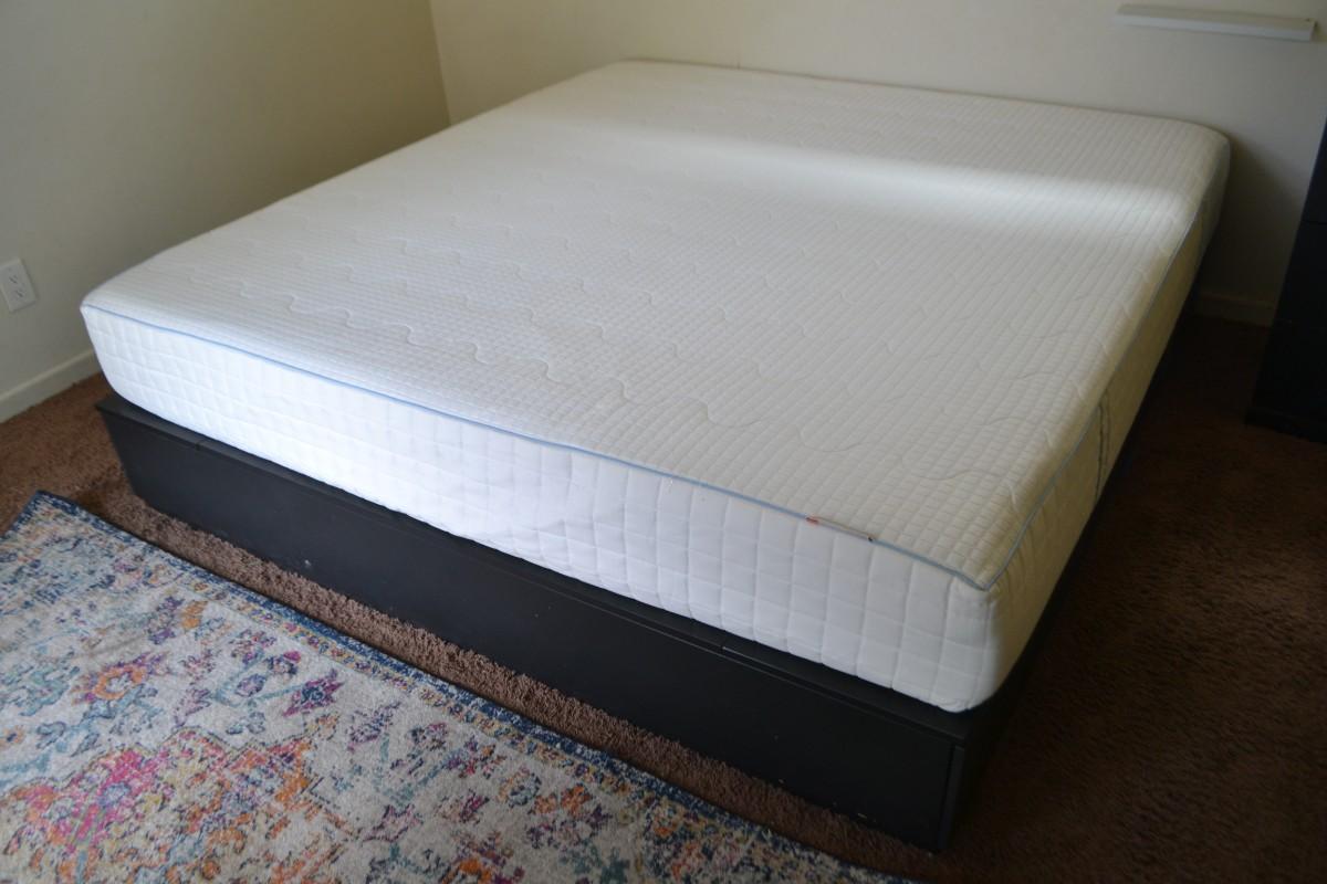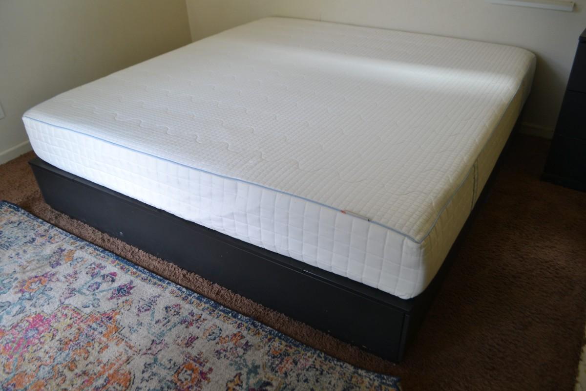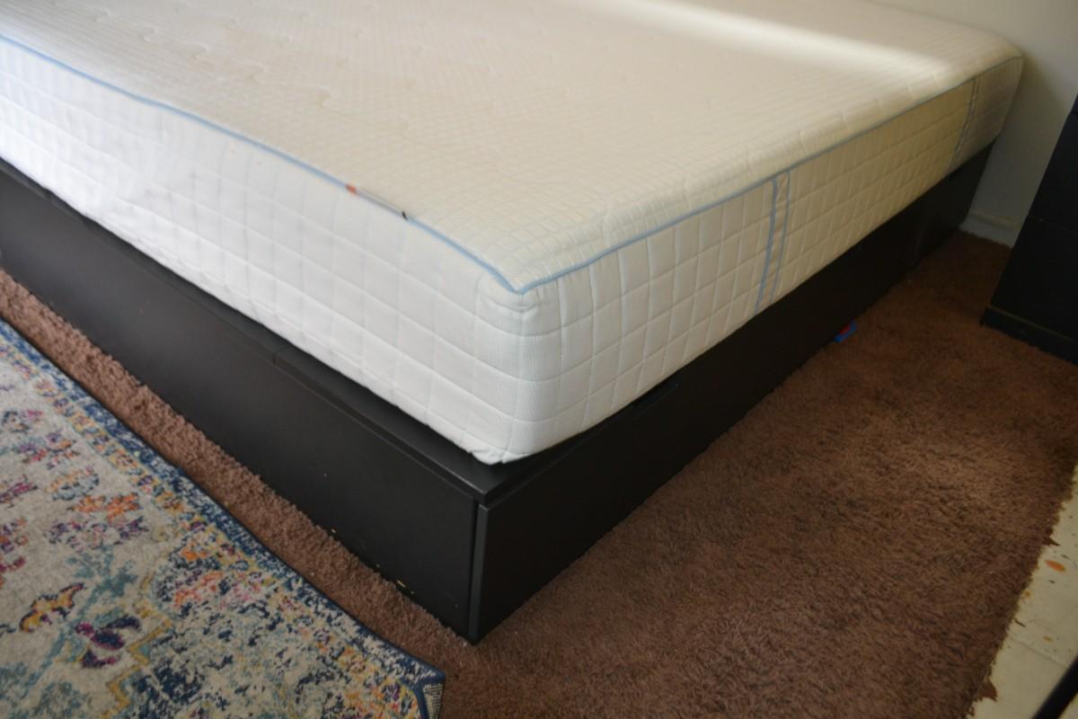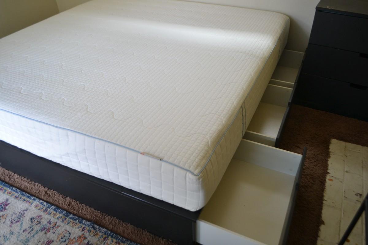 LOT 61. KING SIZE PLATFORM BED WITH SIX DRAWERS AND MATTRESS