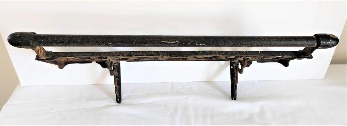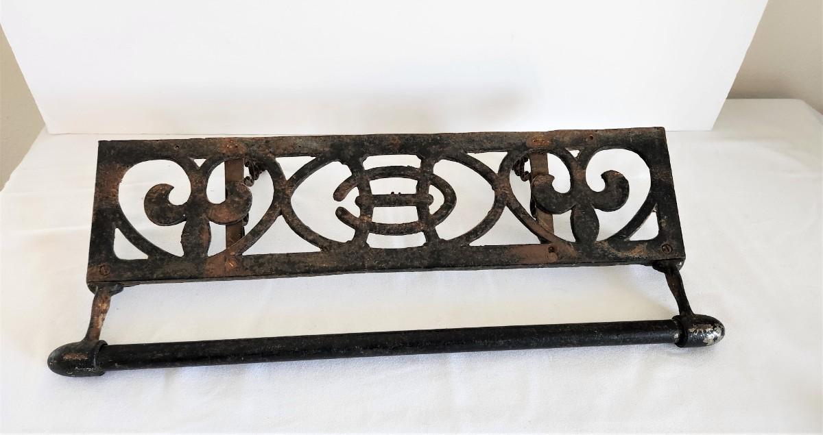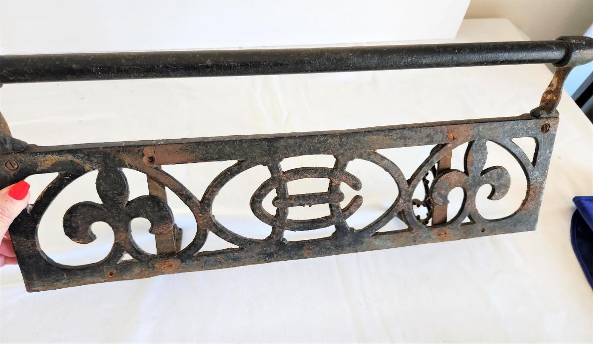 This piece was salvaged from the old campus of Holy Cross High School when two new wings were added in 1954. Gentleman intended to hang it in his house, and put it in his garage where it stayed for 60 years. Piece dates from between 1912 - 1954. Iron wall-mounted coat rack - see the "HC" monogram and the fleur di lis on either side. Measures about 21" across and 8" deep. Brackets are 4" tall. A cool item in antique condition. You'll likely never find another one.