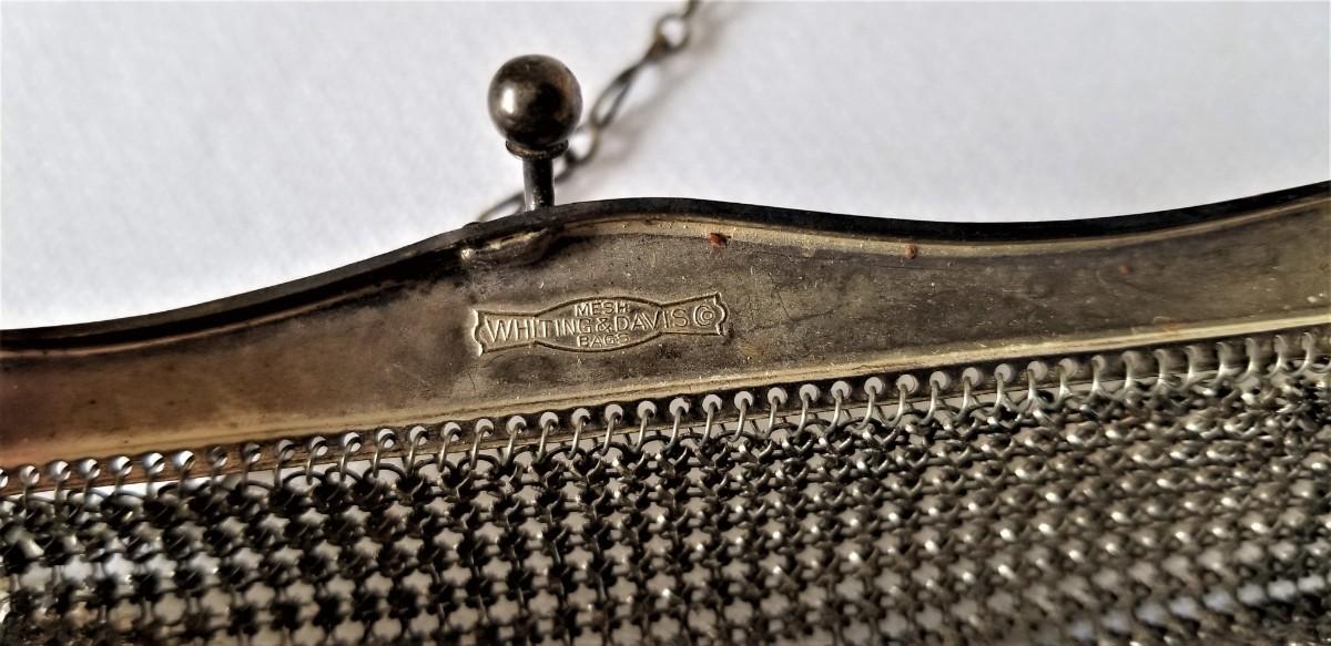 Antique mesh handbag, marked Whiting and Davis. Measures 5" across at the frame. Antique, used condition.
