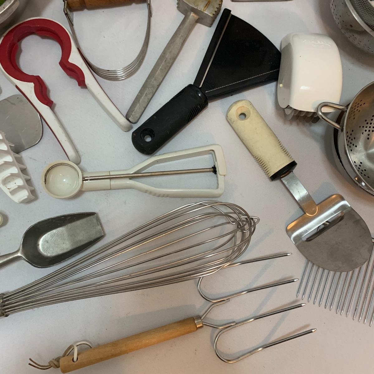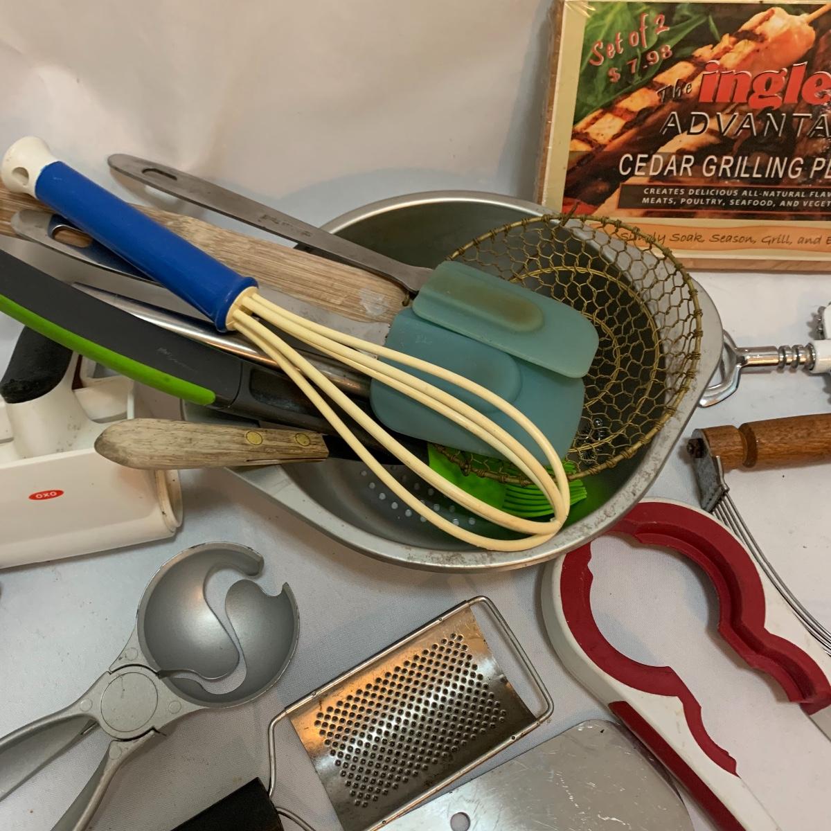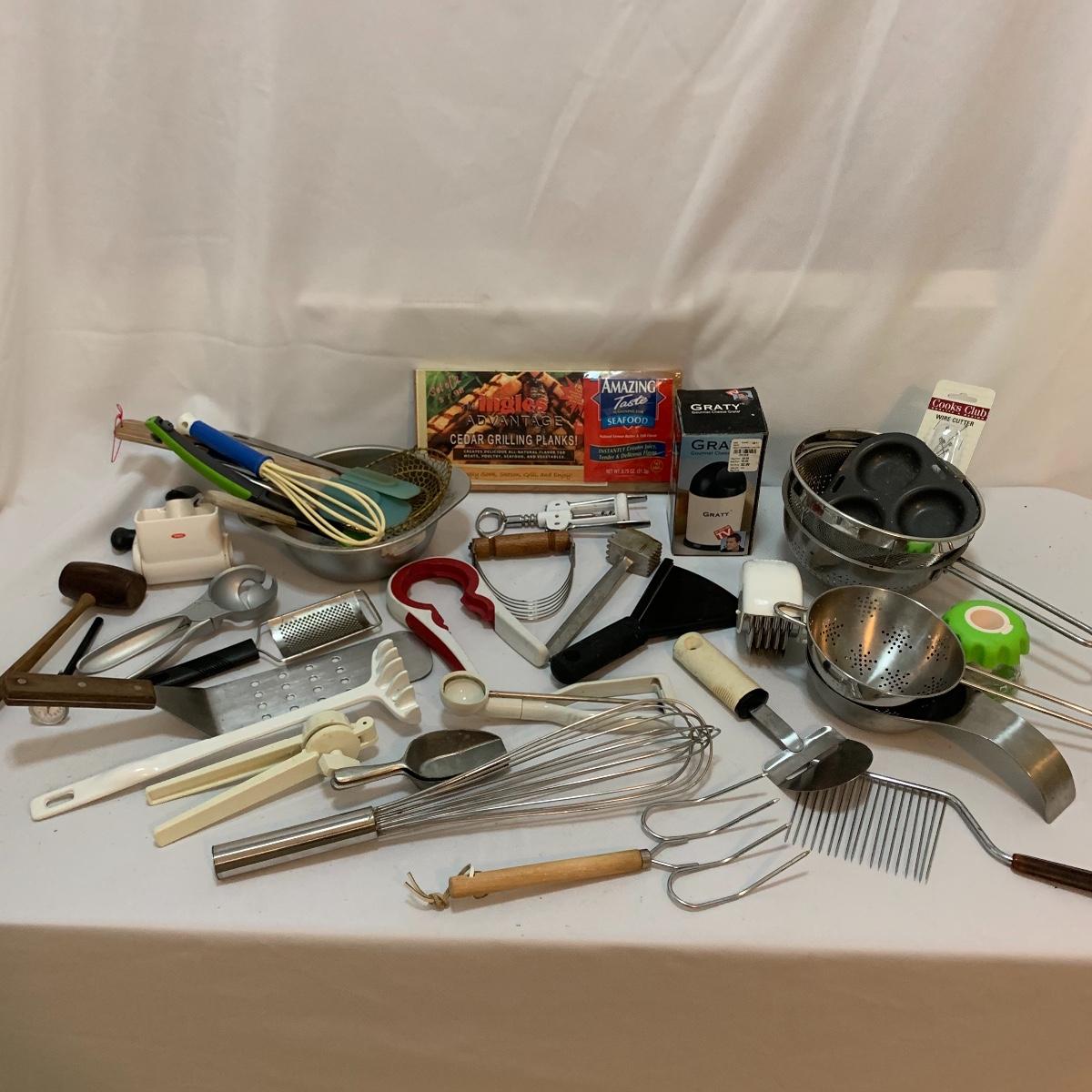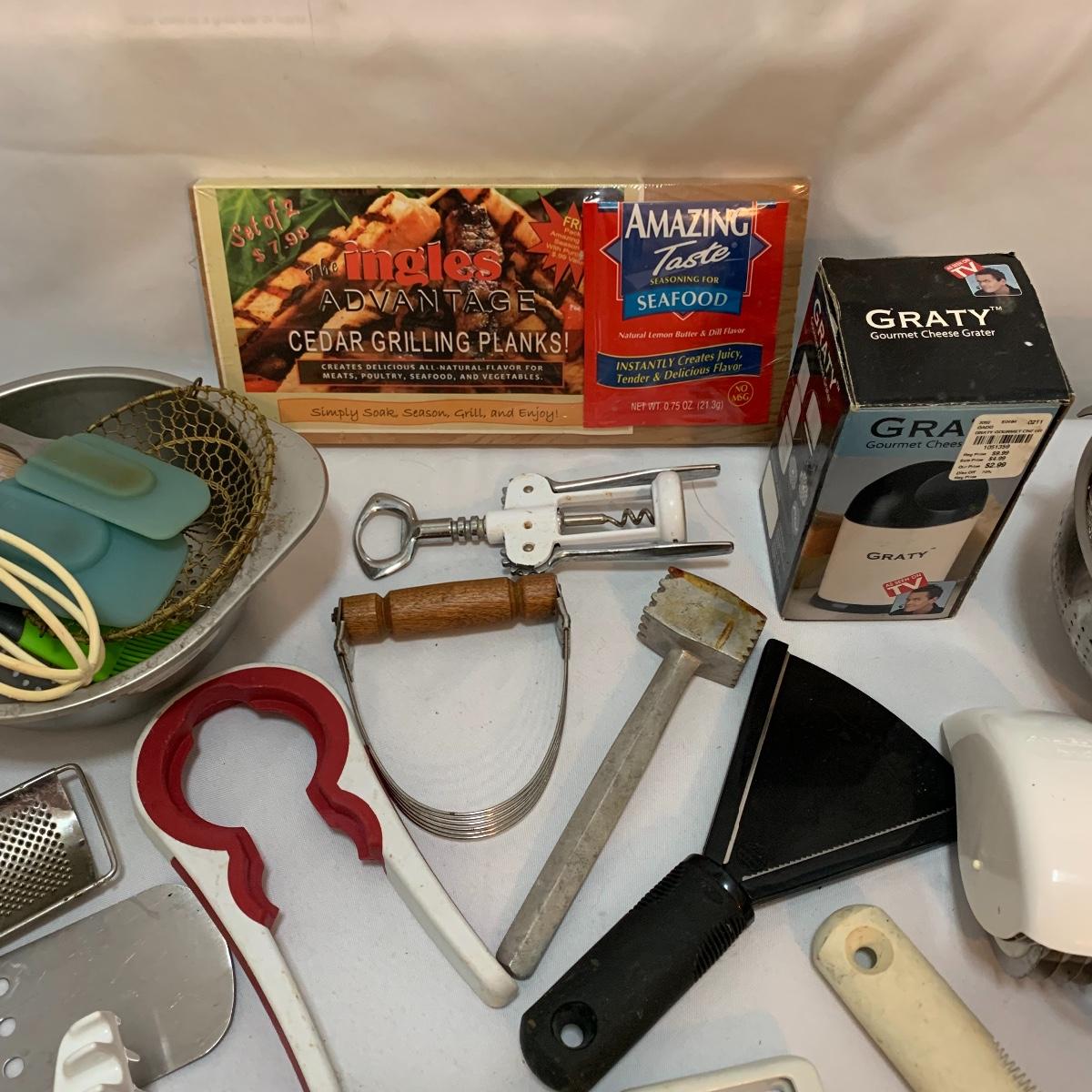 Plenty of very useful utensils in this lot to outfit your entire kitchen! This large lot contains new in packaging cedar grilling planks, spoons, whisks, strainers, pizza cutters, ice cream scoops, various peelers, and much more! See pics to determine lot content.