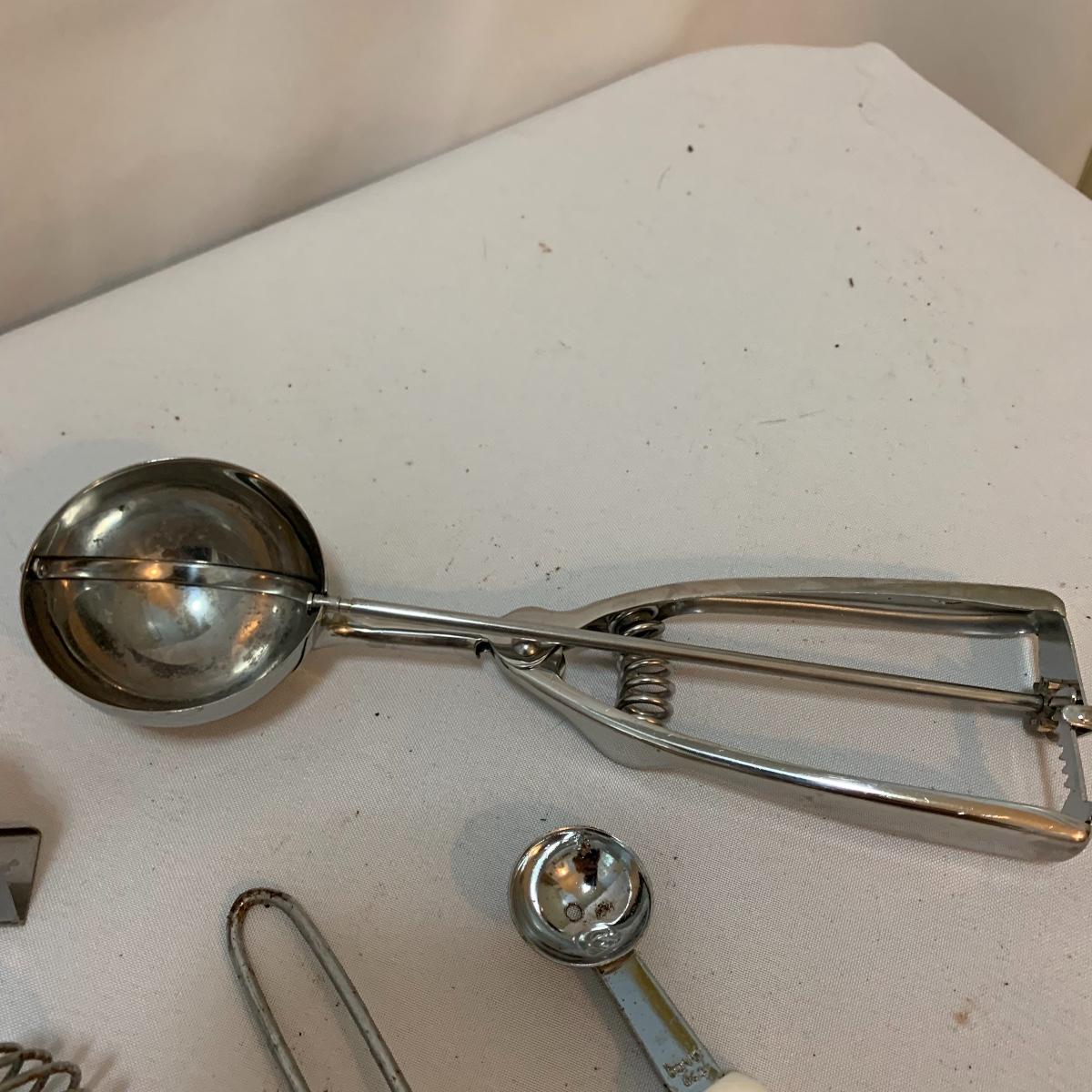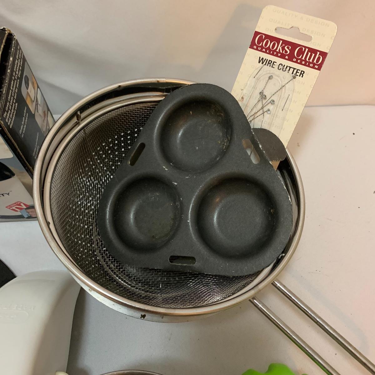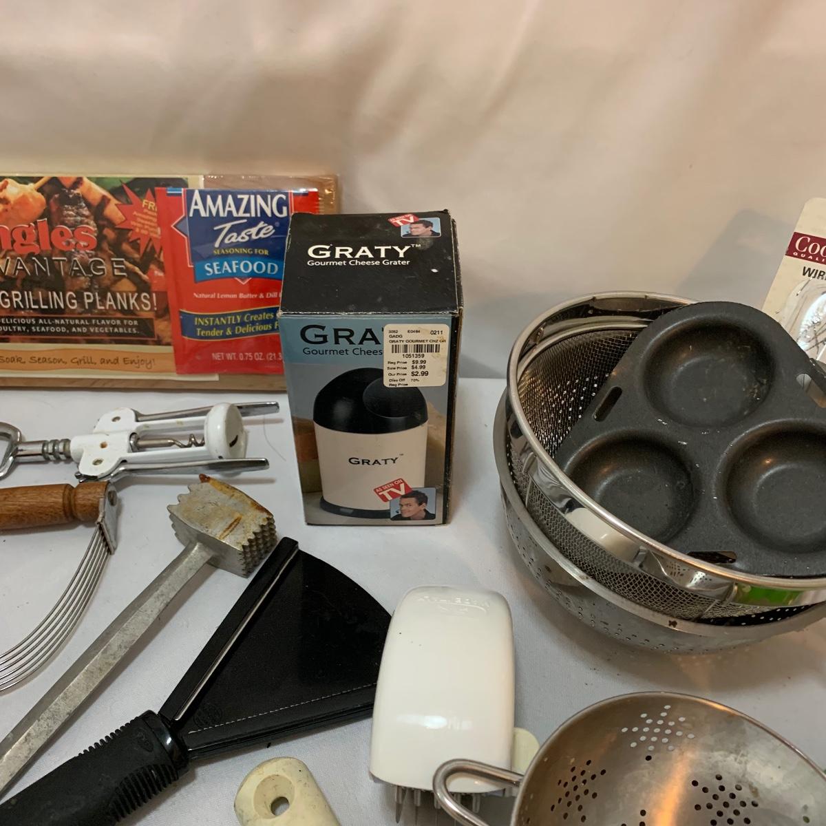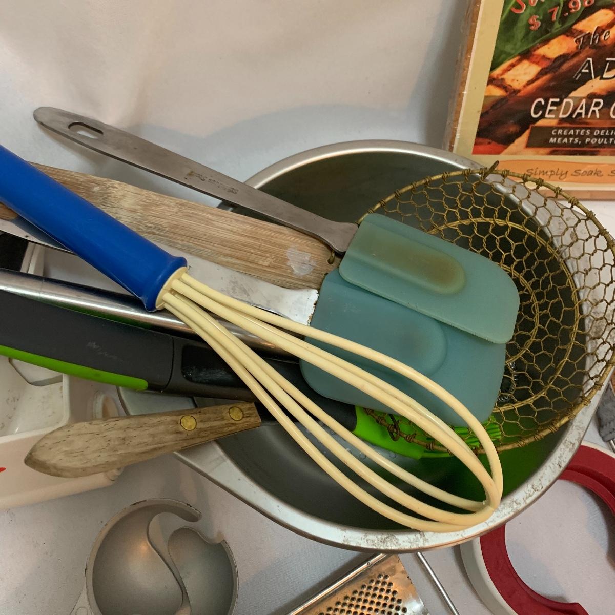 Plenty of very useful utensils in this lot to outfit your entire kitchen! This large lot contains new in packaging cedar grilling planks, spoons, whisks, strainers, pizza cutters, ice cream scoops, various peelers, and much more! See pics to determine lot content.