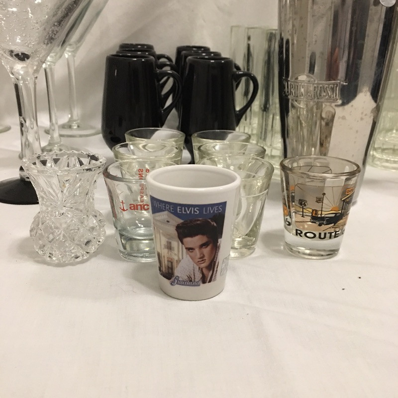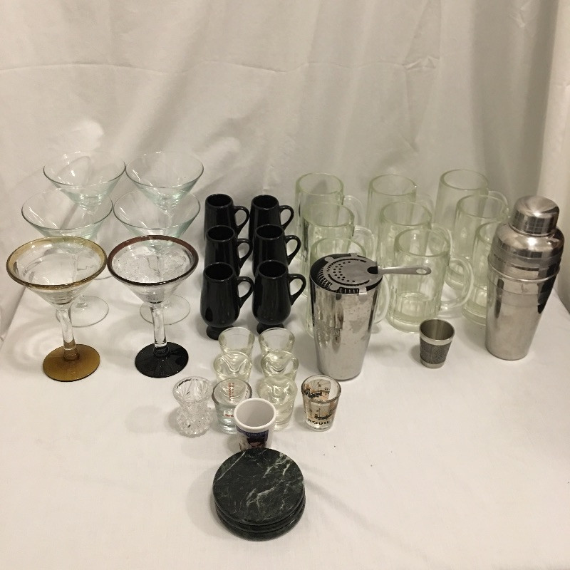 Mix and serve your drinks in style with these essential barware items that includes nine beer mugs, six martini glasses, ten shot glasses, two shakers and six small coffee mugs.