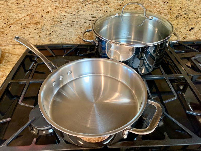 Stainless steel cookware. 11" skillet and 3qt Dutch oven. Glass lid fits both