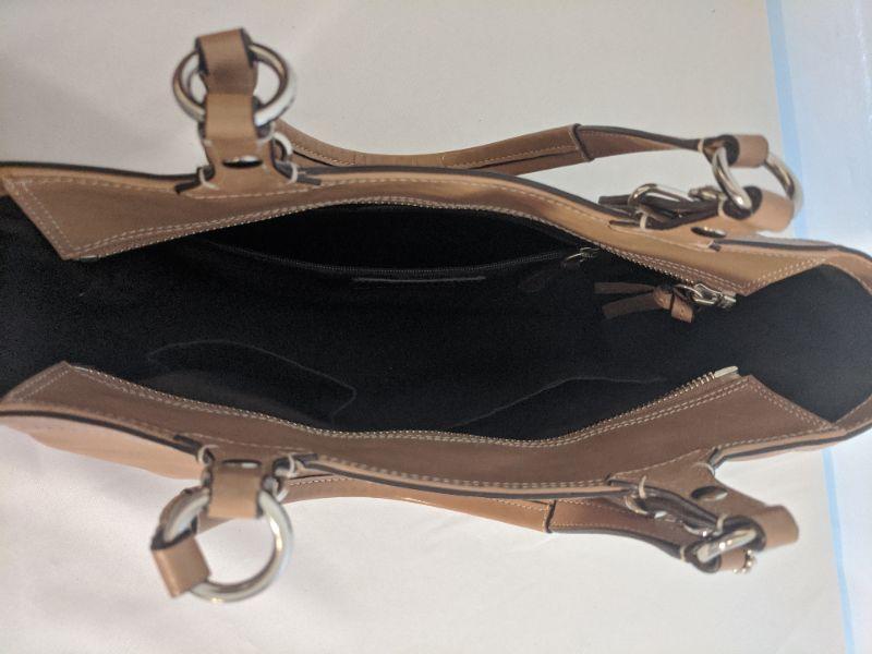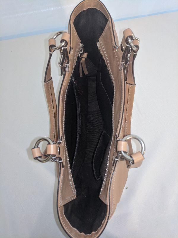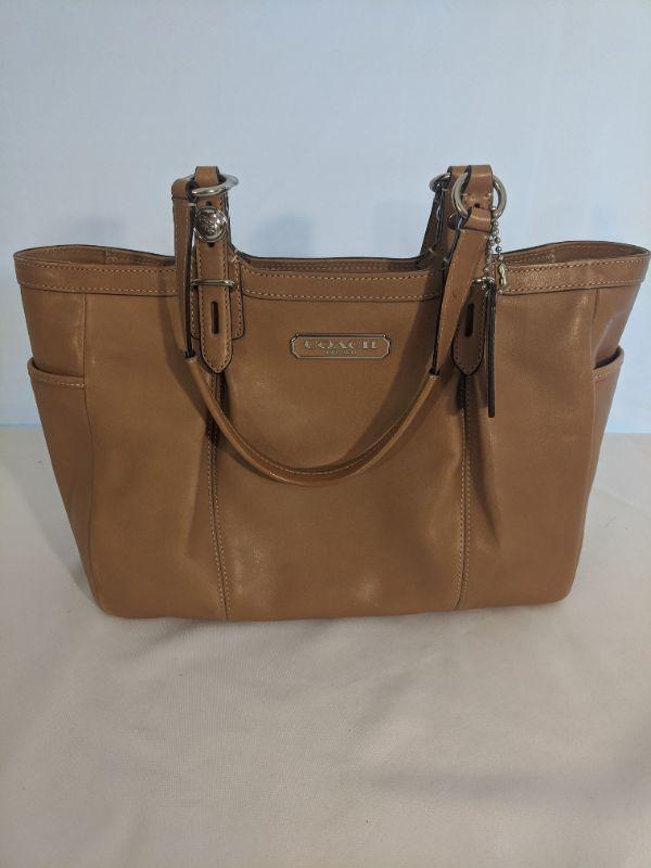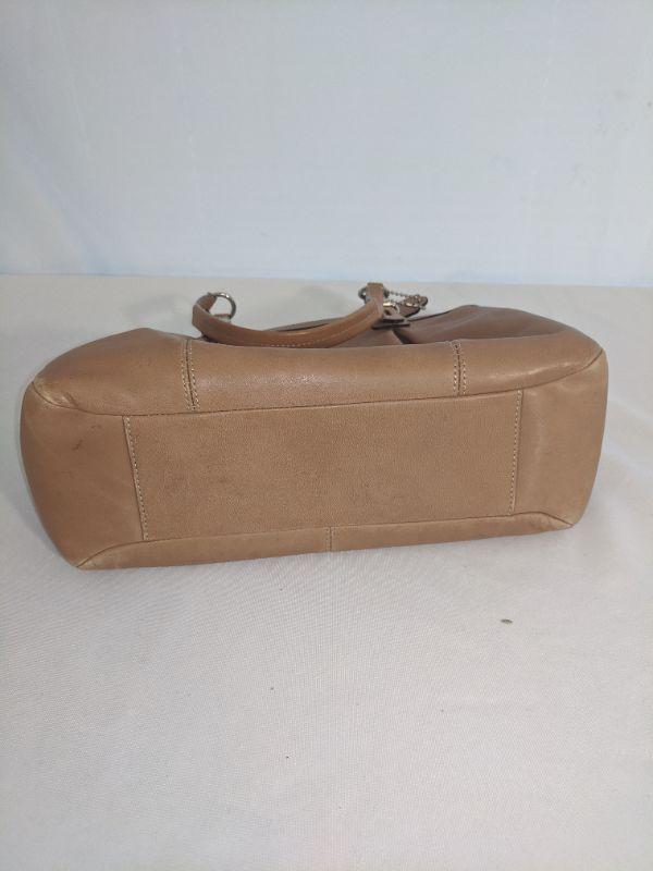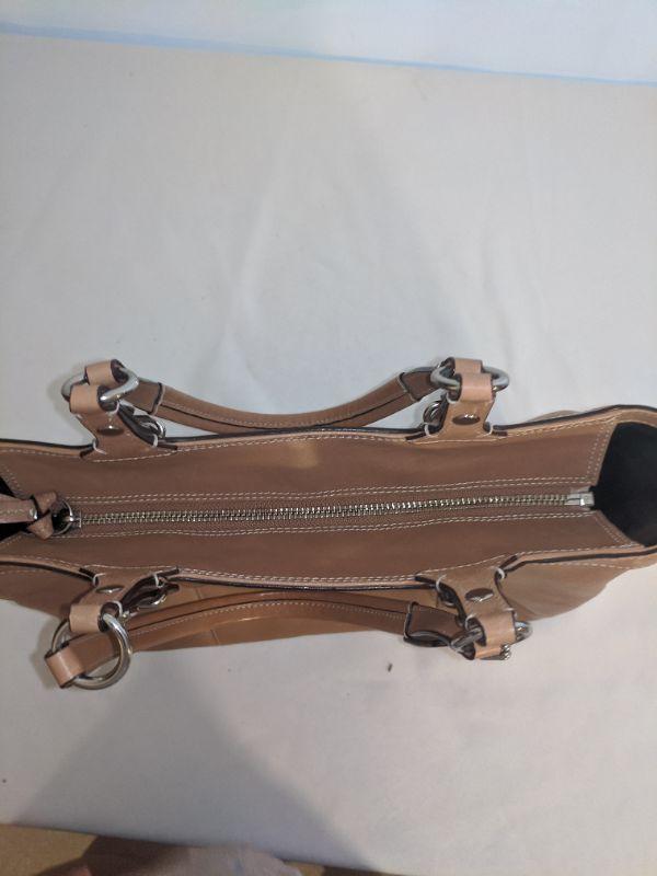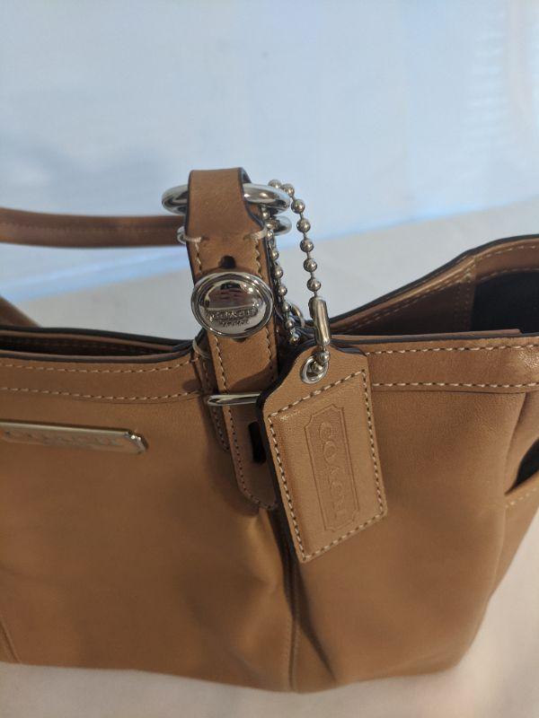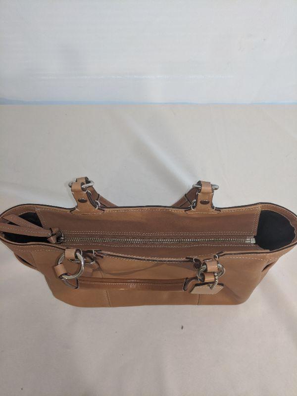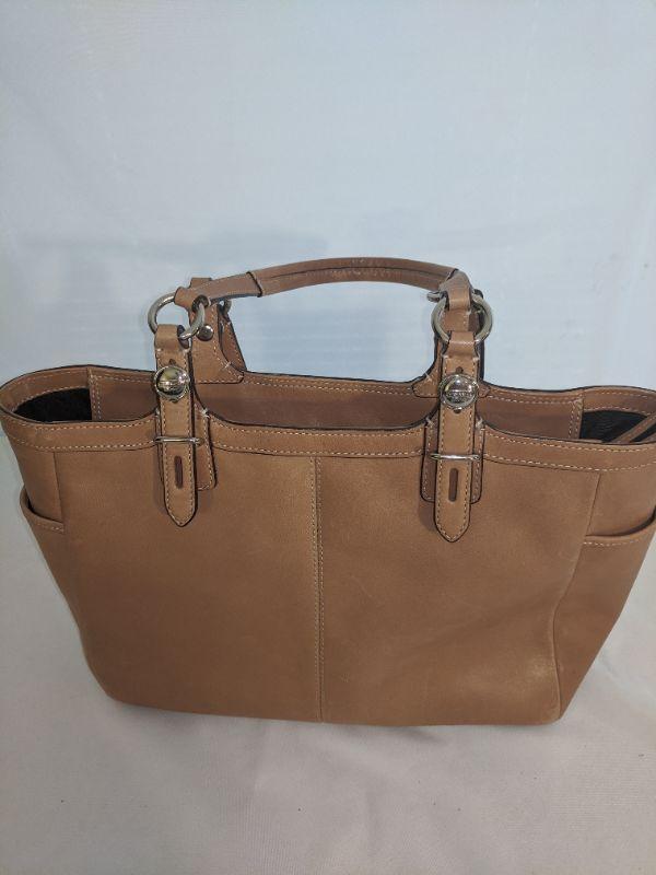 This gorgeous tan Coach is both practical and is a great color for tying in with any outfit. It has been well cared for and is appears to be in excellent condition. It is made of handcrafted leather and the identification number is f1007-f15147.. The purse measures approximately 14"x9".
