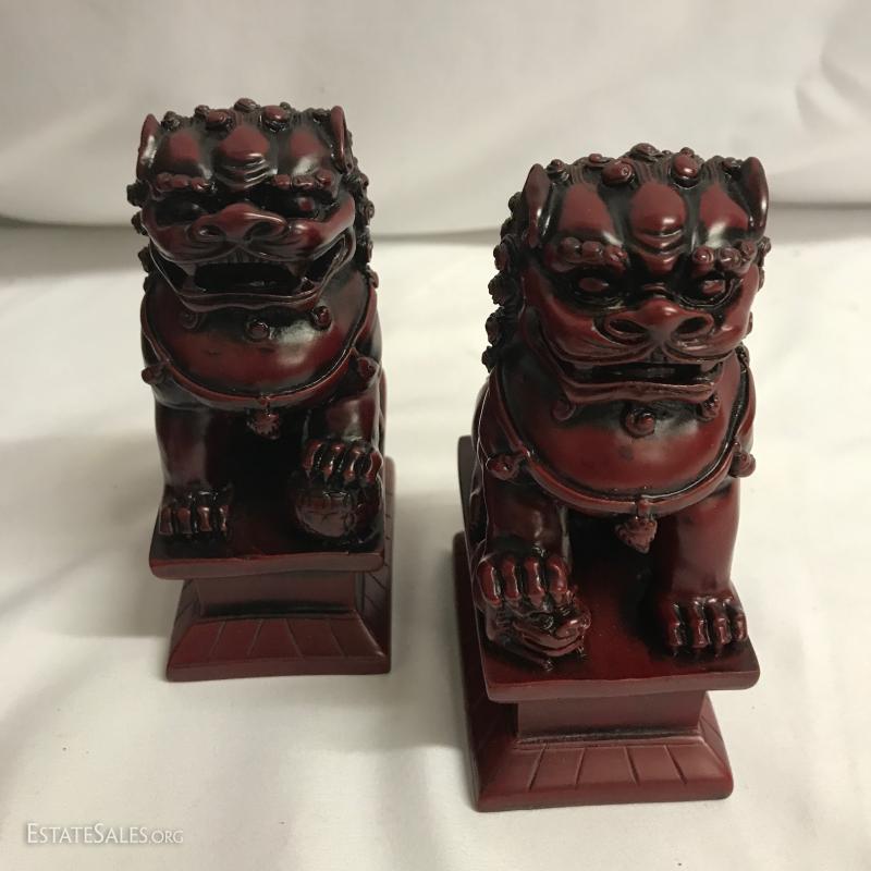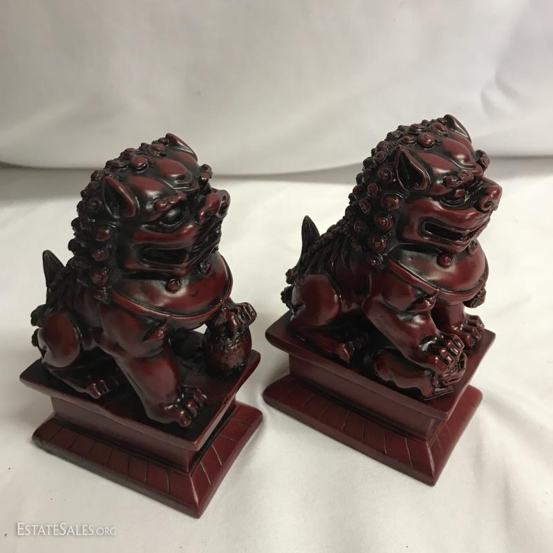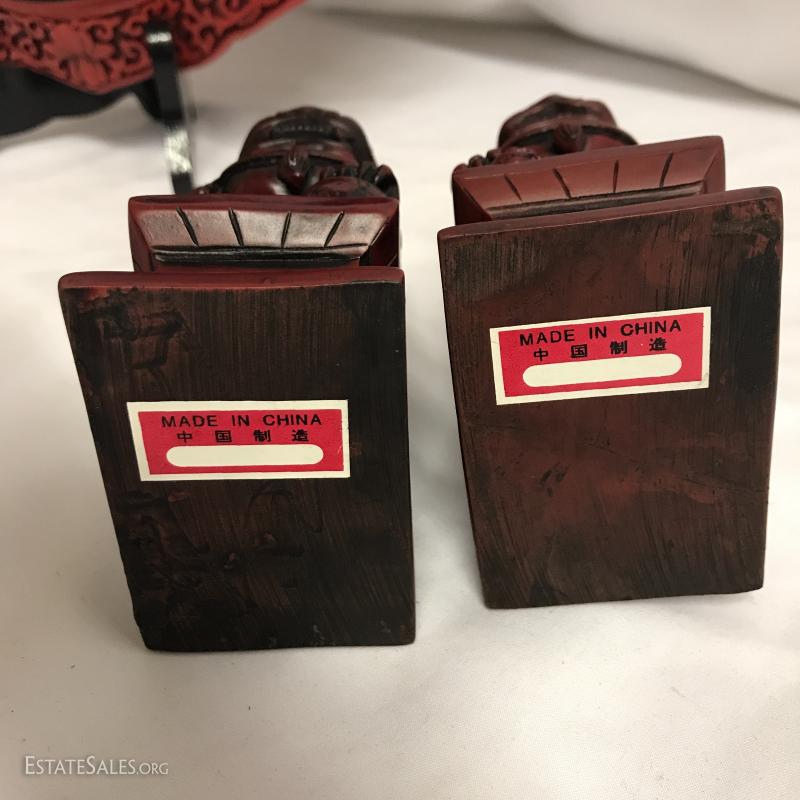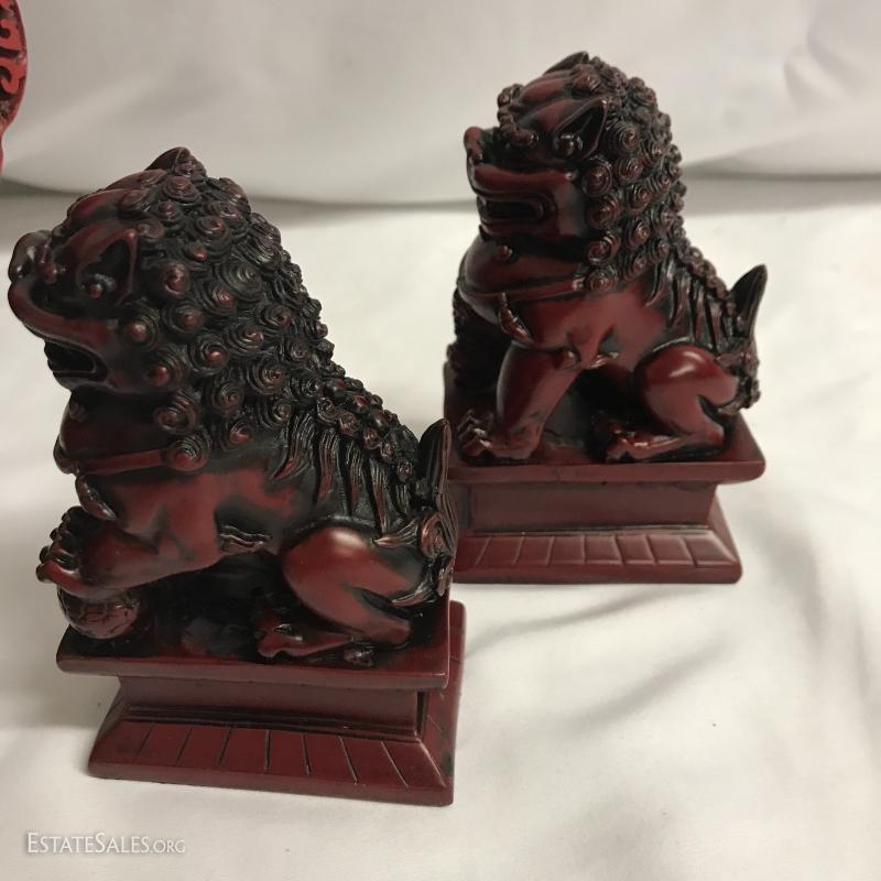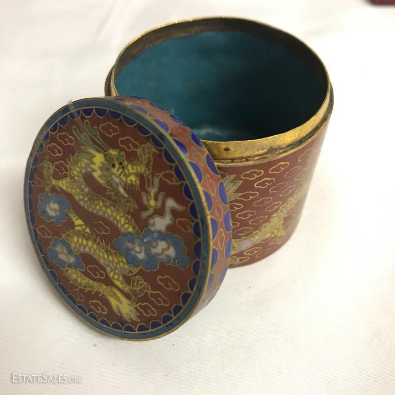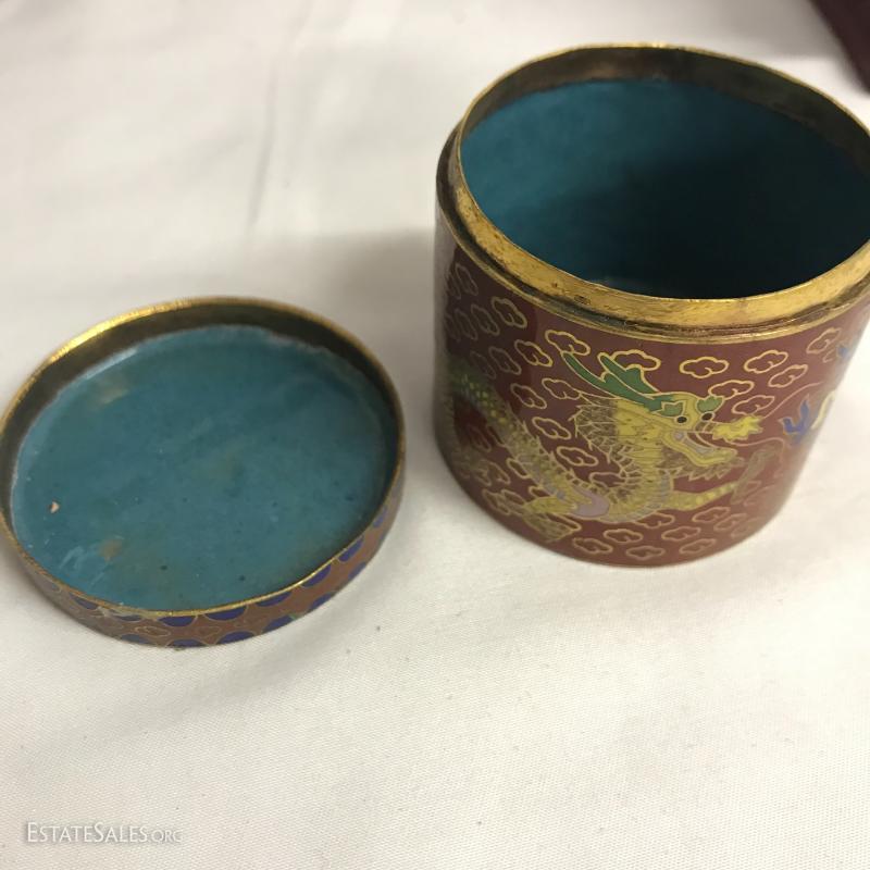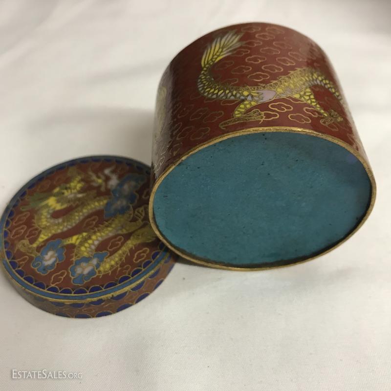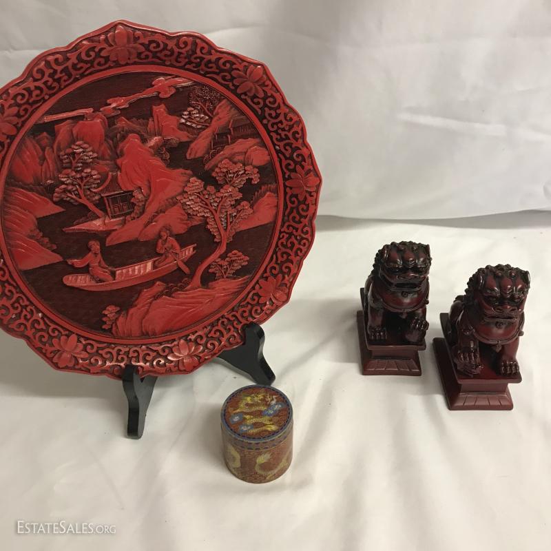 10" plate appears to be cinnabar. Detailed design. Cloisonné jar with lid and dragon design is 2" tall. Pair of foo dogs /lions are 4.5" tall.
