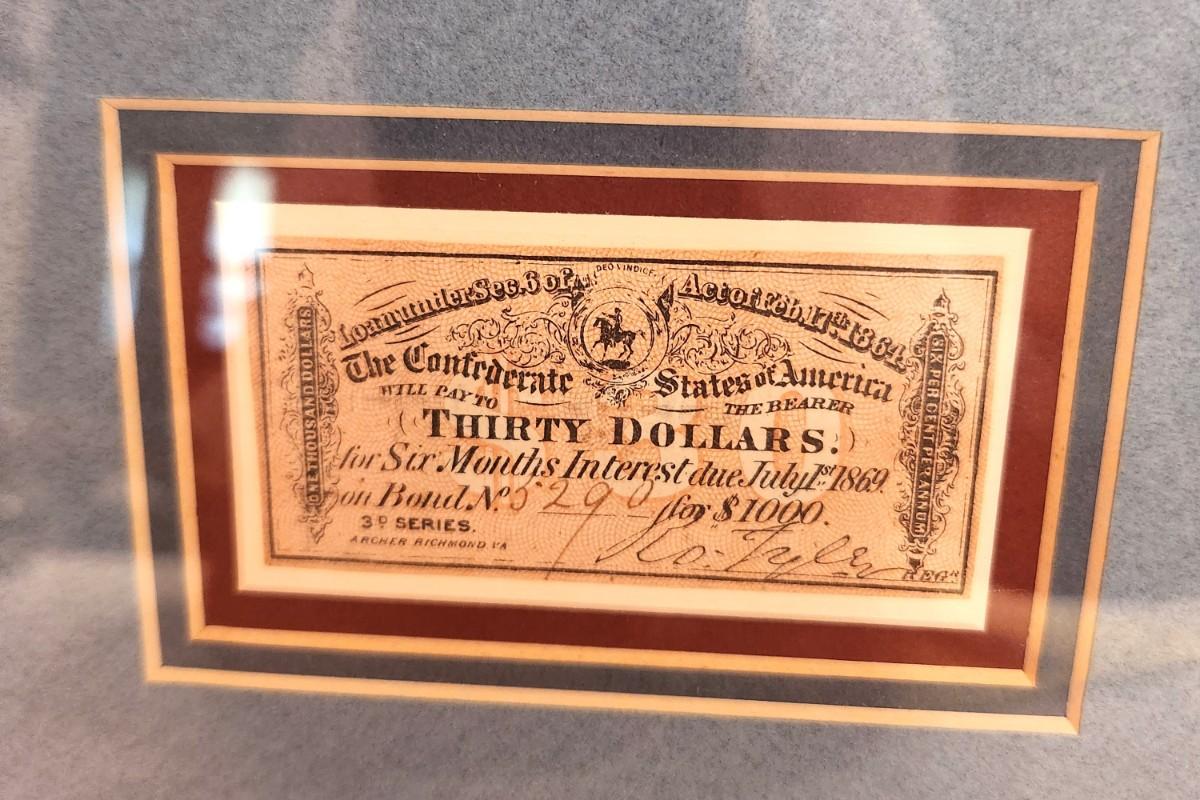 You get an antique Confederate General James Longstreet print AND an authentic Confederate $30 Bond coupon in the same framed piece - double matted - very attractive. Measures 15" x 10"
