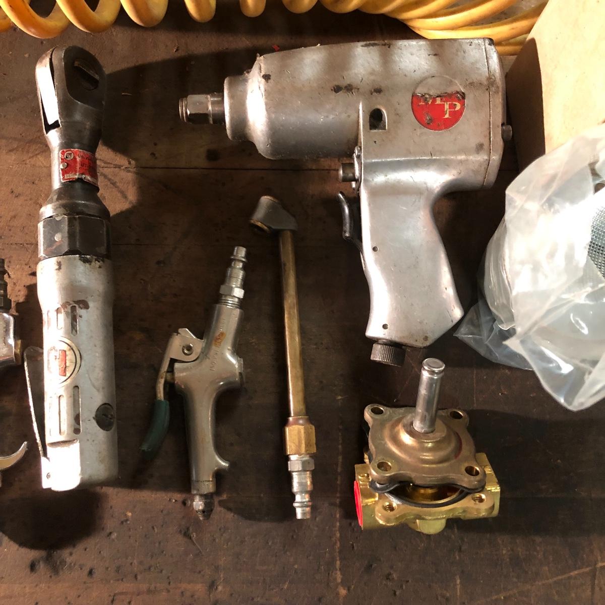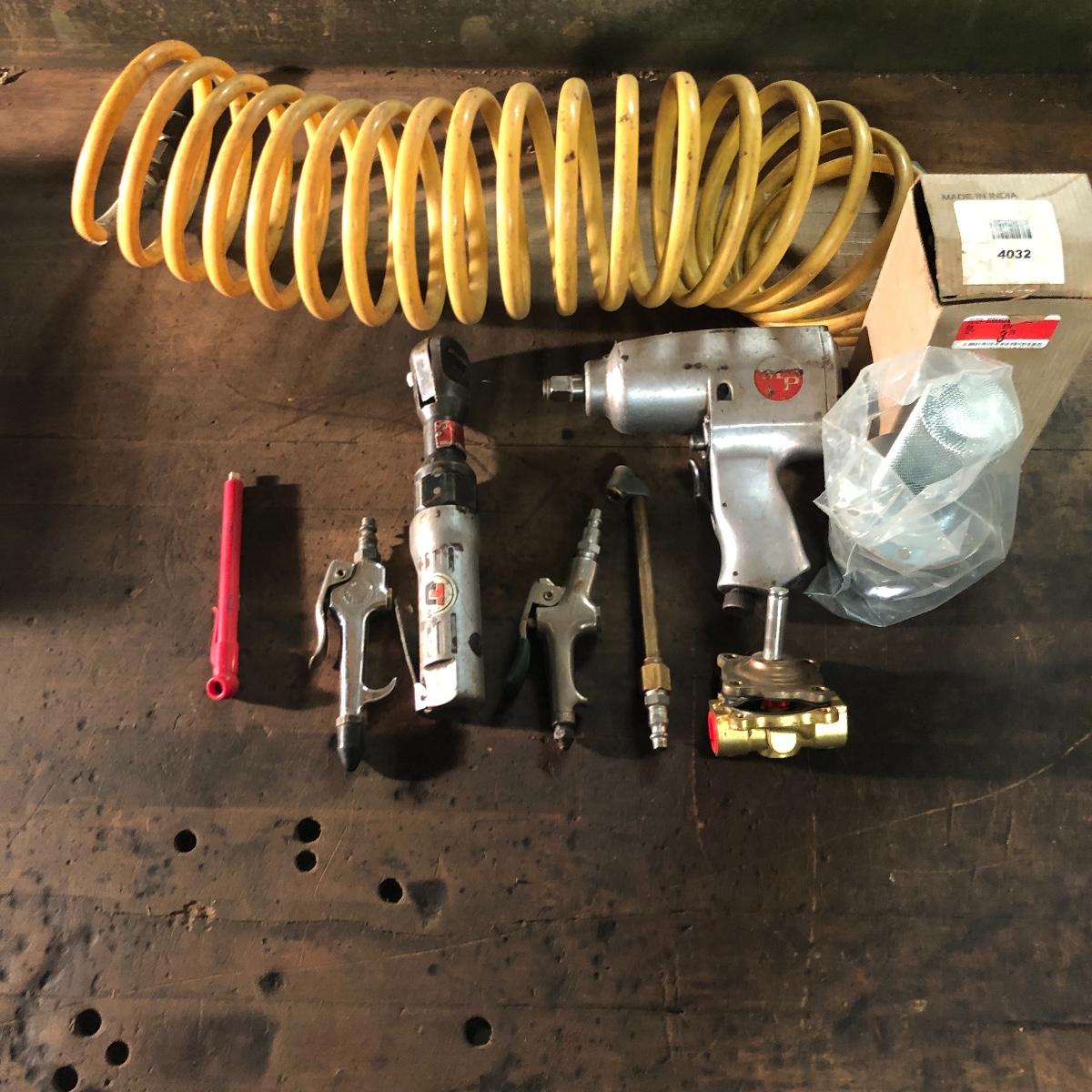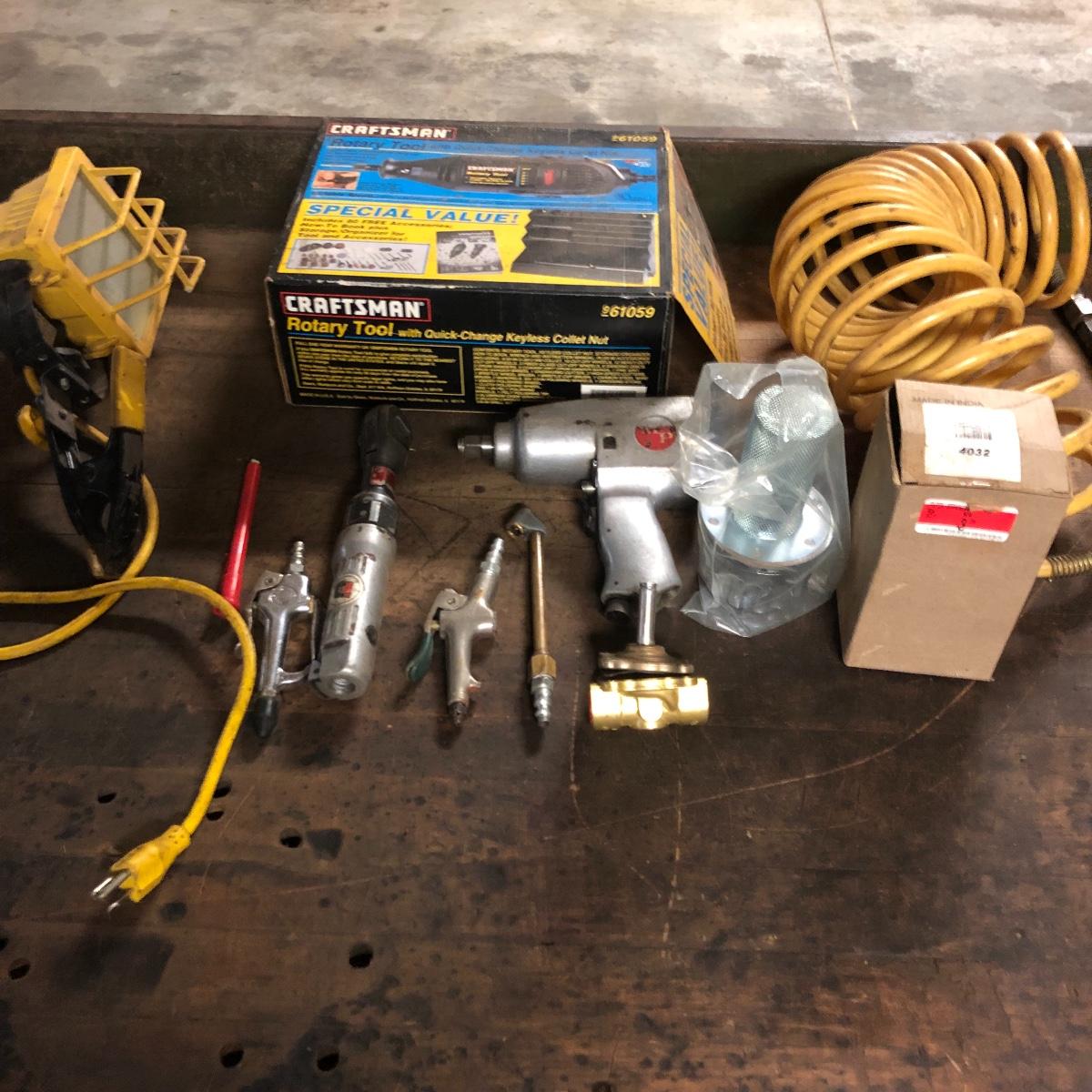 Get your projects done with this assortment of tools that includes Craftsman rotary tool with storage organizer, 1/2” drive air impact wrench, 3/8” drive air ratchet, coiled air hose, air chuck and more. Also includes small clamp light. Light and rotary tool worked when tested. Air tools were not tested.