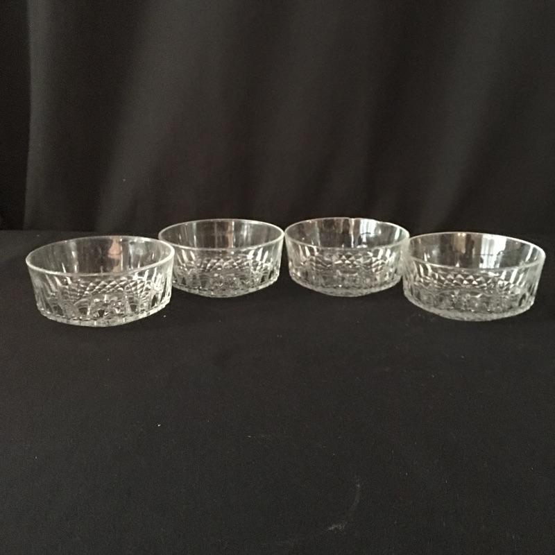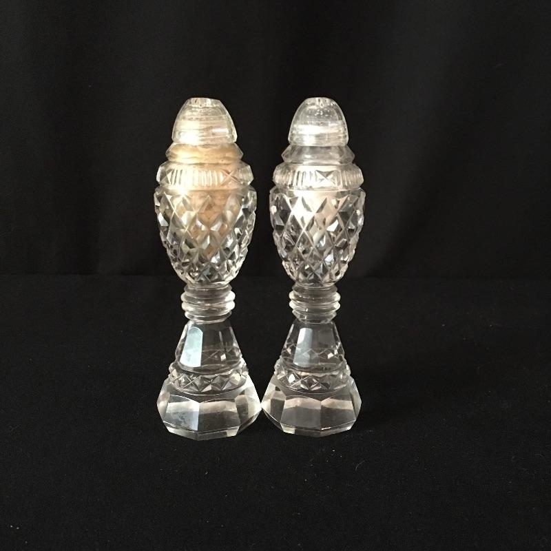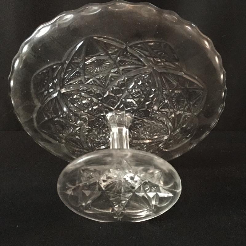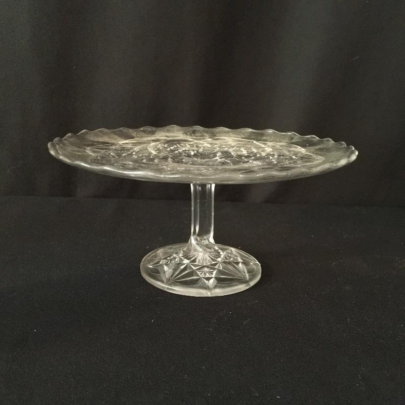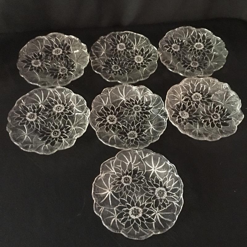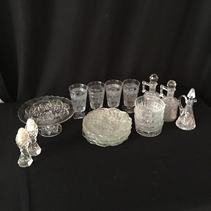Cut and formed glass assortment that includes salt and pepper shakers,seven small plates, four bowls, four glasses, cake platter and three small pitchers. This would make an adorable set for entertaining. Platter measures 9”D x 4.5”tall.