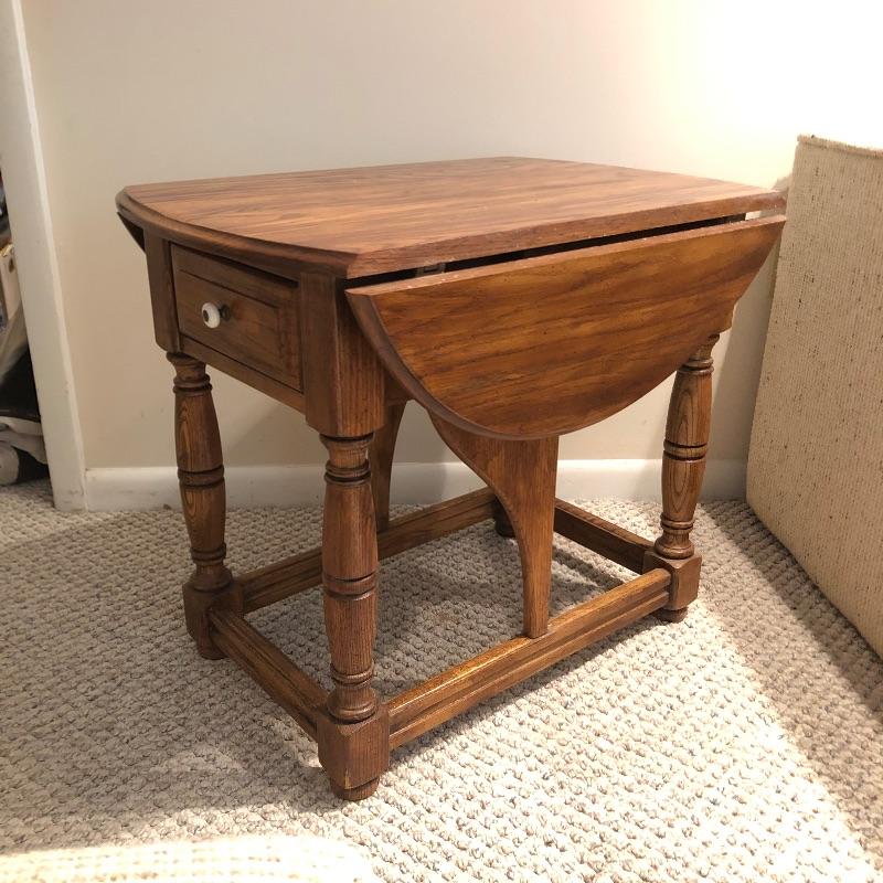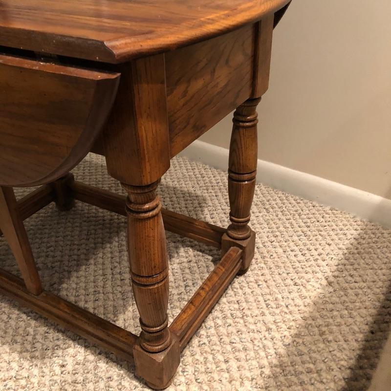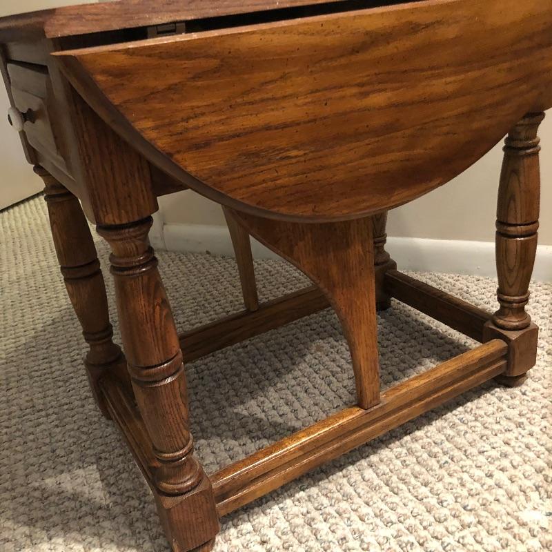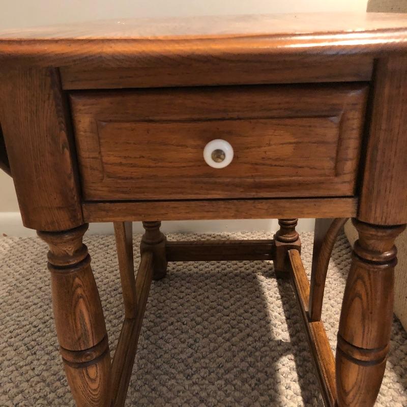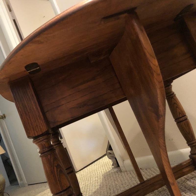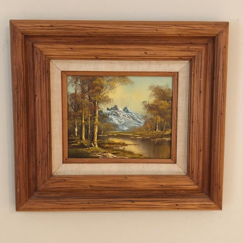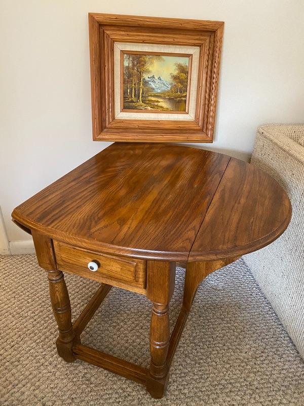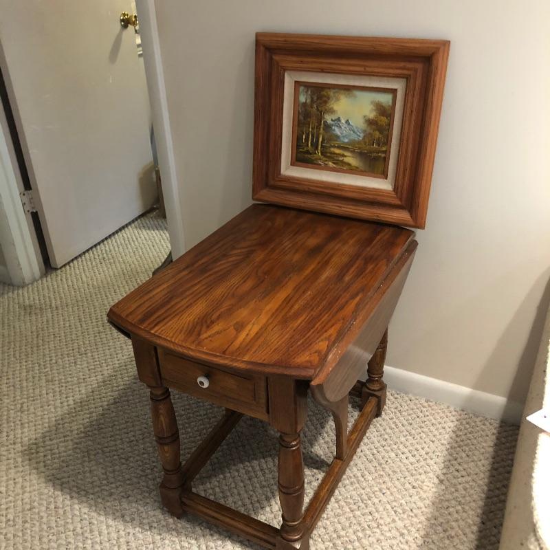 Add country charm and versatility to your space with this cute small table that expands to a good size. This wood table comes with one drawer. We paired this with a wood framed oil landscape painting by H. Bells that measures 17” x 18”.