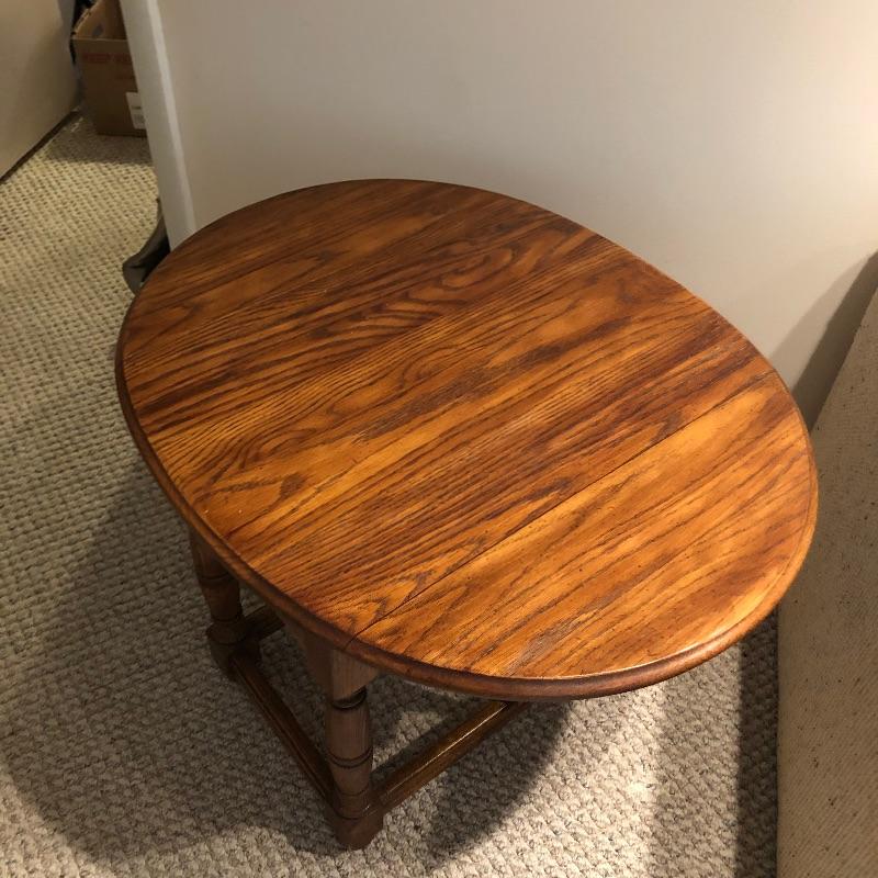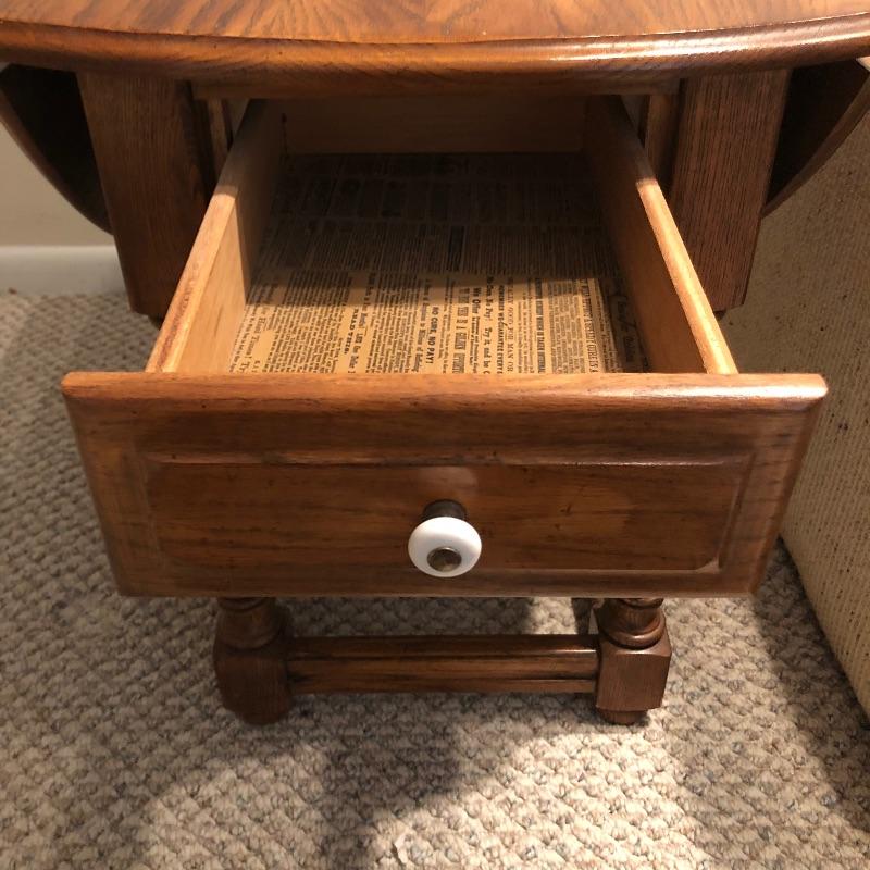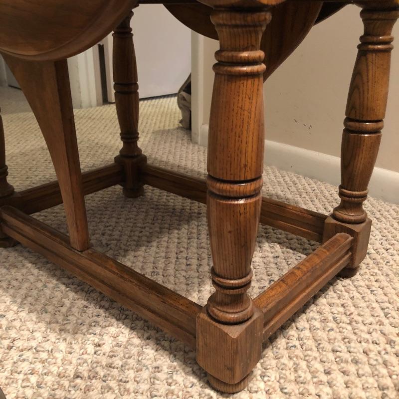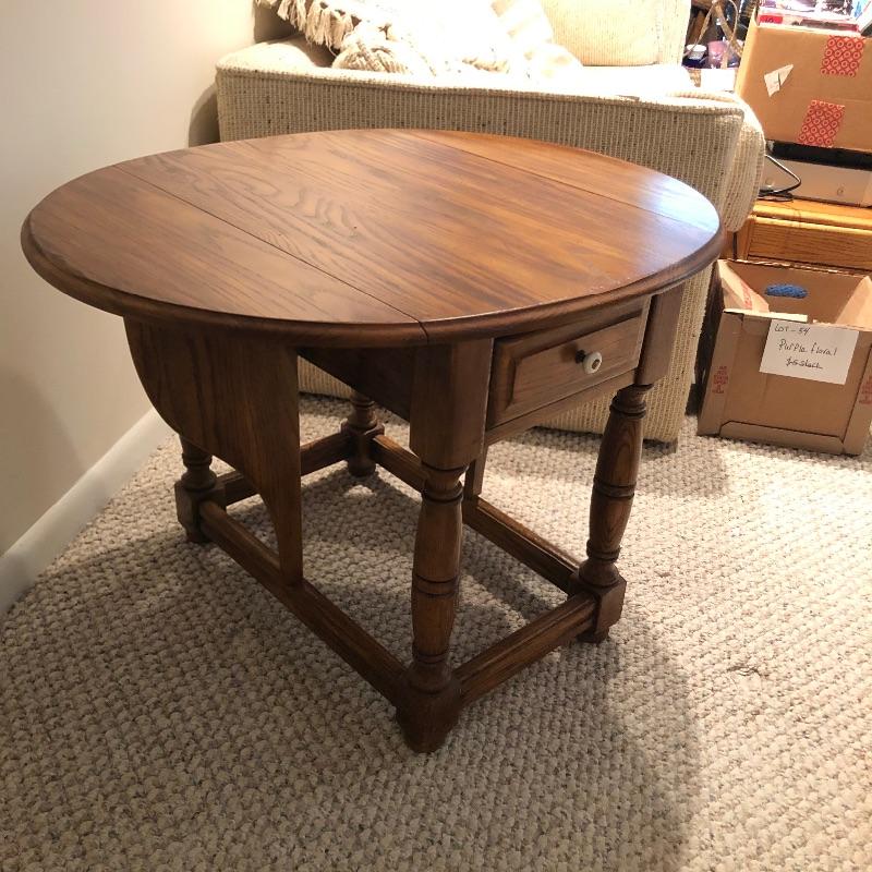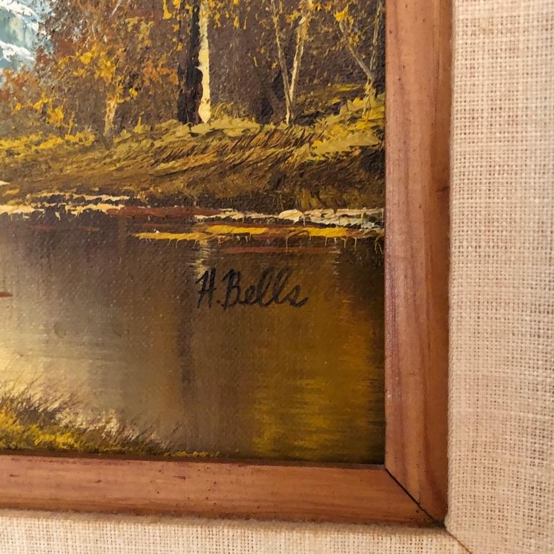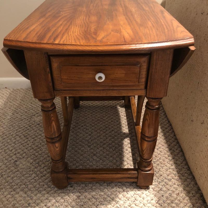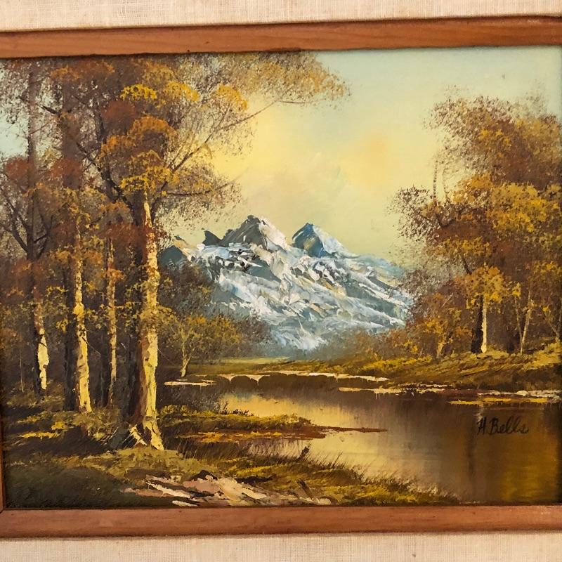 Add country charm and versatility to your space with this cute small table that expands to a good size. This wood table comes with one drawer. We paired this with a wood framed oil landscape painting by H. Bells that measures 17” x 18”.