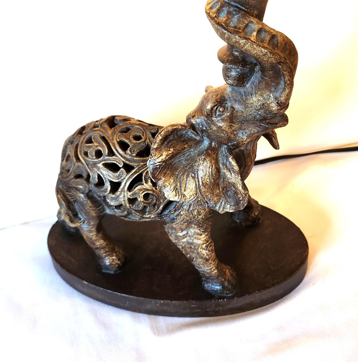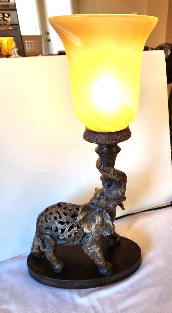 Figural "Trunk Up" Elephant table lamp - switch on cord - good working condition 22.5" tall. Glass Shade.