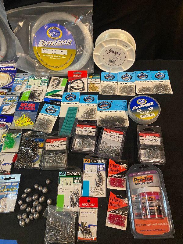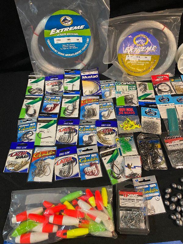 Large lot of fishing gear including weights, beads, jig heads, fishing line, hooks, loop protector, split rings, foam peg floats and more.