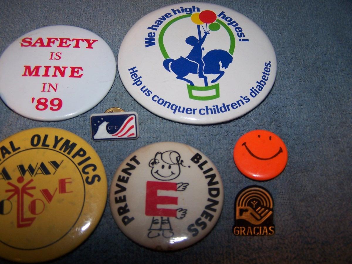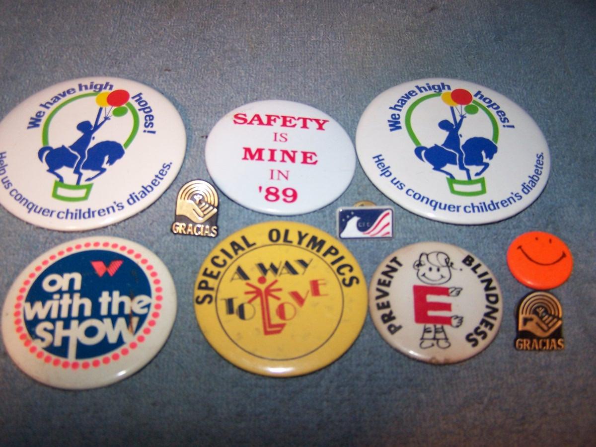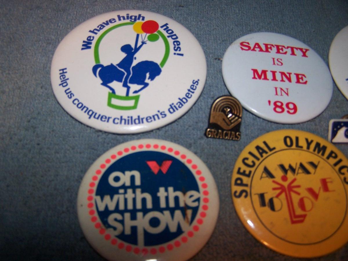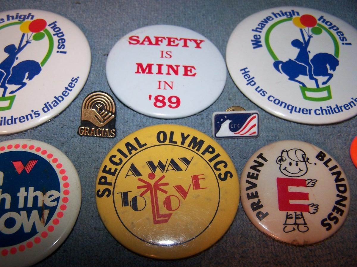 GREAT COLLECTION OF PINS/PINBACKS---SPECIAL OLYMPICS, DIABETES... SOME SPOTS AND LIGHT WEAR...