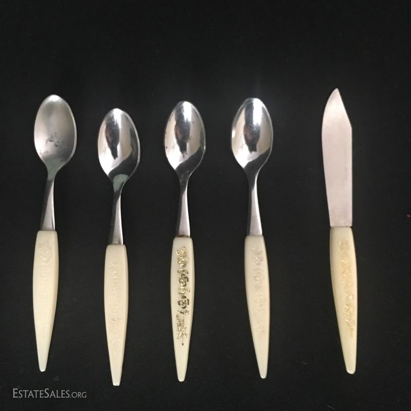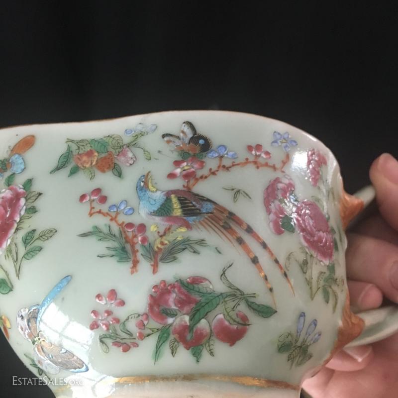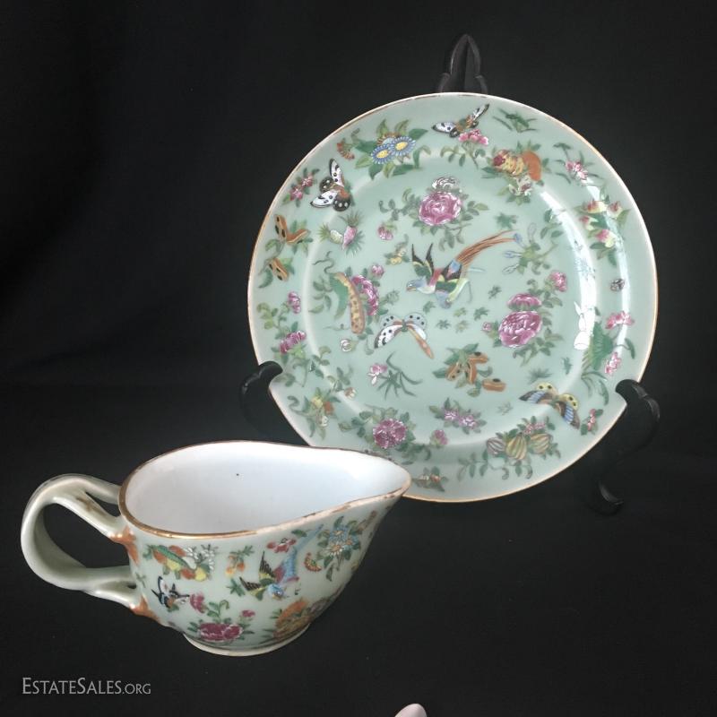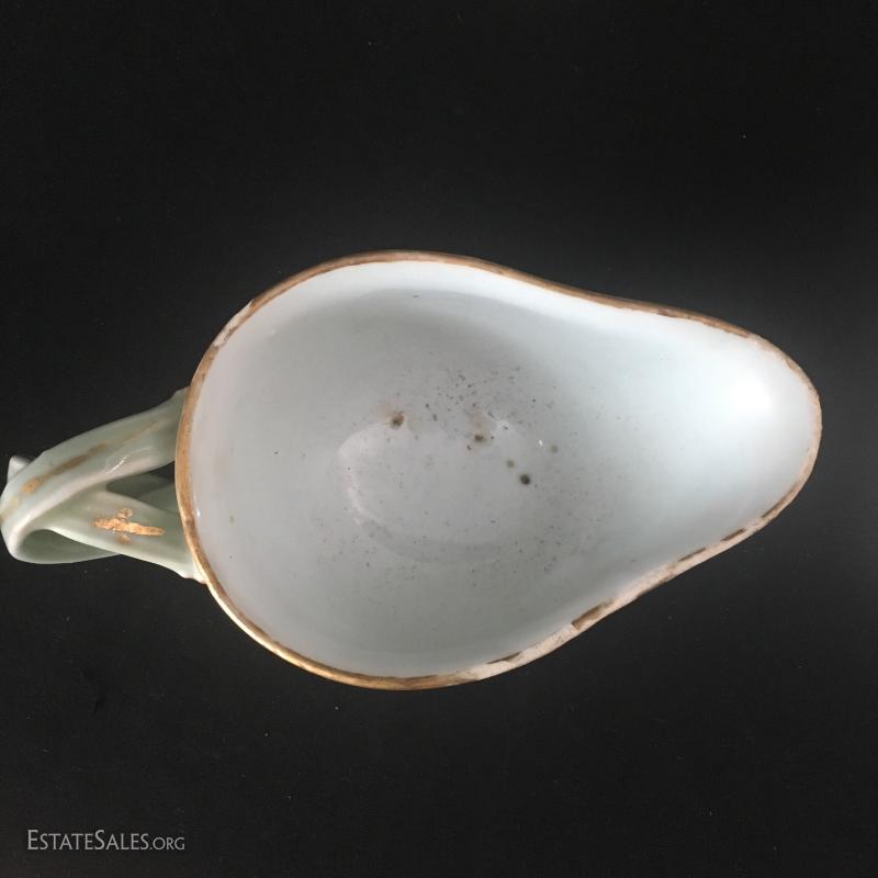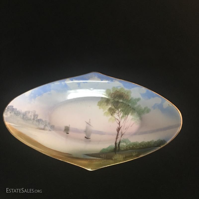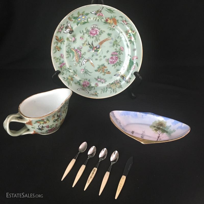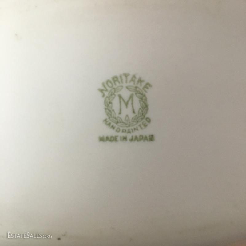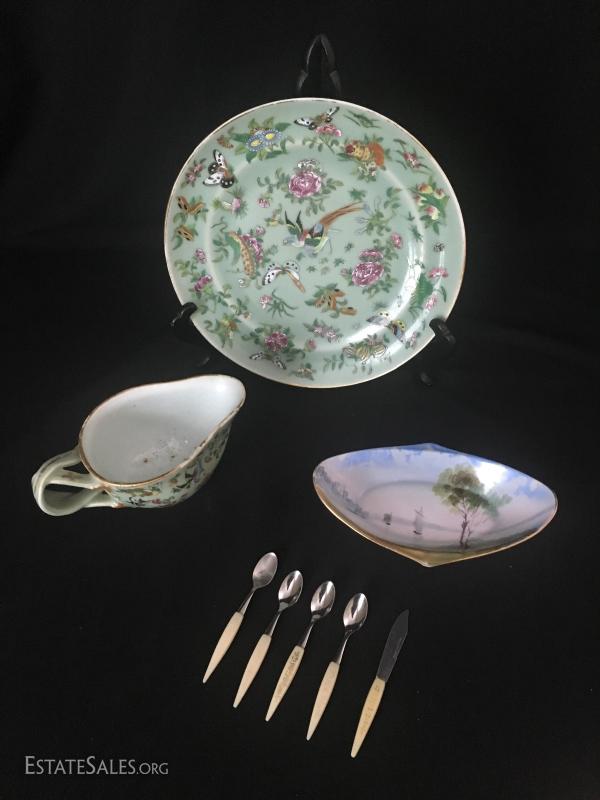 Green plate and matching creamer are heavy china with raised painted details. No markings visible. Small Noritake dish is hand-pained. Set of small serving pieces have plastic handles with gold worn off of most. This lot is available for shipping or local pick up in Asheville, NC.