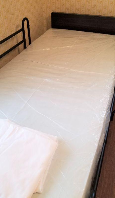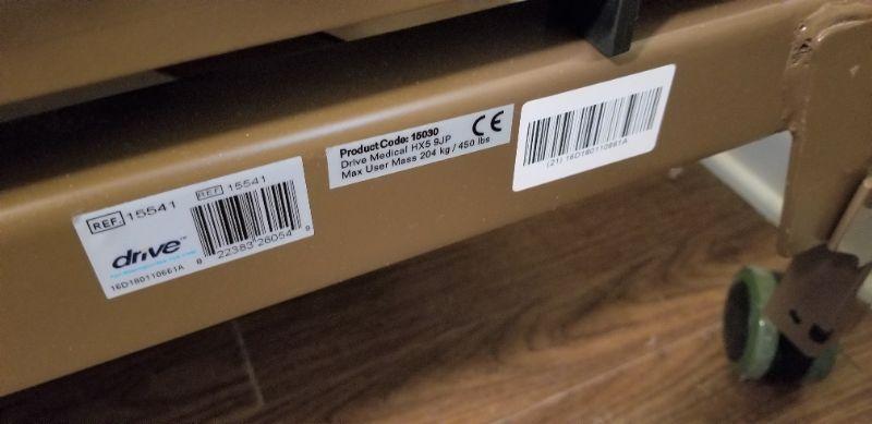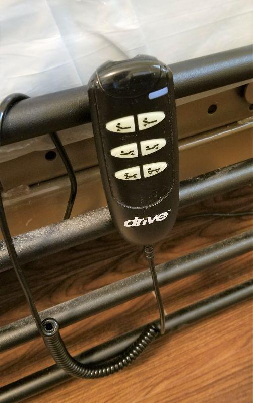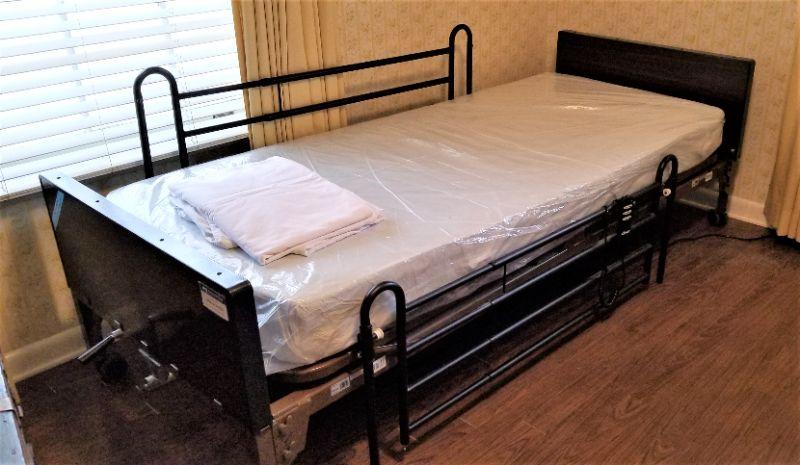 Nice, fully adjustable hospital bed - comes with fitted and top sheets. Adjustable rails. Bed works with hand control and manually via lever at footboard. Mattress still covered with plastic - super clean. 87.5" long x 36" wide. Model number, etc in photos.