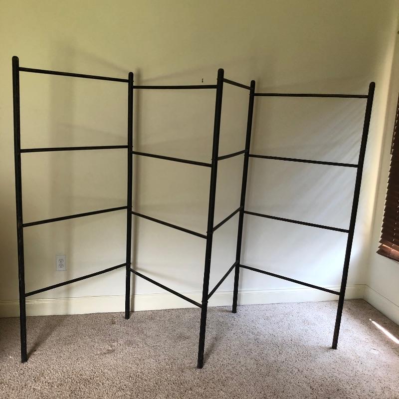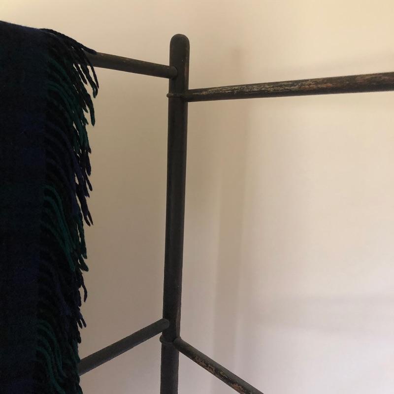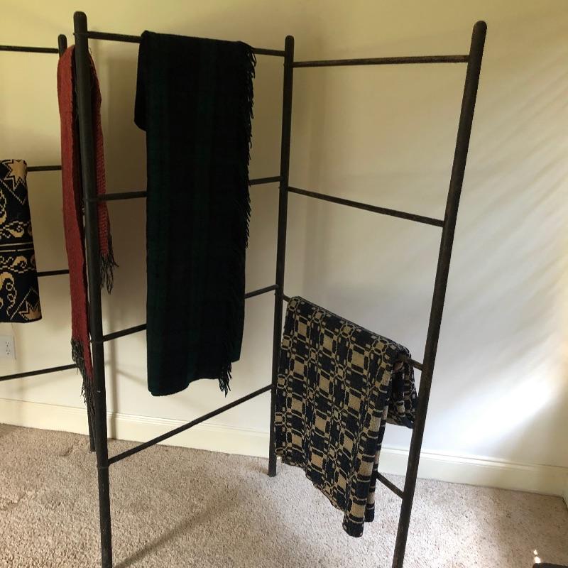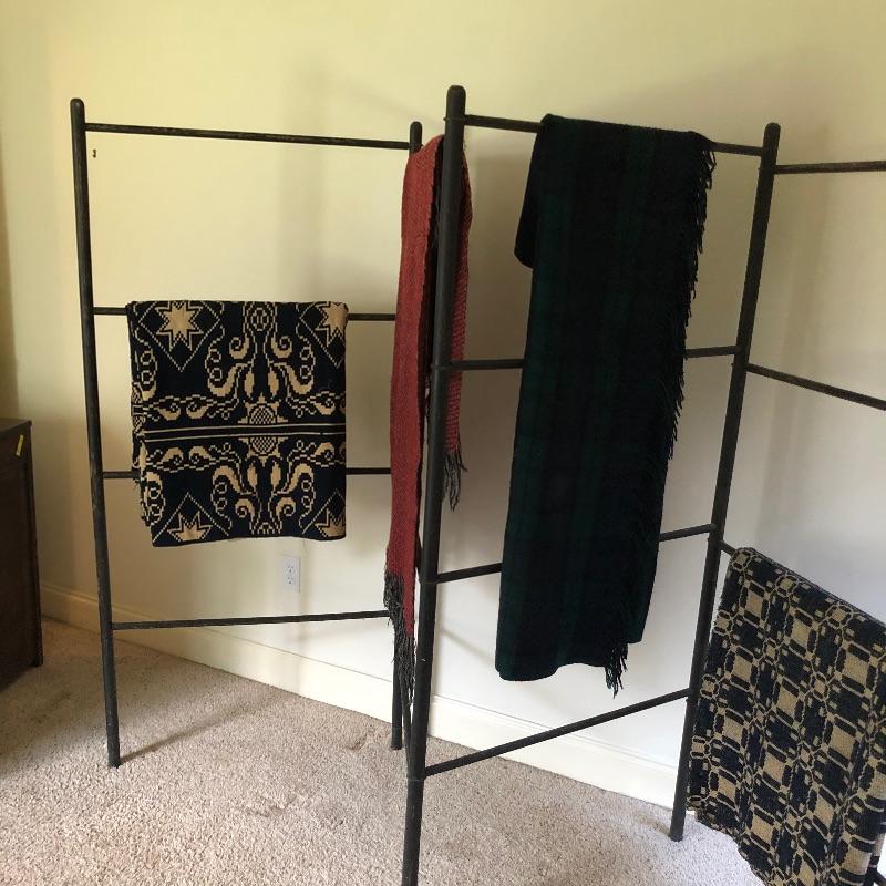 This is the largest quilt rack we have ever seen! This unique vintage find measures a whopping 128” wide x 68.5 “ tall. It can be folded to be as small or as large as you'd like. Hang towels, table linens, quilts...you name it. Great antique find! This lot only includes the rack -everything hanging from it can be found in other lots in this auction.
