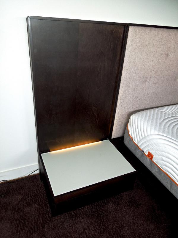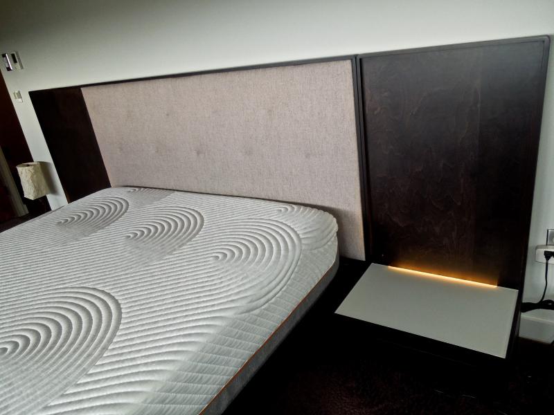 WIDTH : 111.5" / 129" HEIGHT : 44" DEPTH : 85" Stunning modern contemporary design by Joel Dupras for Huppe "Surface" collection. Headboard is upholstered tufted linen blend with side extensions, 1 drawer night table with integrated led lights on either side. Acid etched lacquered glass top on nightstands. Mattress is available at no charge if bed is purchased. Mattress shows no wear and is protected by a beautiful zippered outer quilted cover. Original receipts and specs provided. Complete package retails for over $5000.