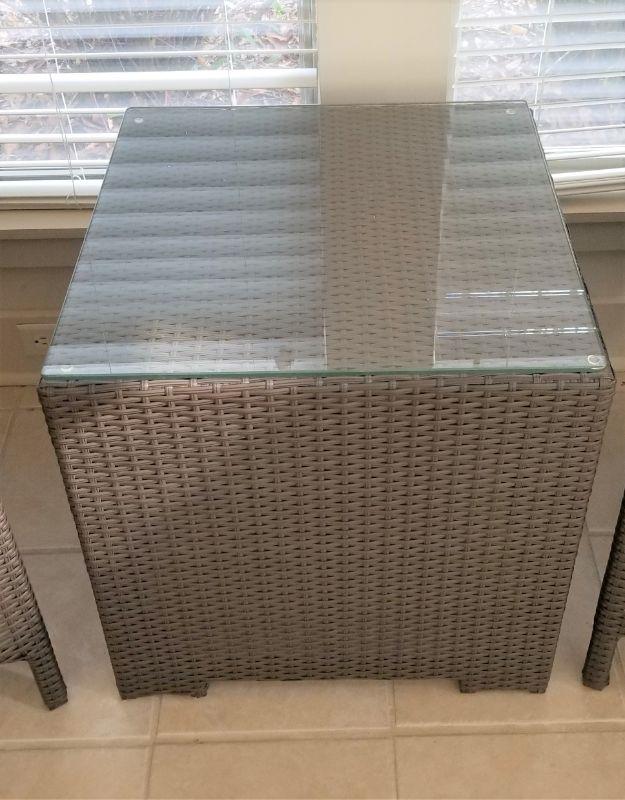 This set matches the pieces sold in lot #60. Two armchairs with glass topped table. Like new condition. Chairs measure 22" wide, 21.5" deep, 36" tall. Table is 21.5" x 21.5" and 22.5" tall. These have been kept indoors.