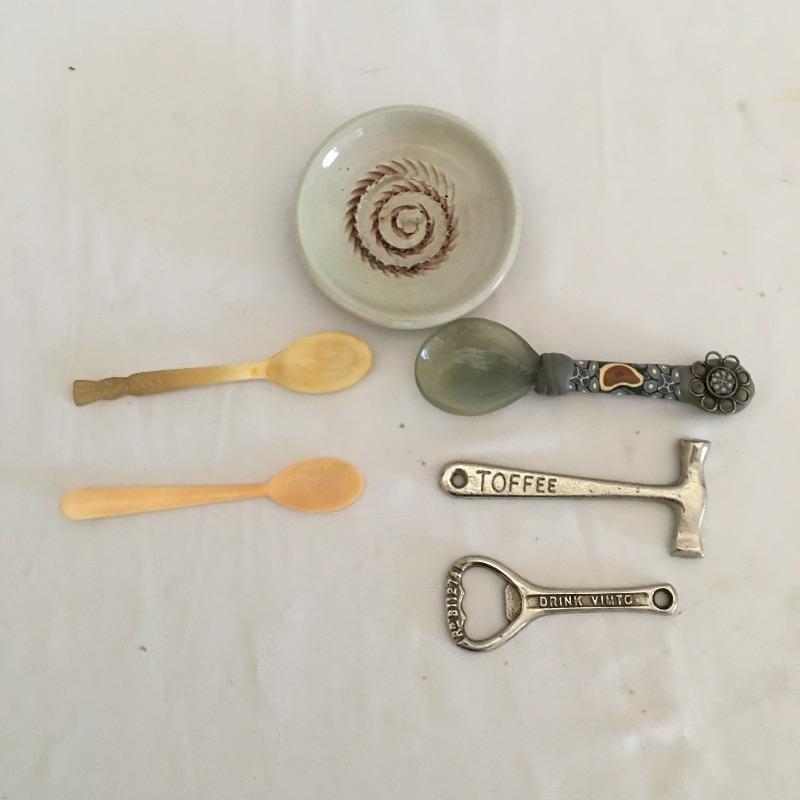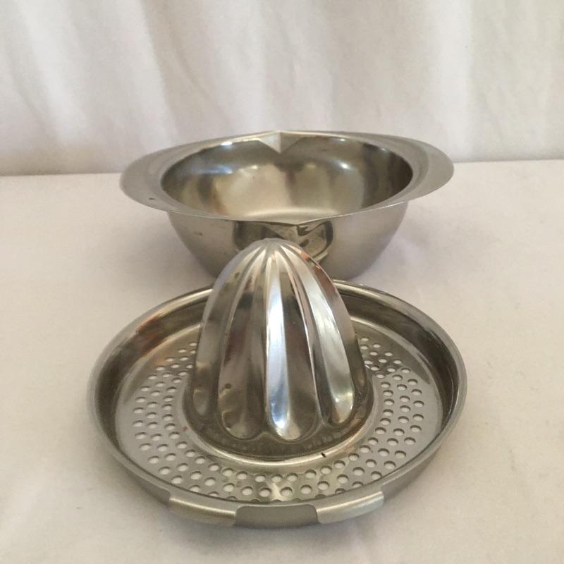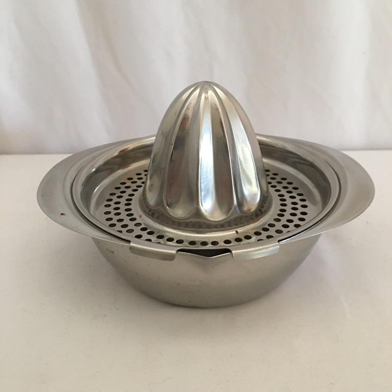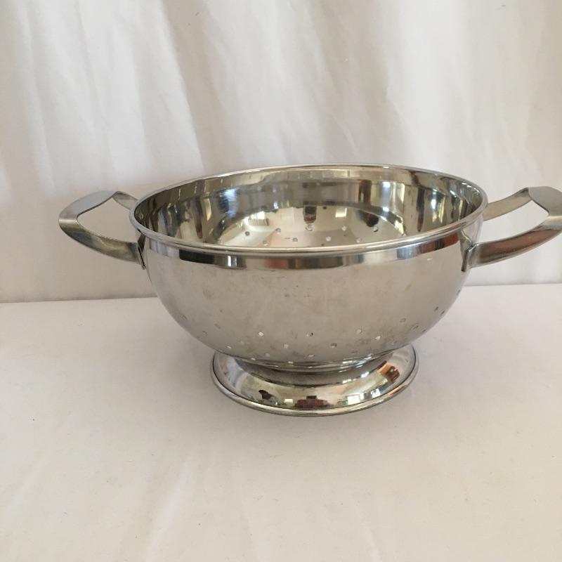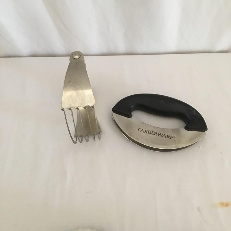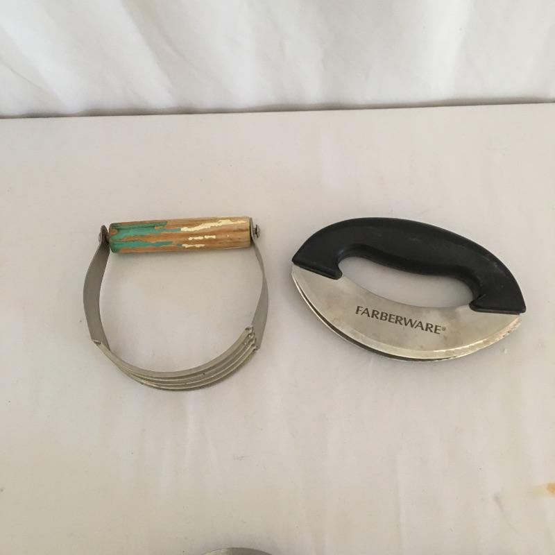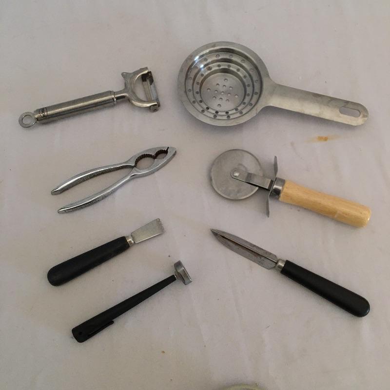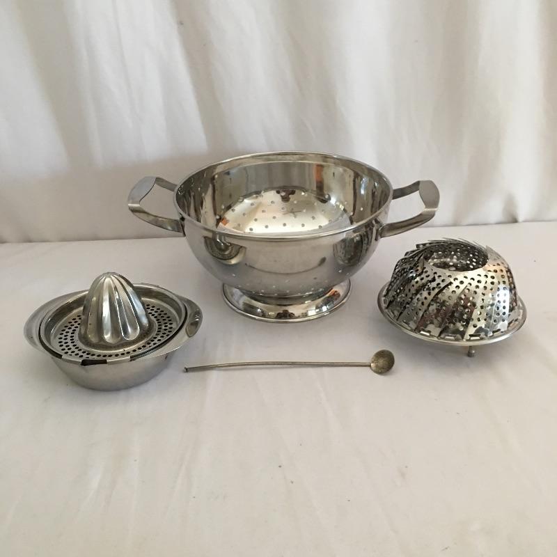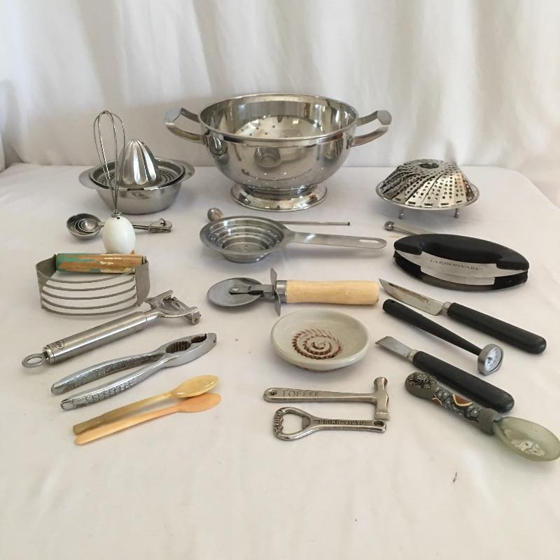 Fun and functional! Kitchen utensils including colander, juicer, thermometer, peeler, bottle opener, pizza cutter, steamer, measuring spoons and more. Get most of the utensils you need in one place. Colander measures 9”D.