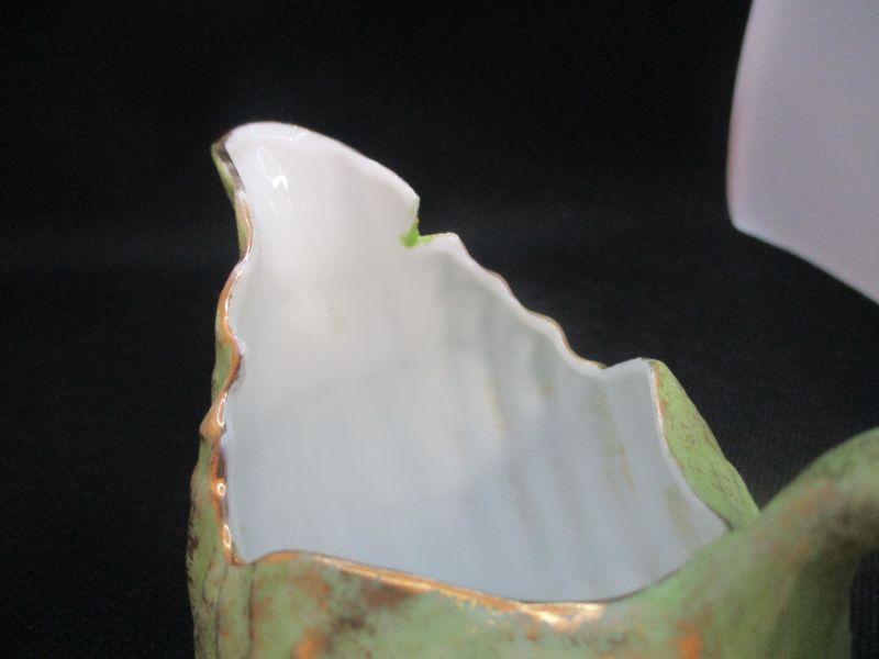 These are in excellent condition with no chips or cracks found, There is an imperfection on the spout of the creamer that was fixed prior to painting, but it is a flaw rather than damage. They are a lime green color with gold highlights. The spout on the creamer is about 3.25" tall.